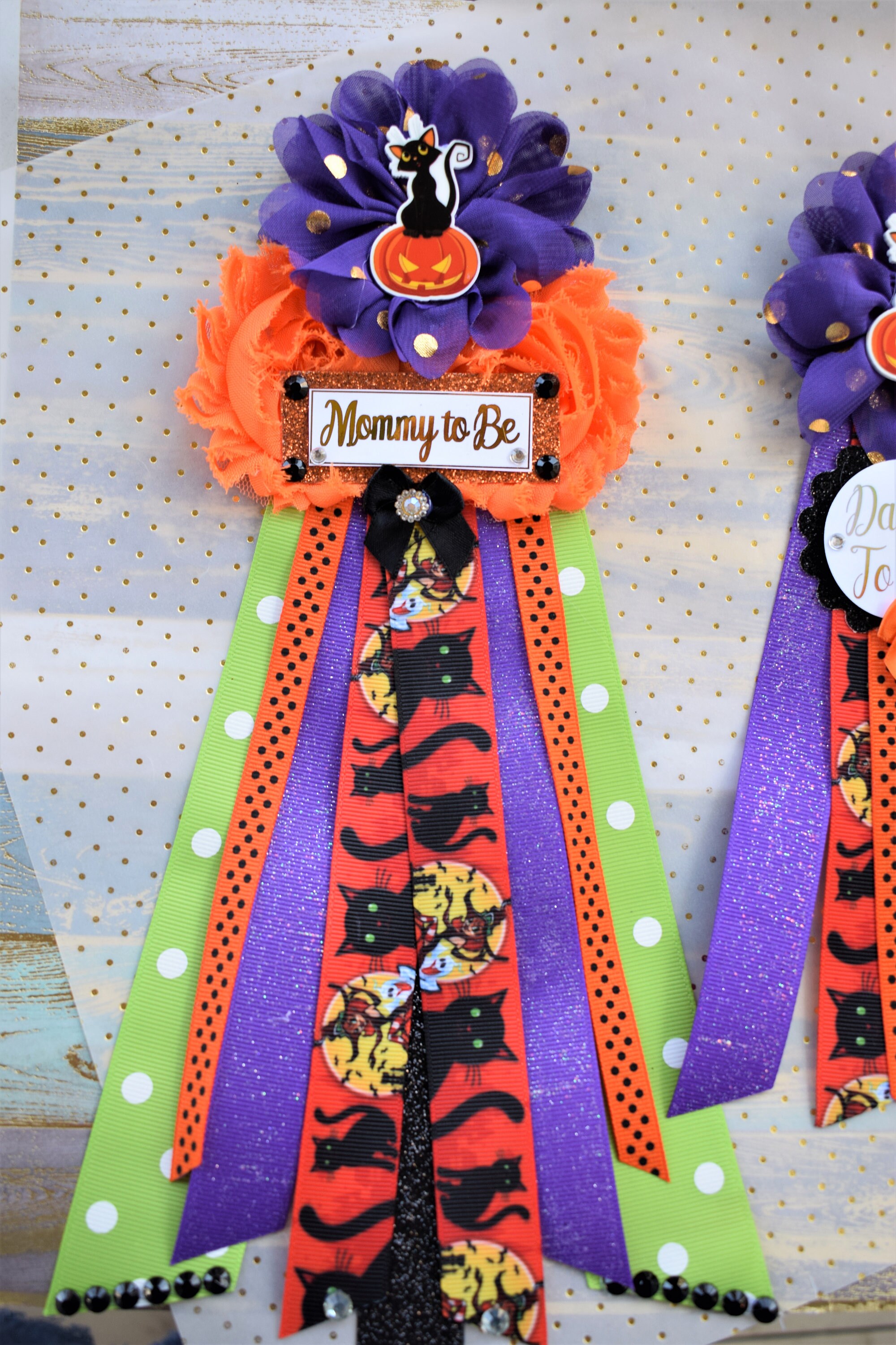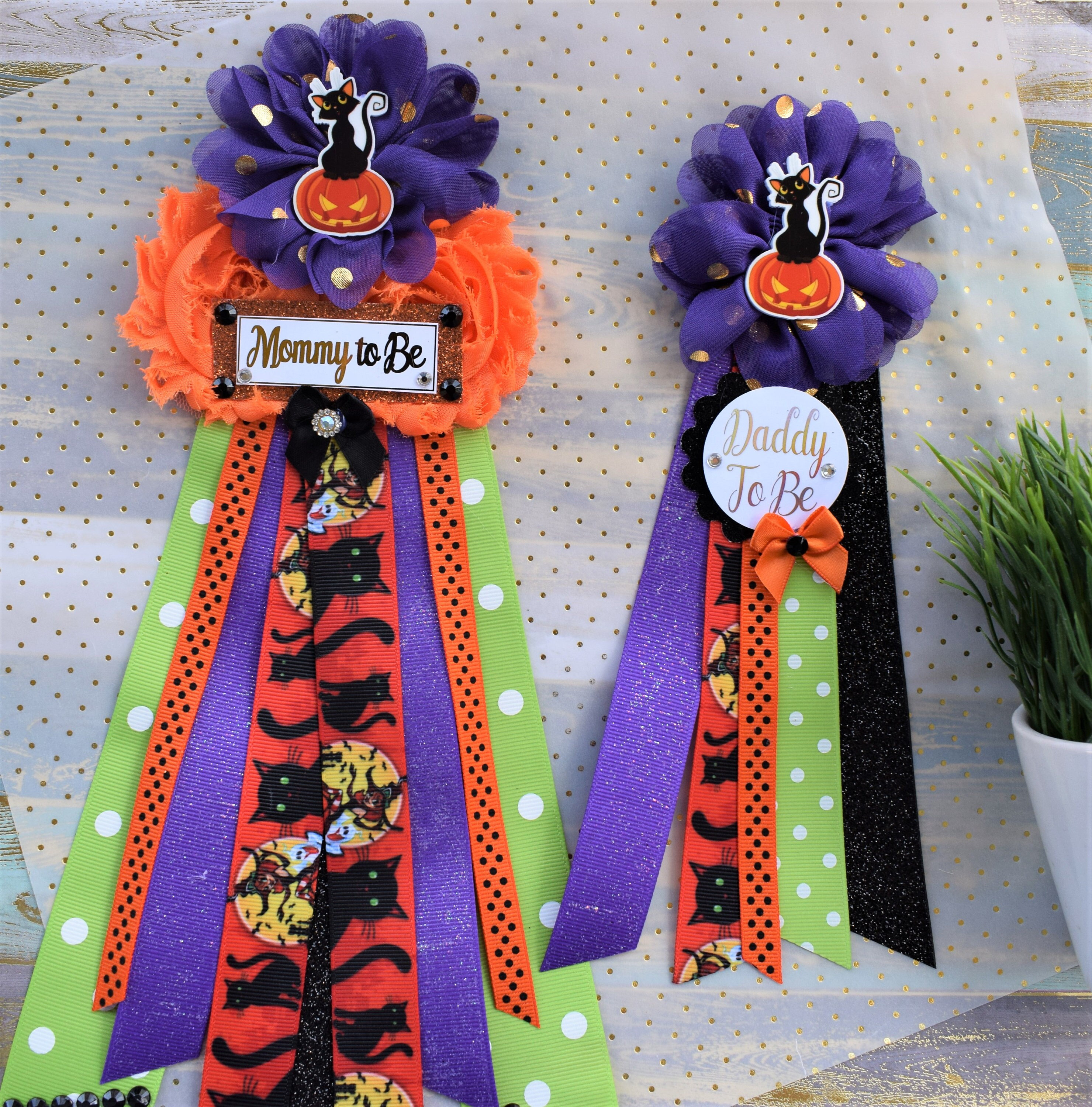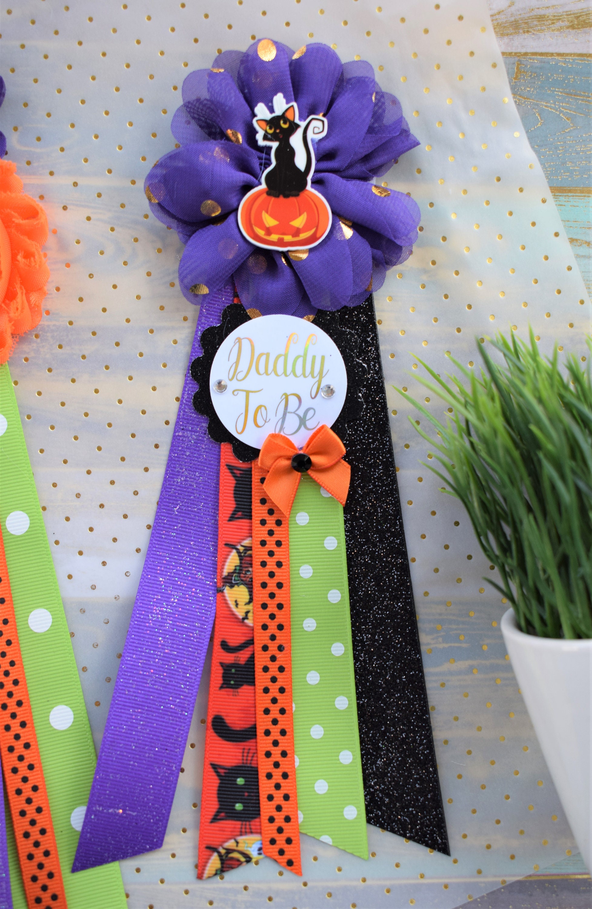 Halloween Baby Shower, Cat Orange Green, Purple, Black Maternity Pins, Halloween Corsage Pins, Mommy To Be and Daddy To Be Pins, Halloween