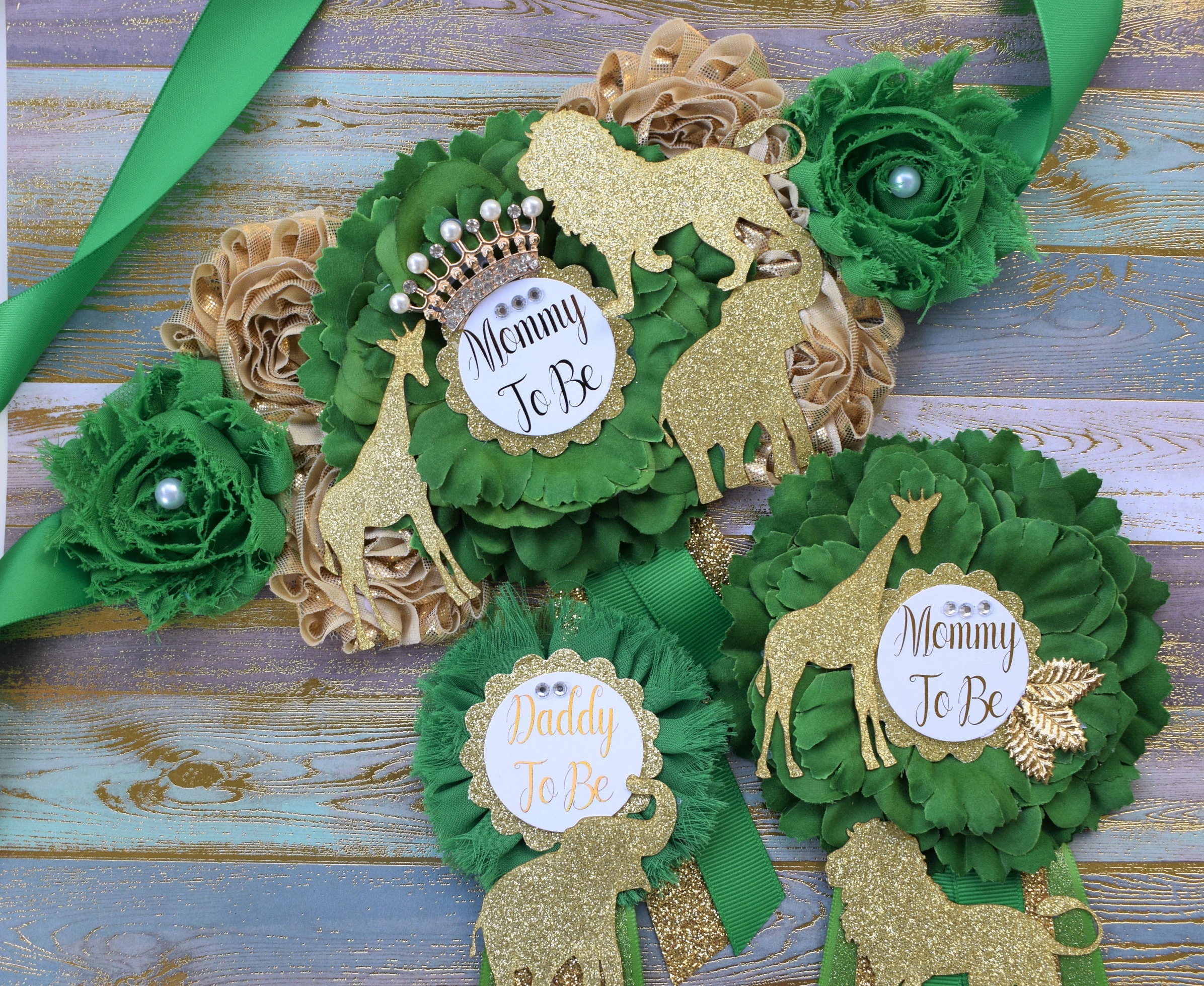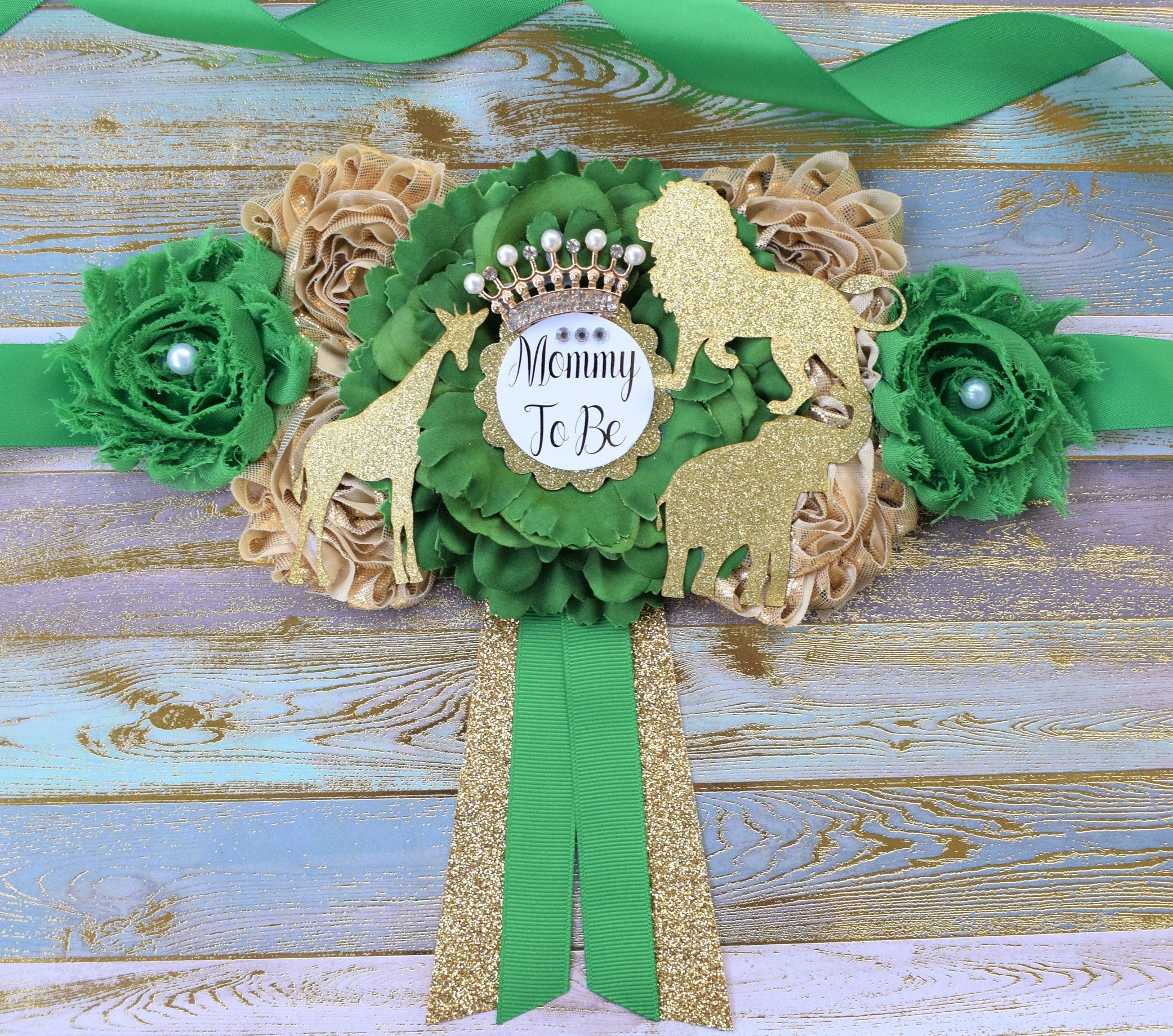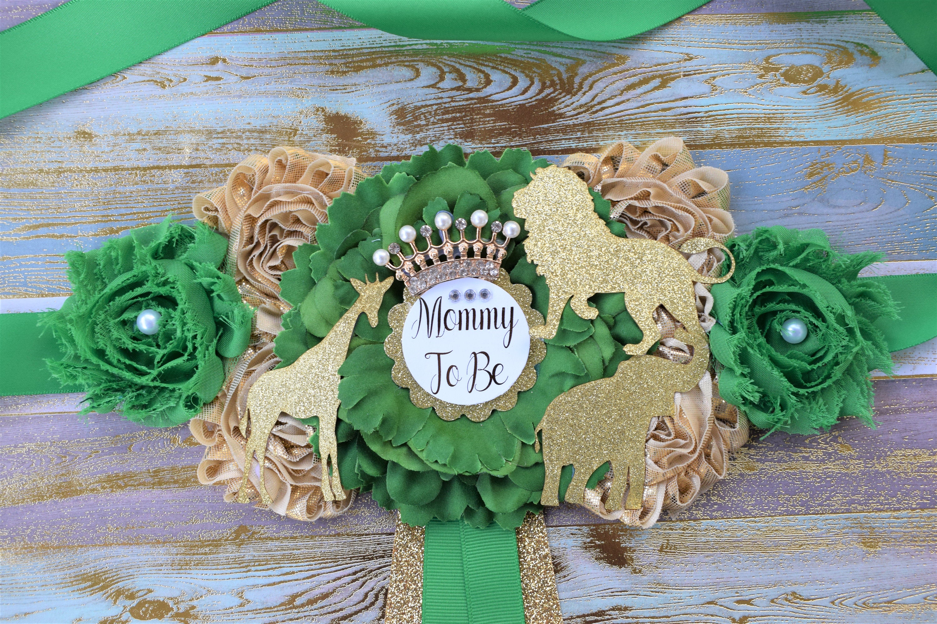 Safari Green Gold Flower Sash, Gold Safari Animals, Greenery Gold Maternity Sash, Jungle Safari Green Gold Baby Shower, Mommy pin, Daddy pin