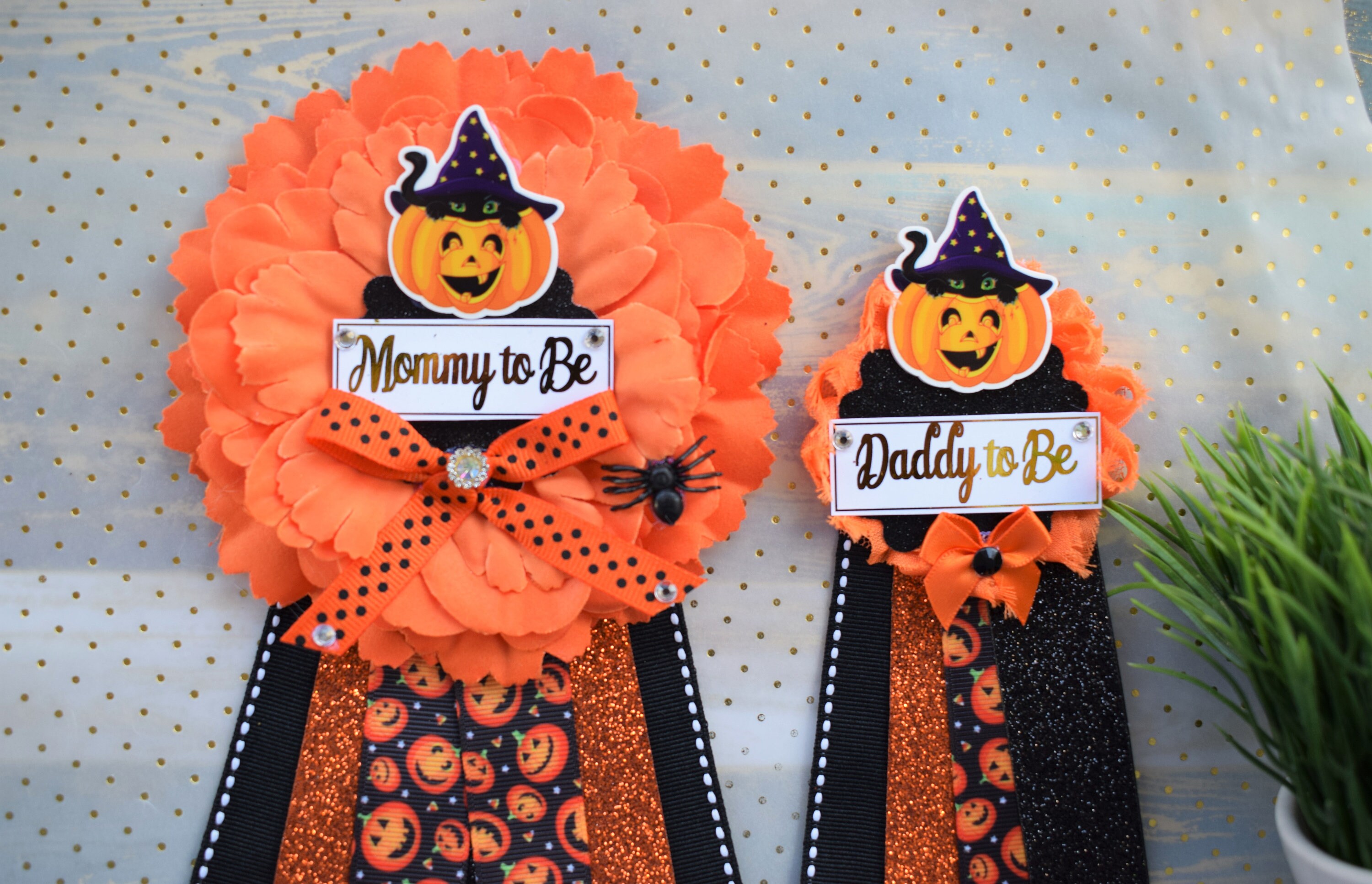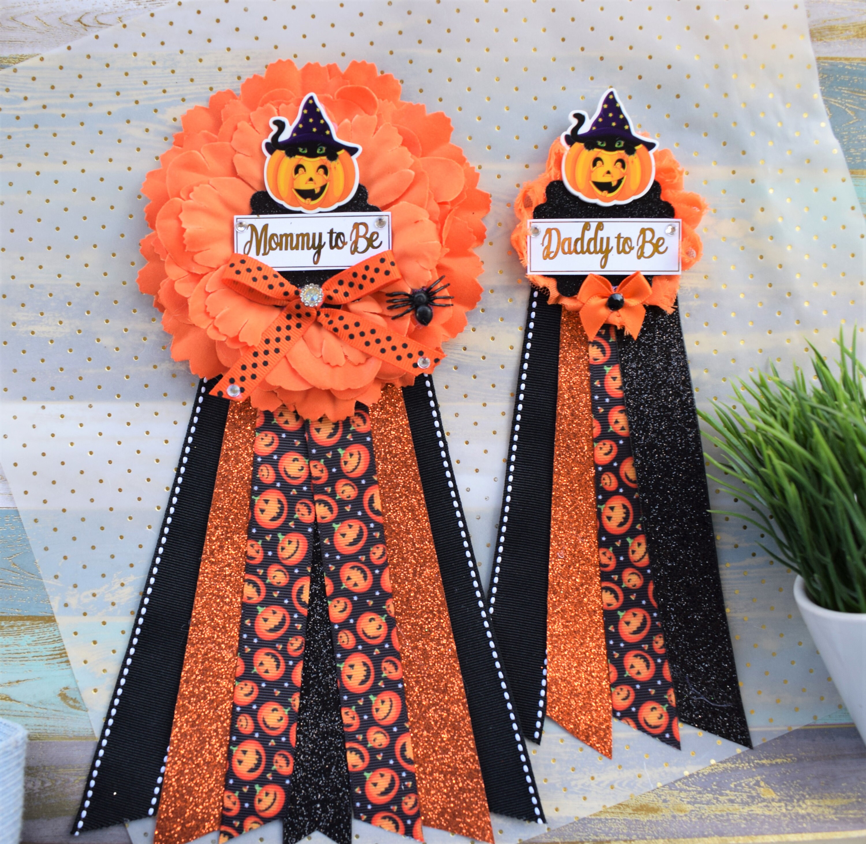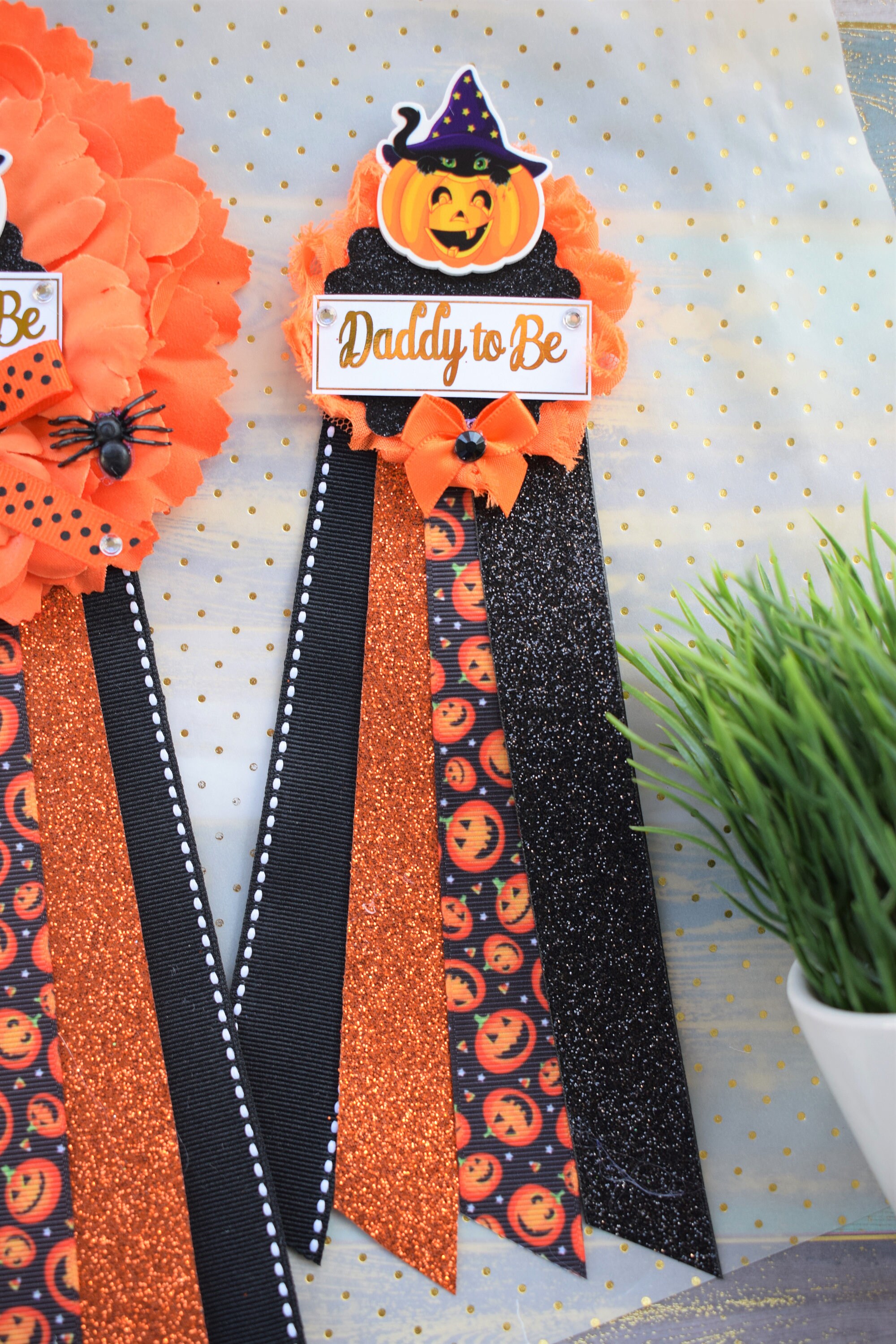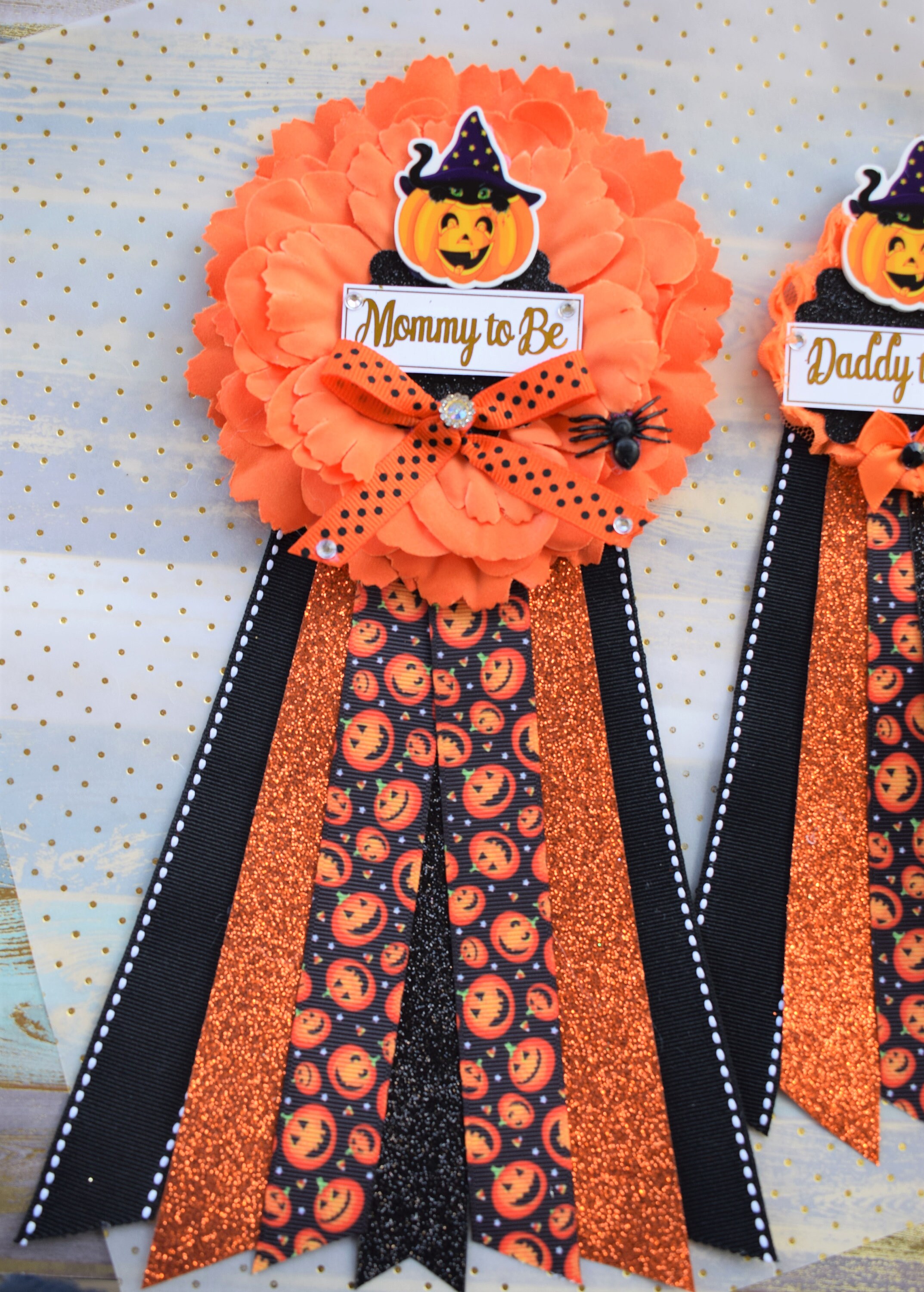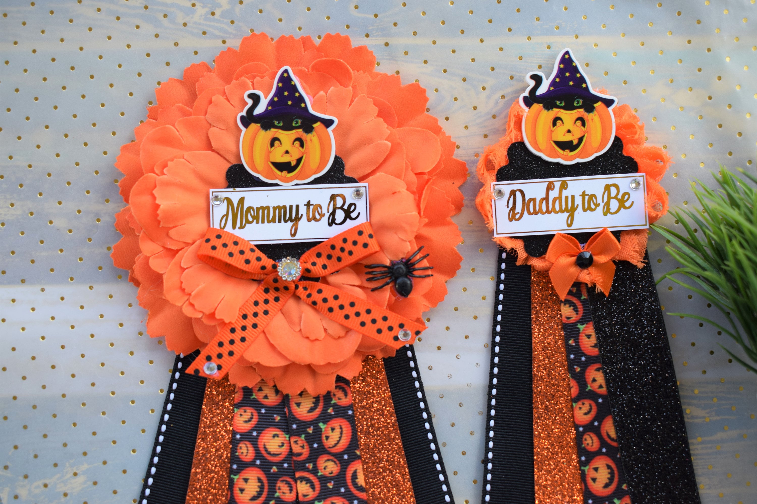 Pumpkin Baby Shower, Halloween Baby Shower, Pumpkin Orange Black Mommy To Be Pin, Halloween Corsage Pin, Pumpkin Daddy To Be Pins, Halloween
