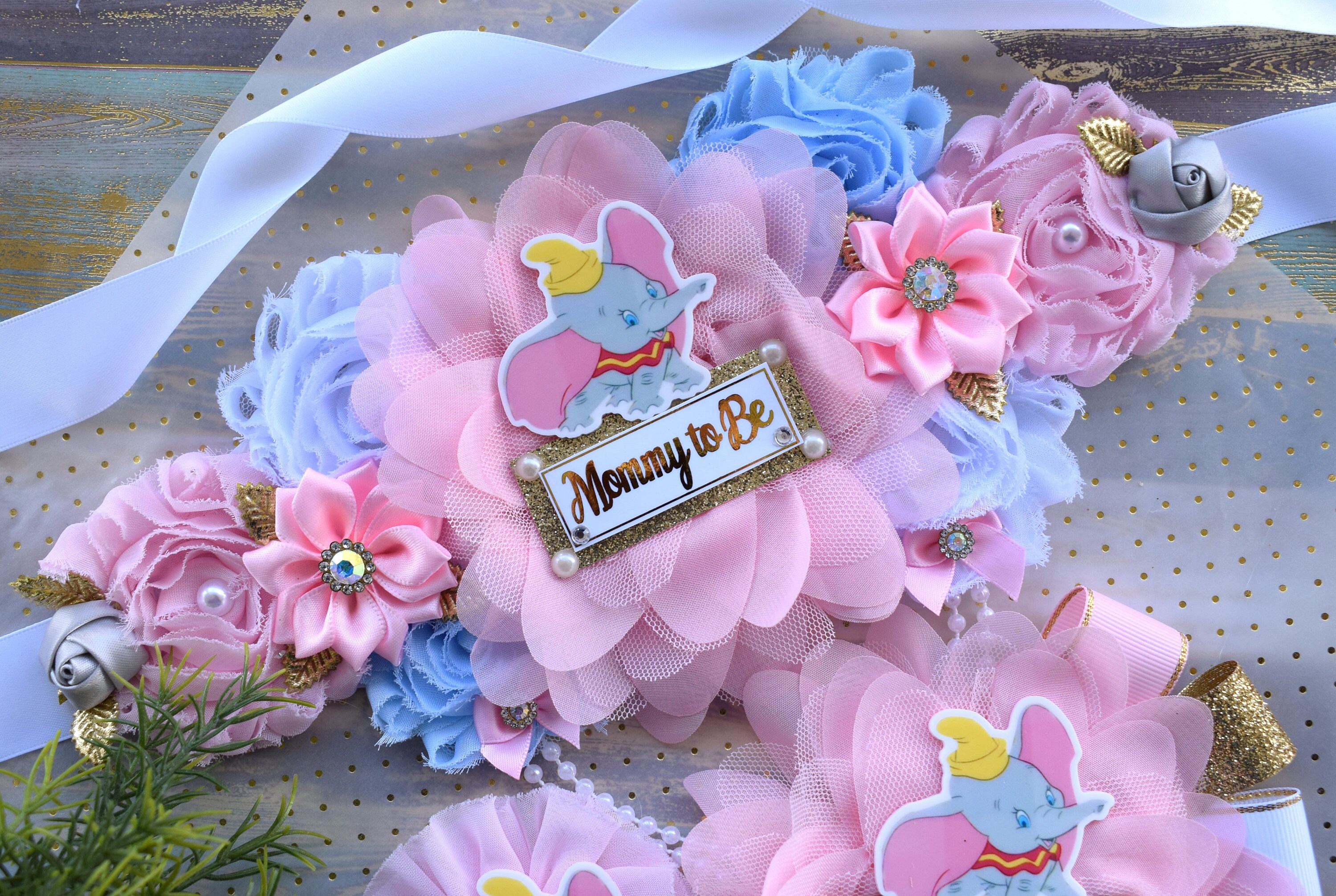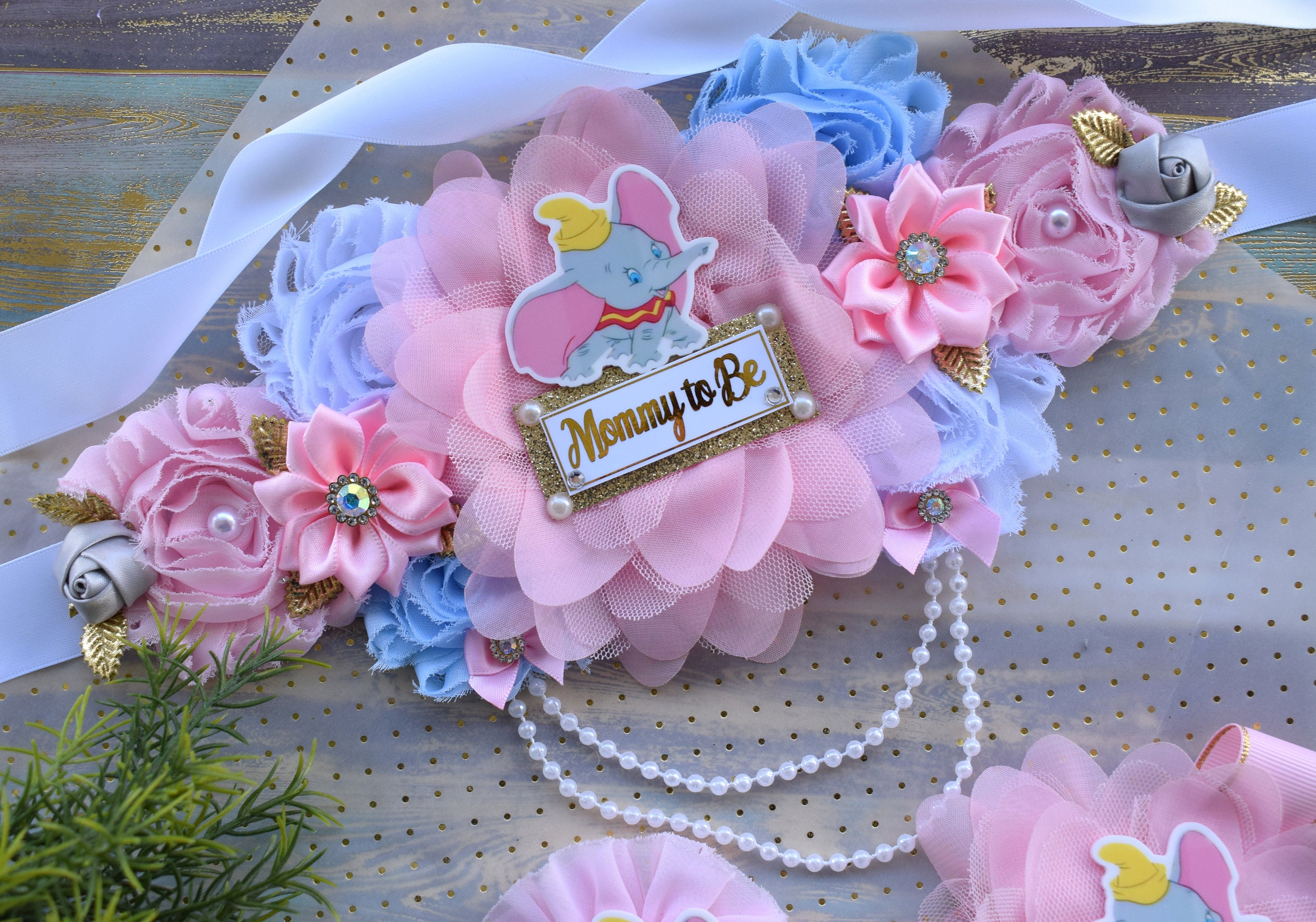 * Maternity Sash: It has eleven beautiful flowers in Light Pink, Light Blue, White & Grey colors embellished with rhinestones and pearls. The ribbon sash is 80'' (2 meters) long.