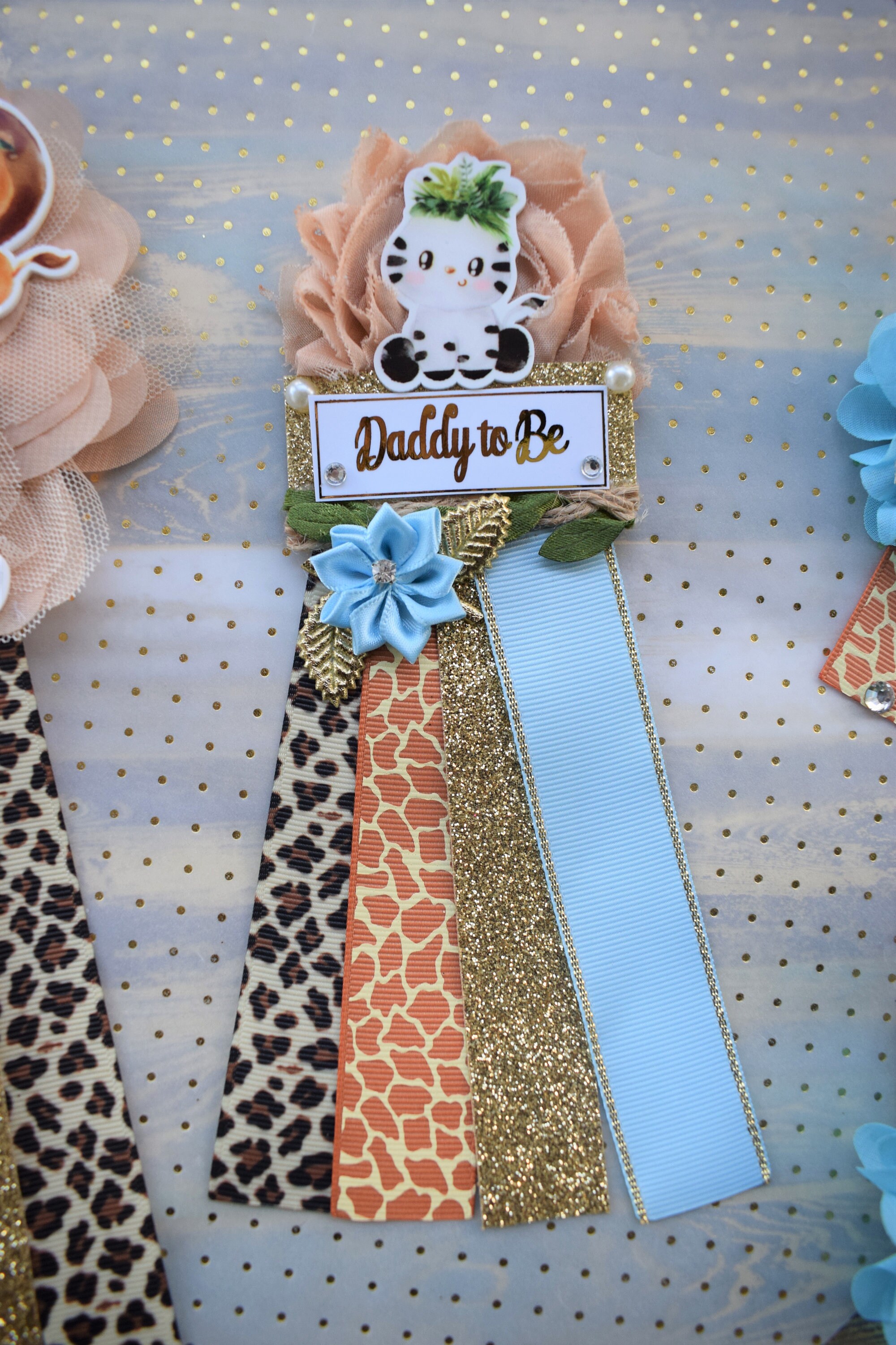 ☆ Maternity Sash: This has eleven flowers in safari theme colors embellished with rhinestones and pearls. Additionally, this sash is decorated with safari animals. The ribbon sash is 80'' (2 meters) long.
