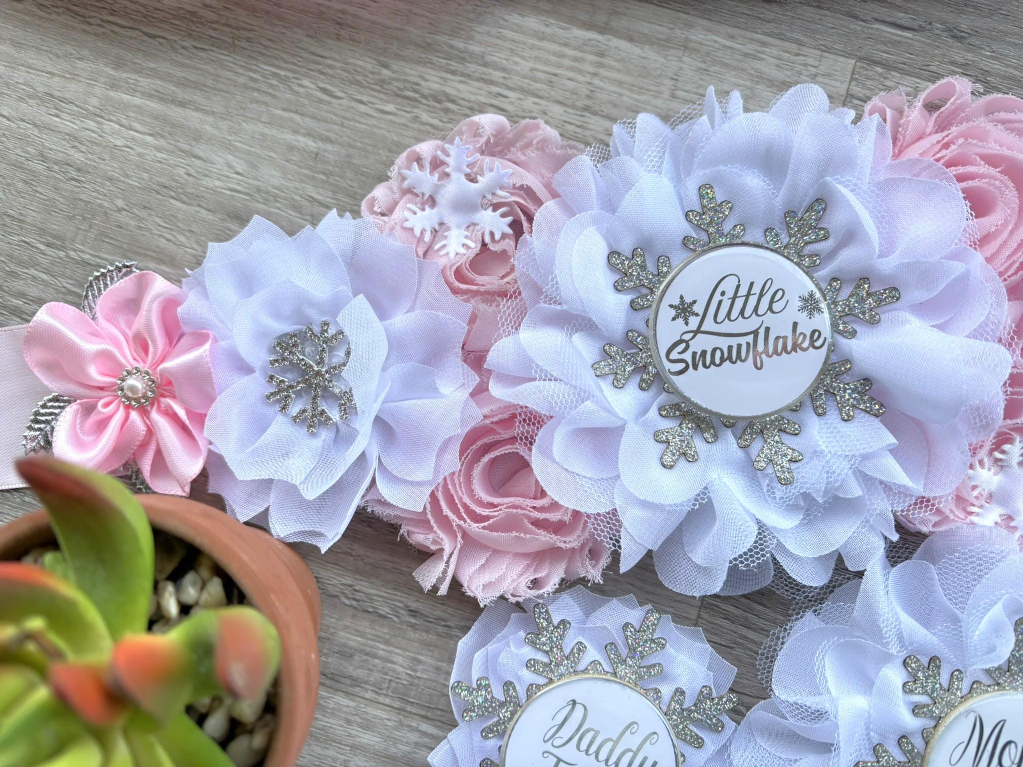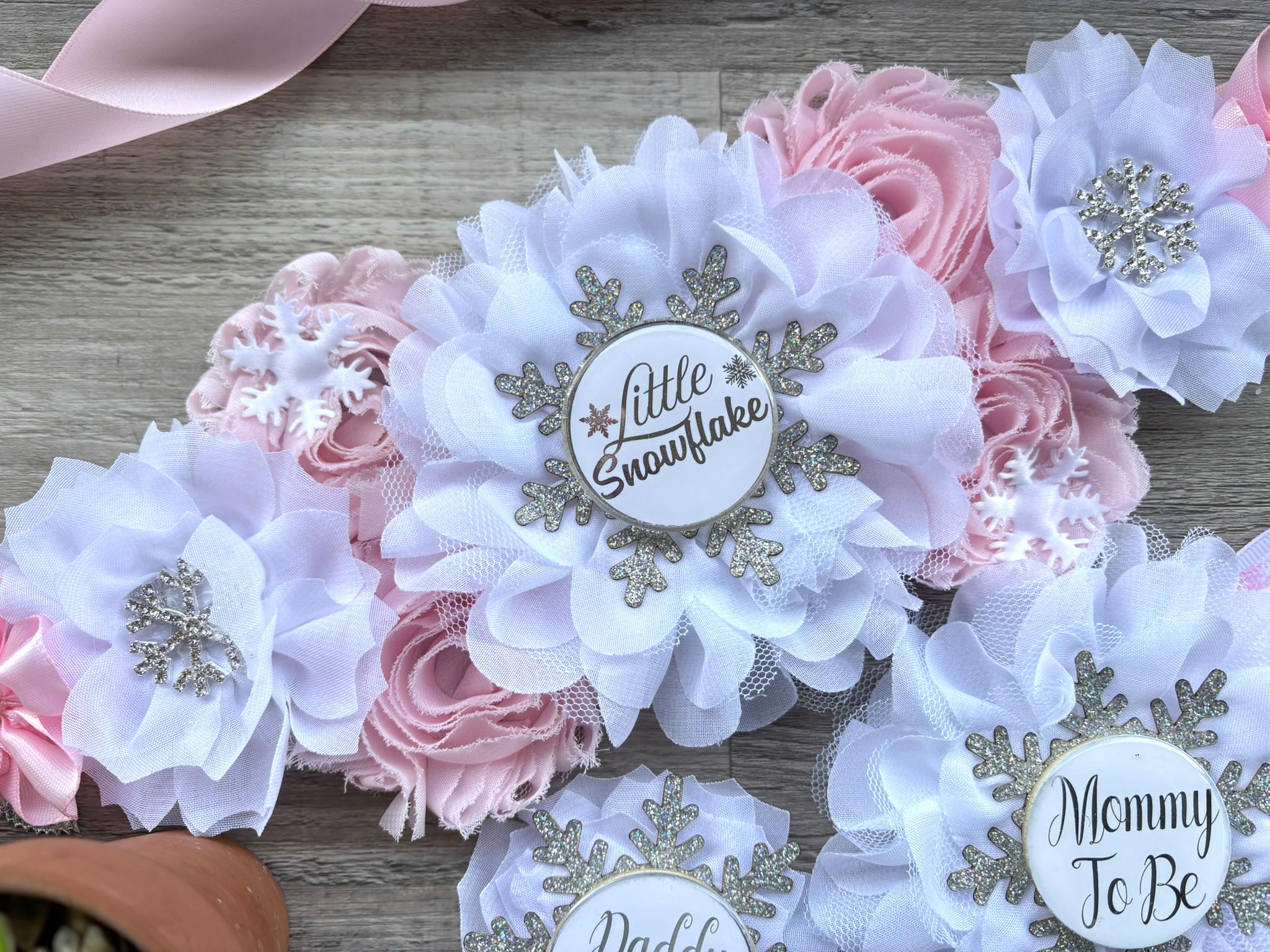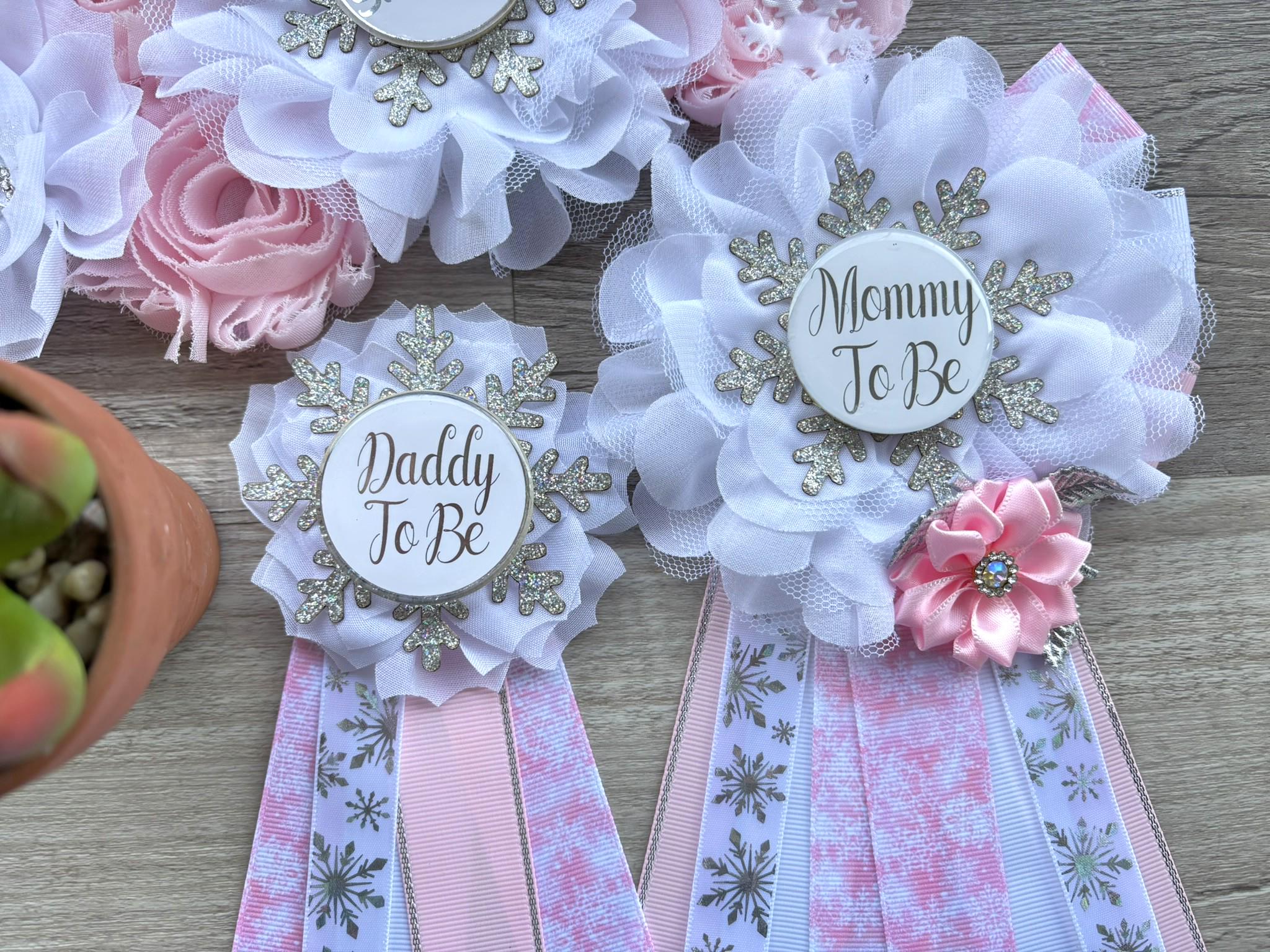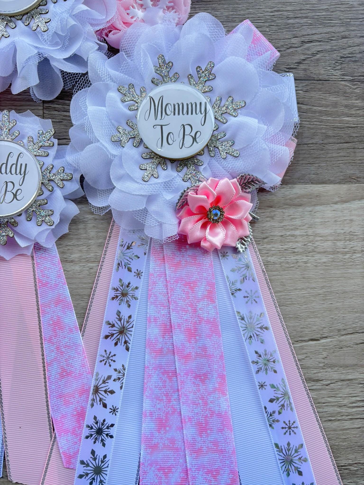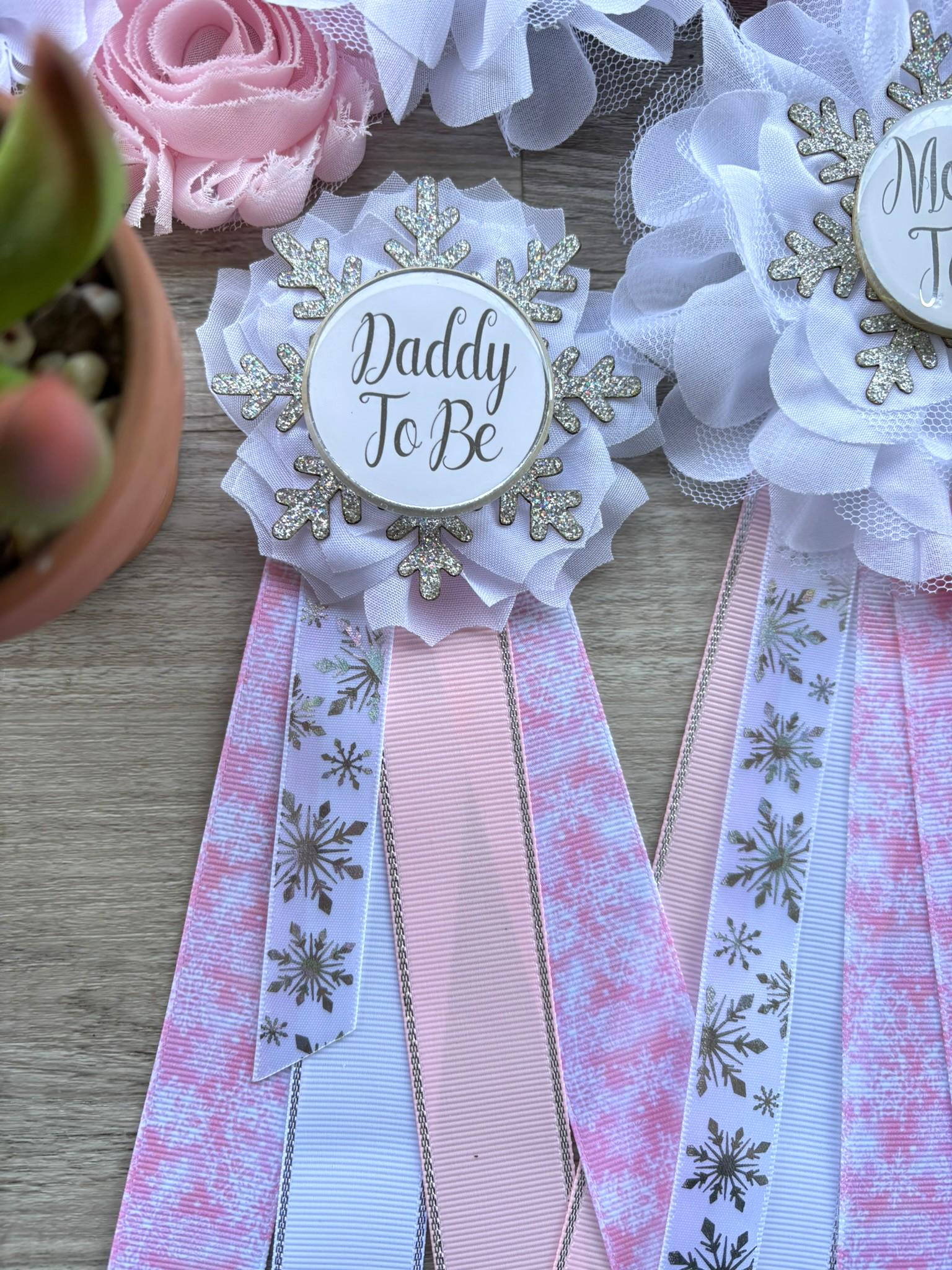 Pink Snowflake Baby Shower Set, Pink White Maternity Sash, Snowflake Mommy To Be Pin, Daddy To Be Pin, Custom Order Welcome