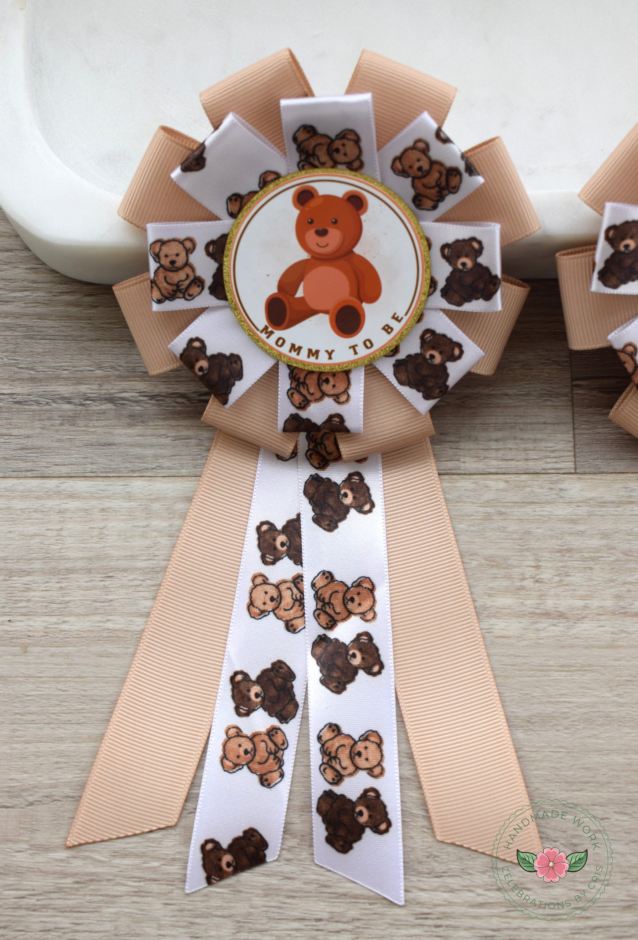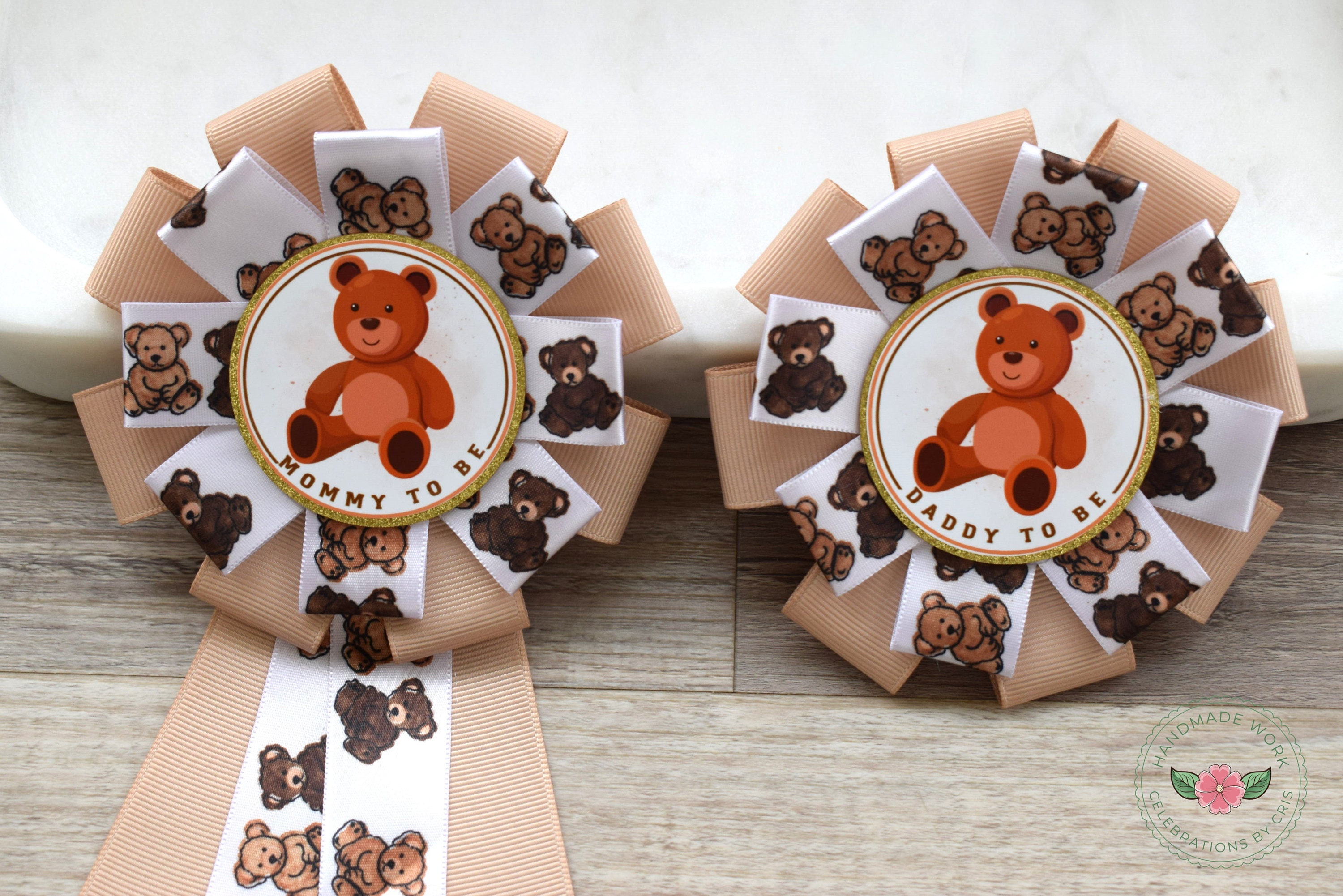 Neutral Teddy Bear Baby Shower, Bear Mommy To Be Ribbon Pin, Teddy Bear Daddy To Be Pin