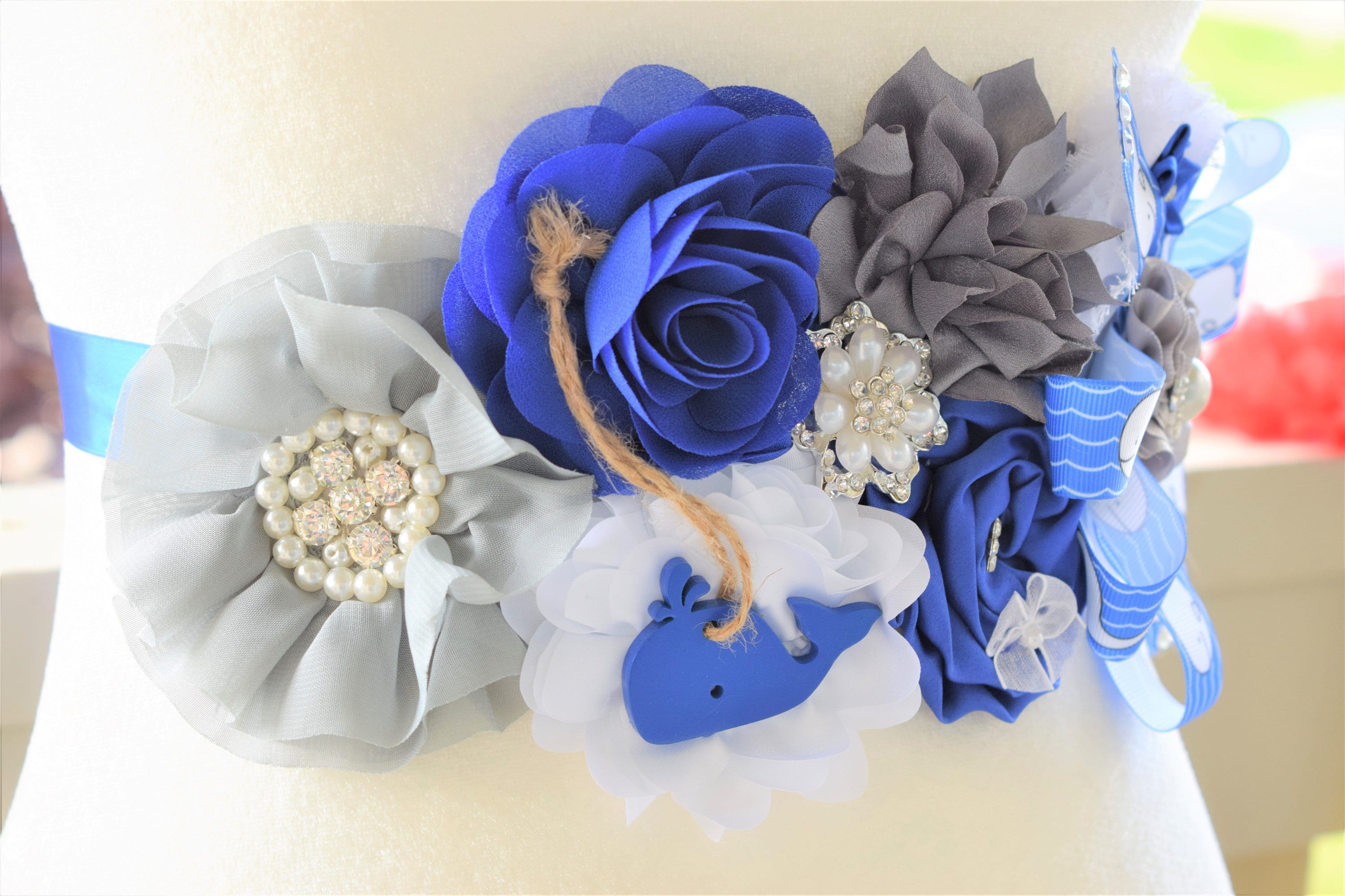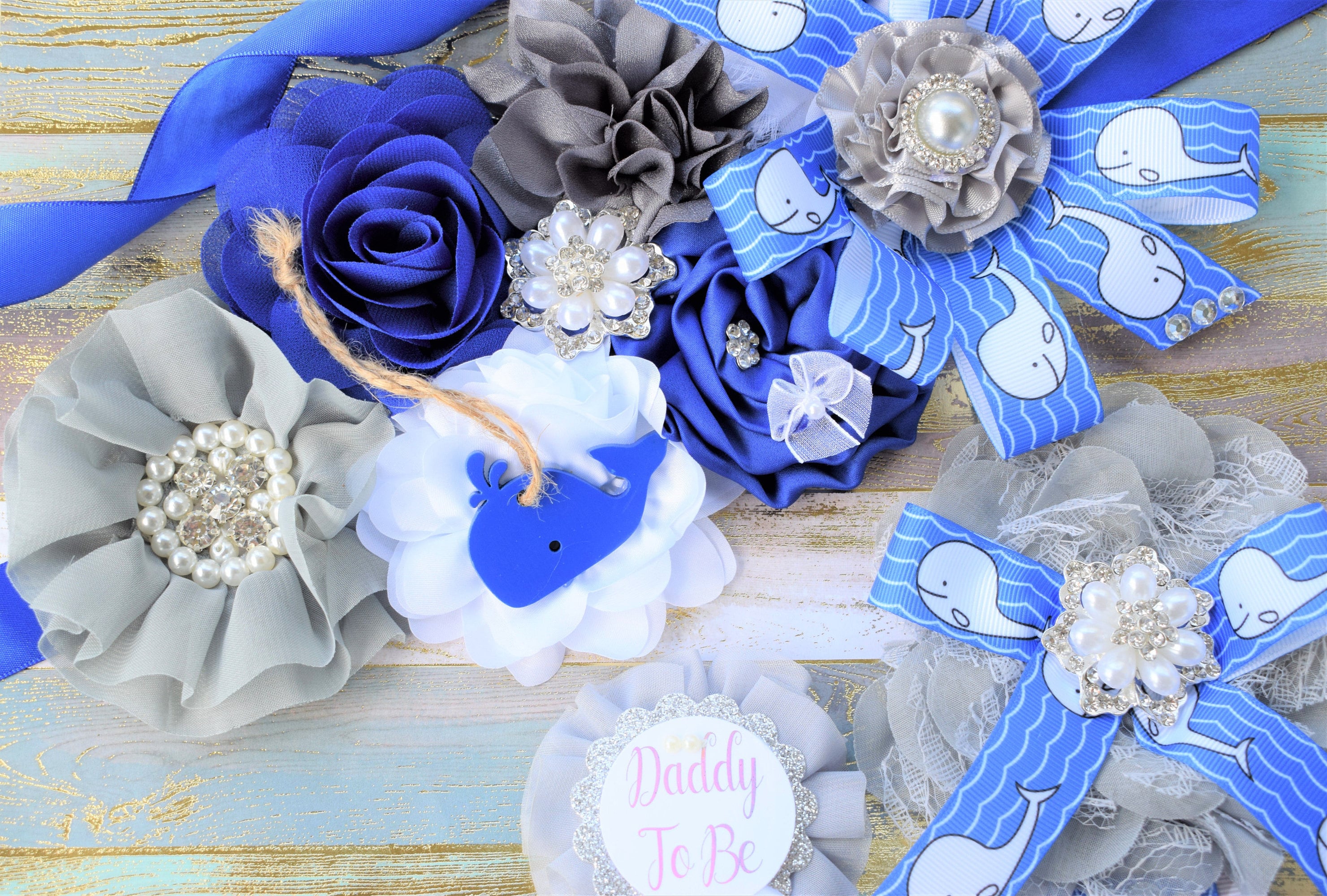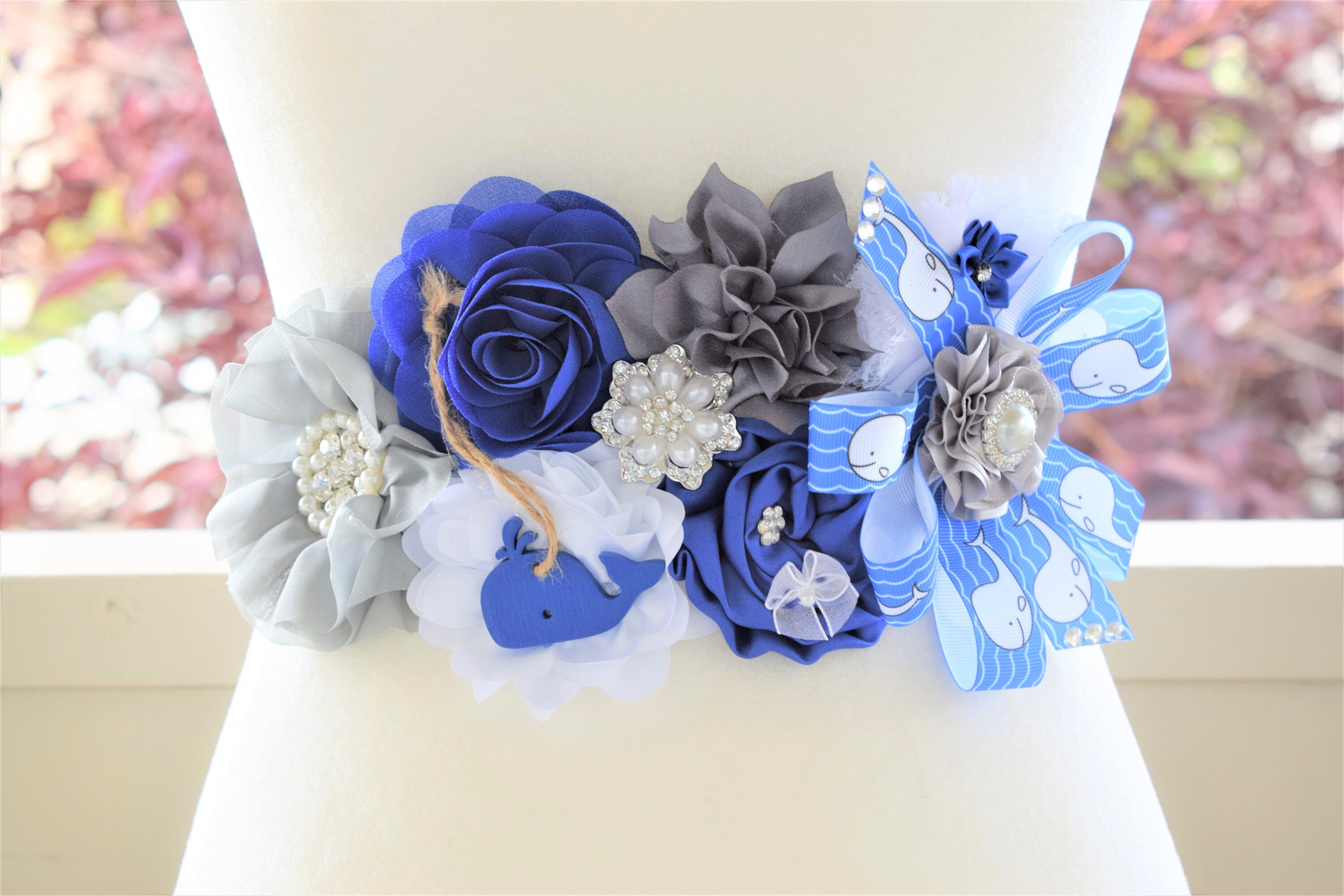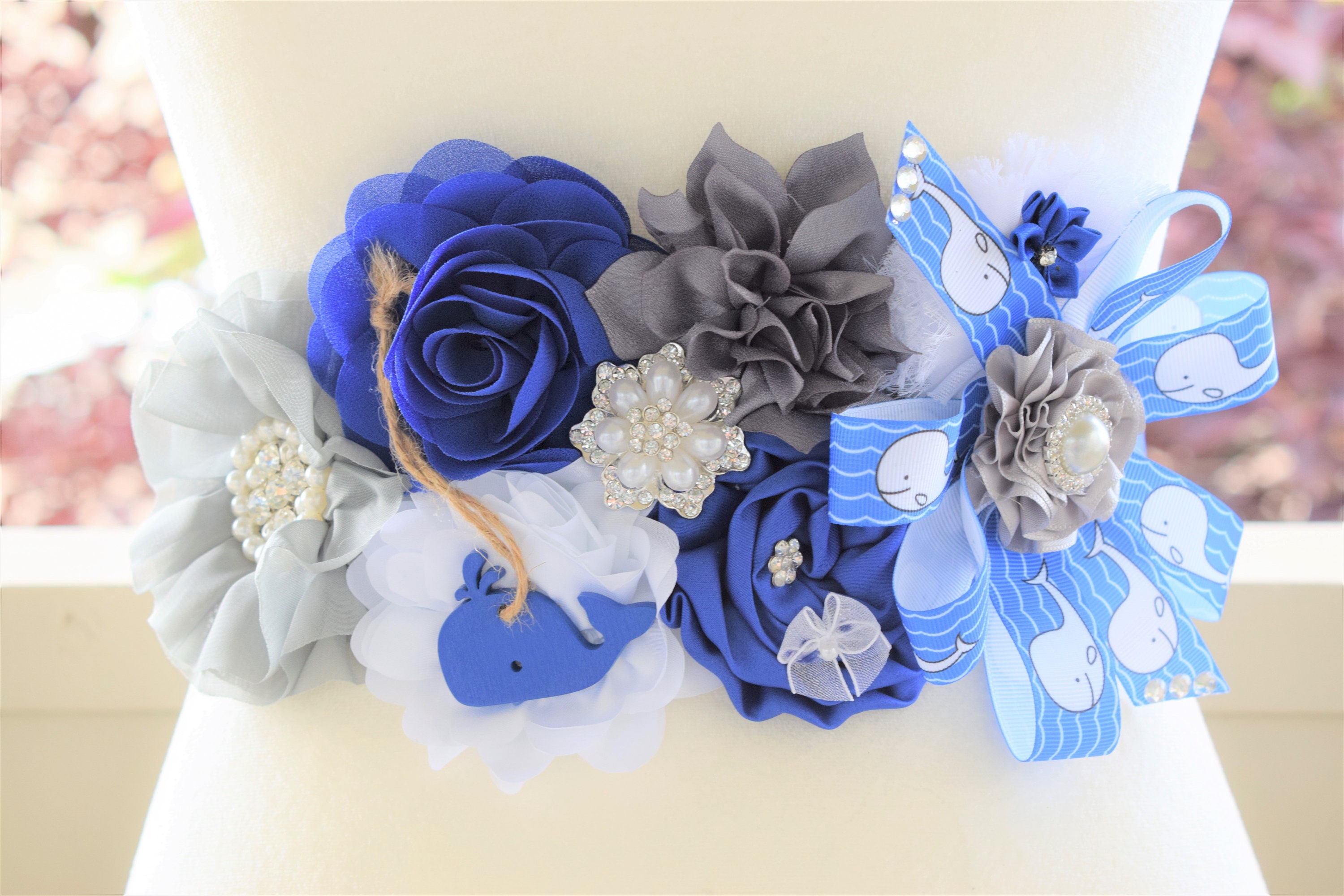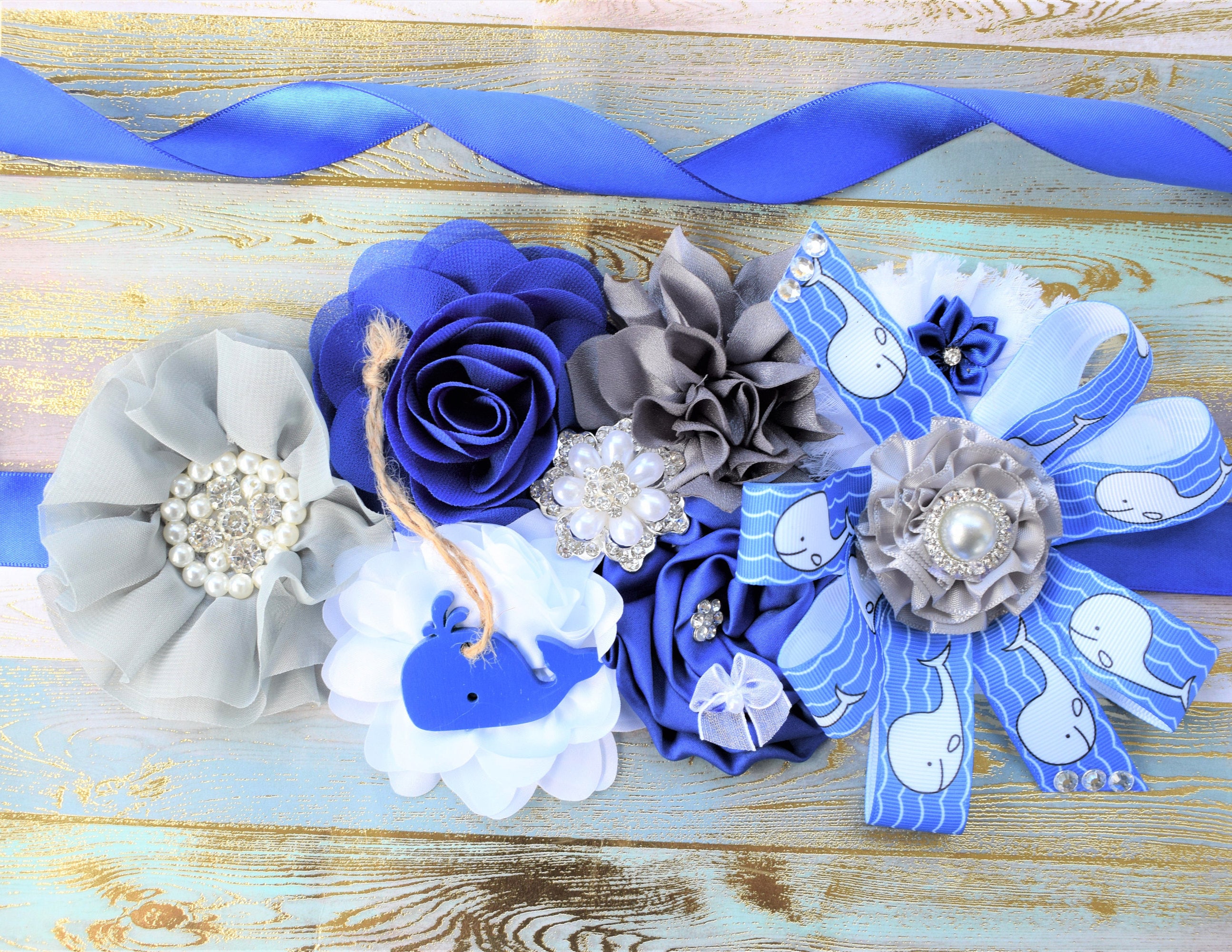 Whale Baby Shower, Royal Gray White Flower Sash, Whale Royal Blue Baby Shower, Boy Grey Blue Shower, Whale Royal Blue Grey Sash, Custom