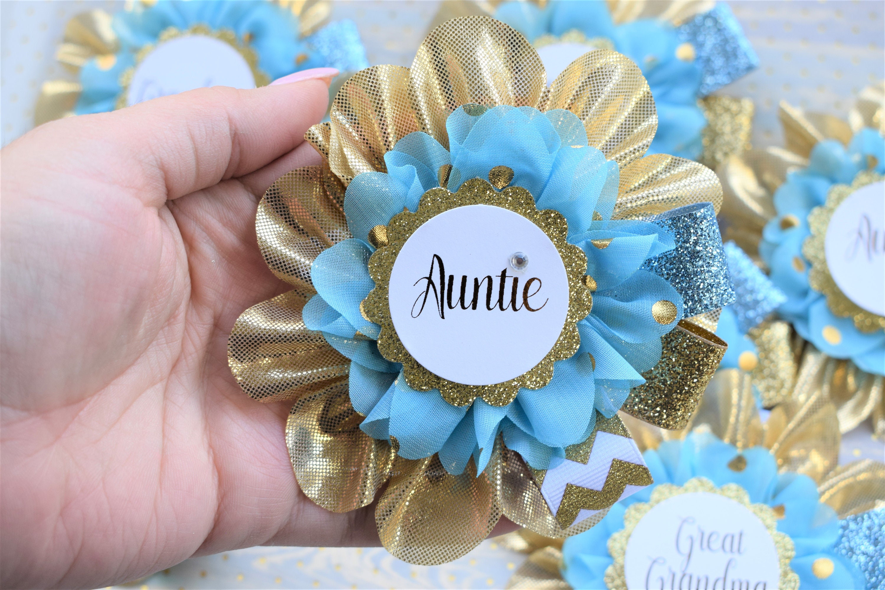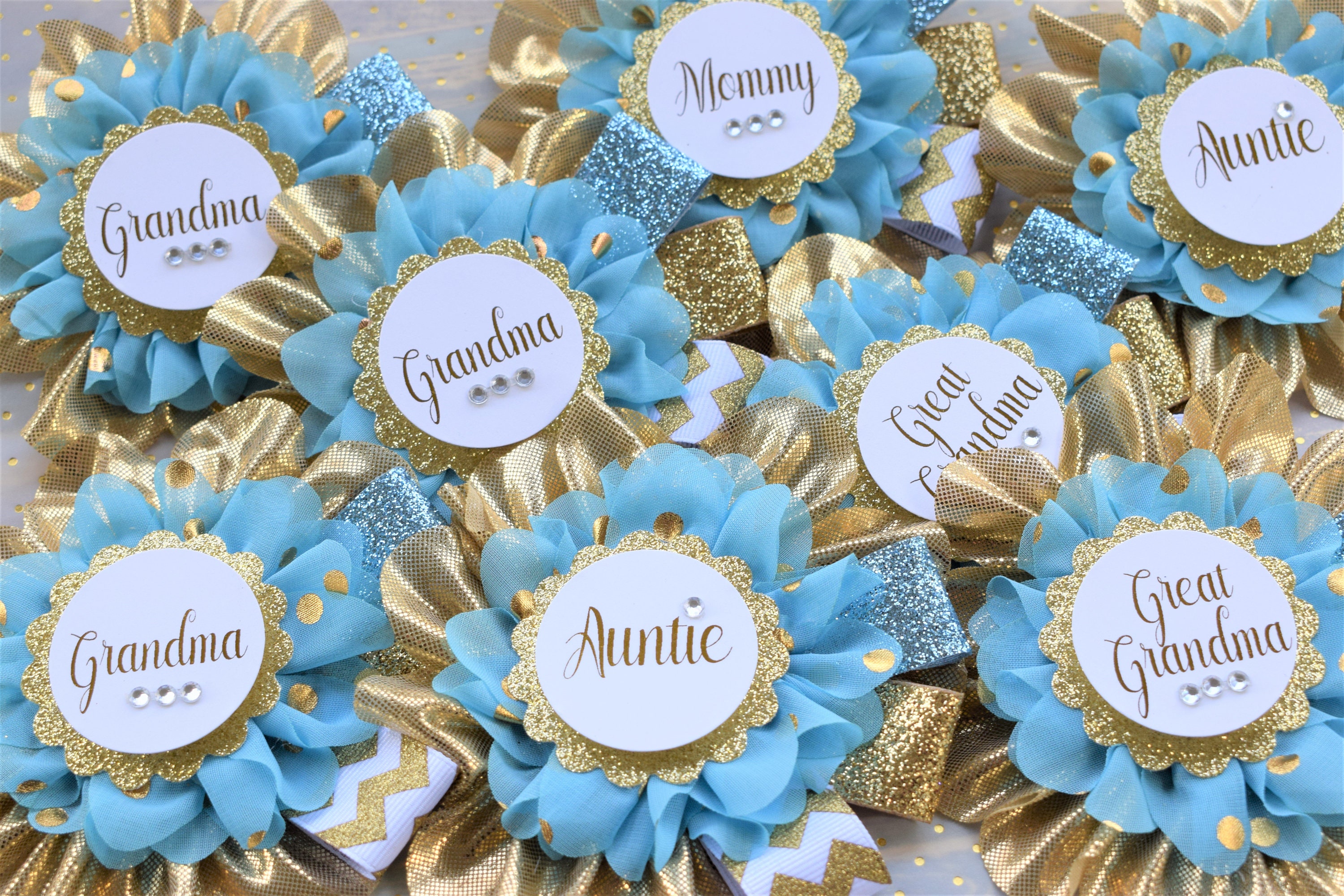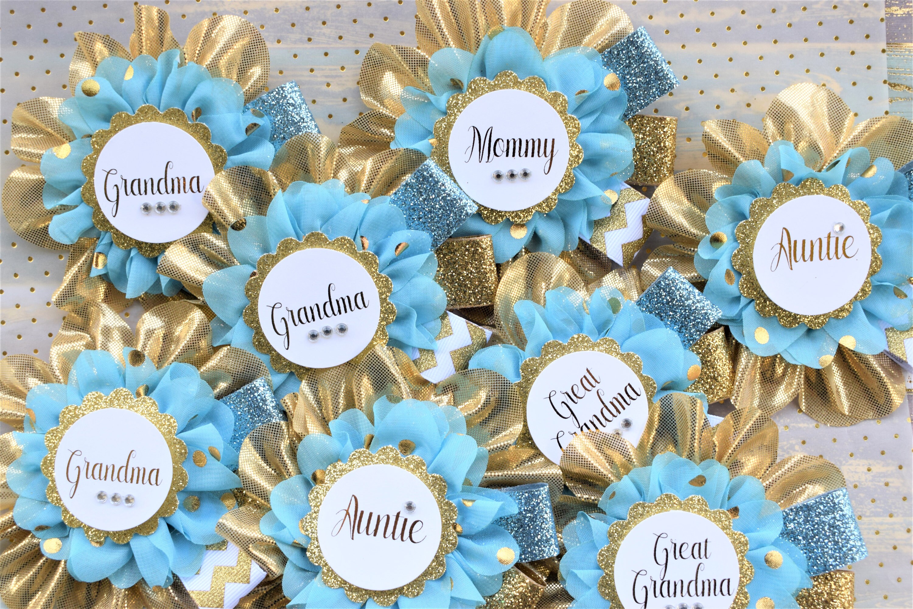 These Gold & Blue Prince Family Pins were made especially for a Baby Shower or a Photo Prop.