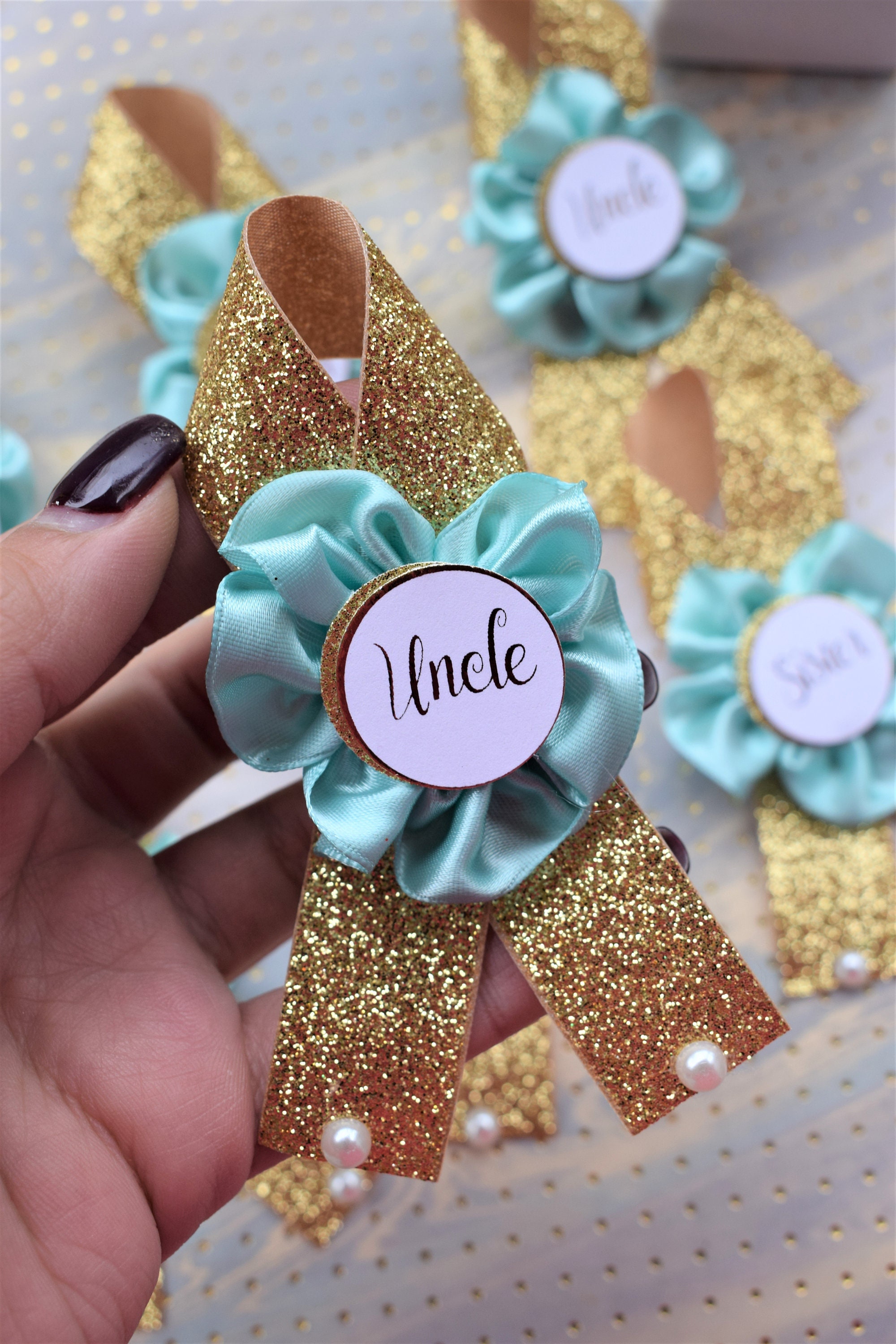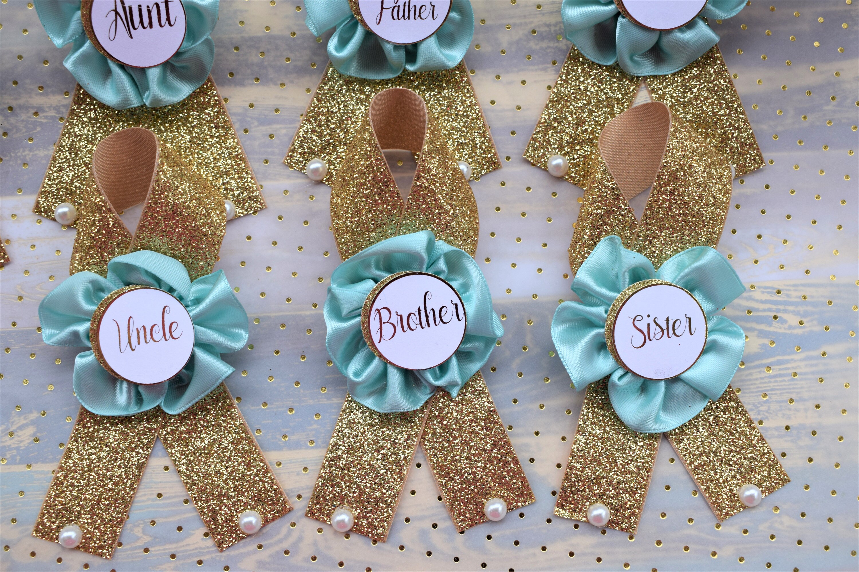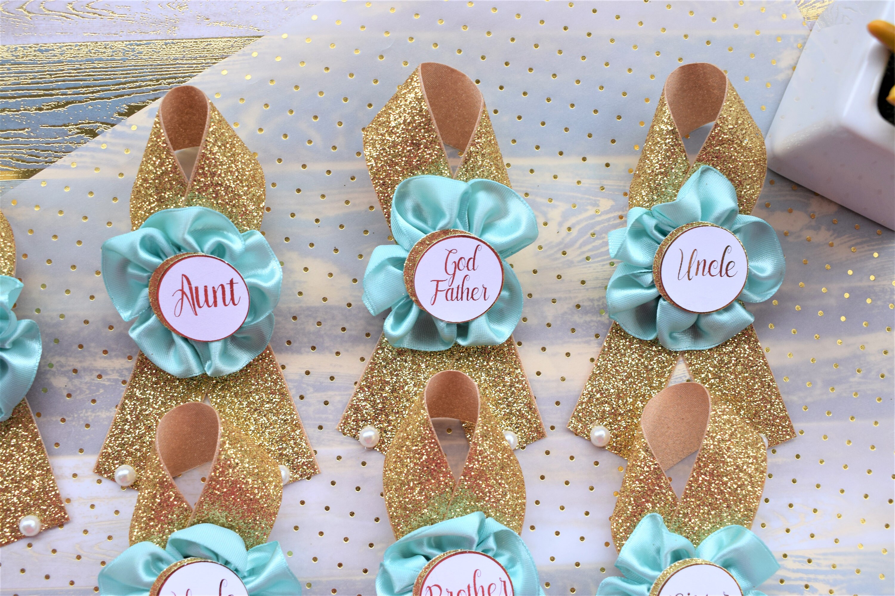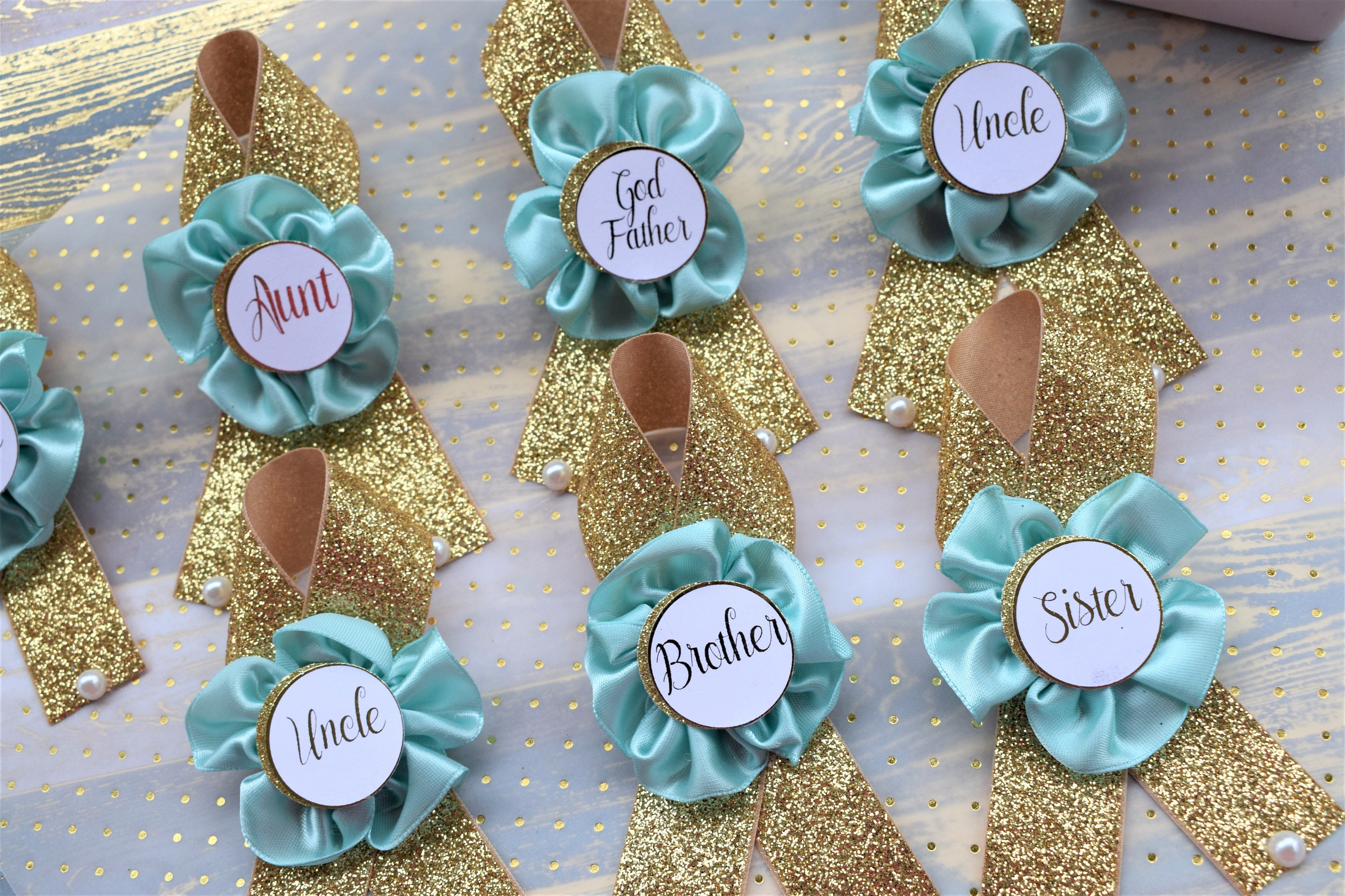 These Aqua & Gold Family Pins were made especially for a Baby Shower or a Party.