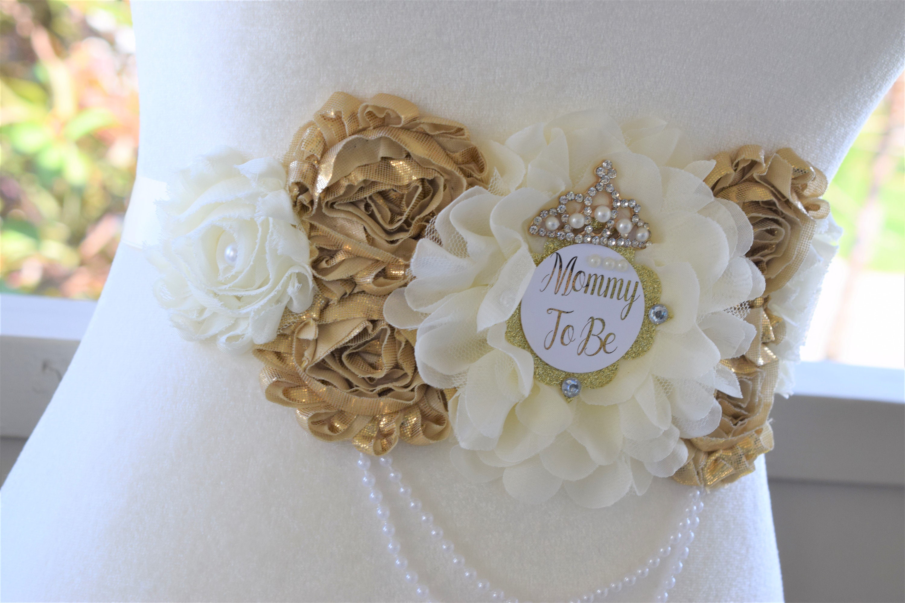* Maternity Sash: It has eleven beautiful flowers in Ivory & Gold colors embellished with rhinestones and pearls. The ribbon sash is 80'' (2 meters) long.