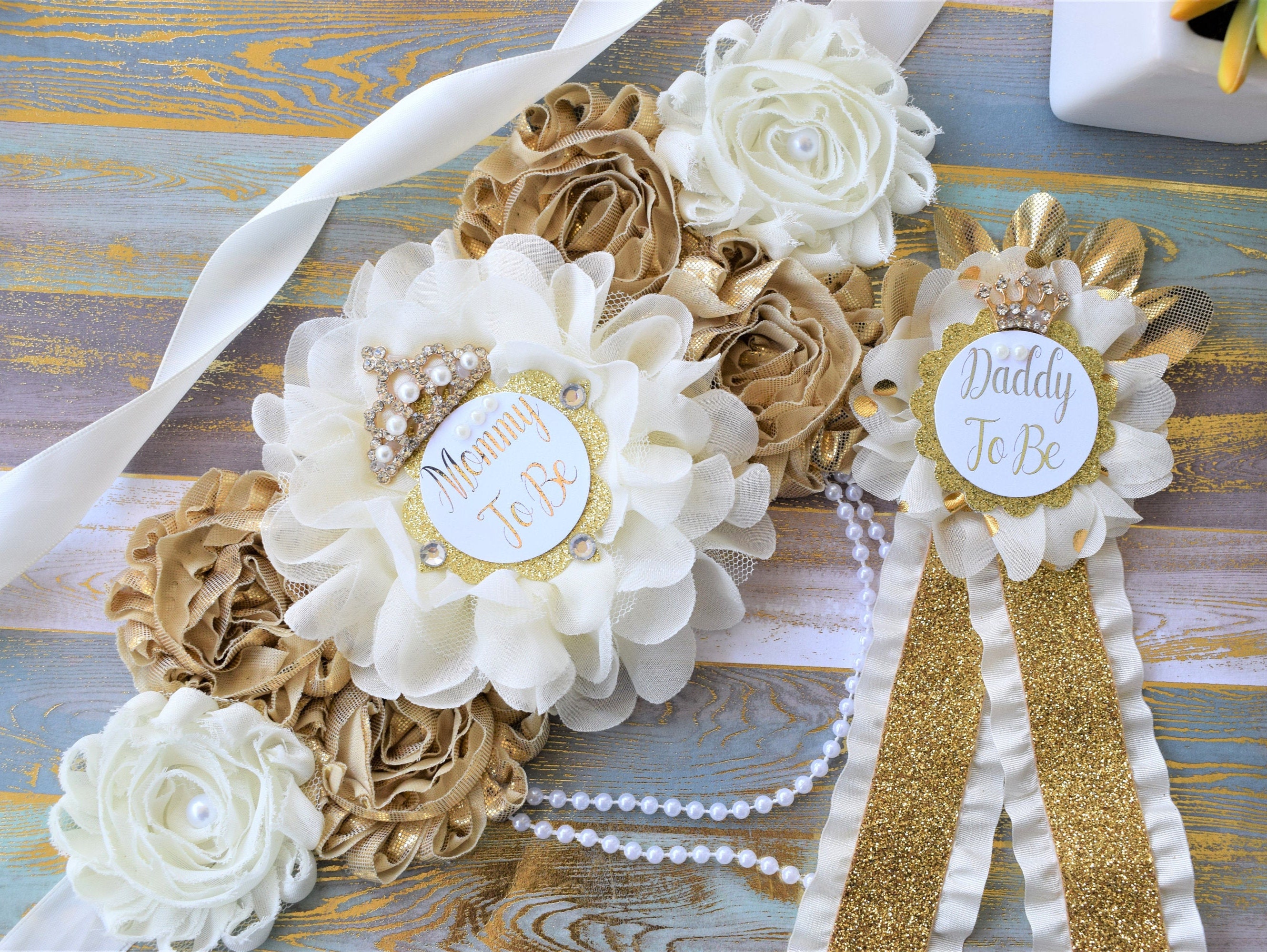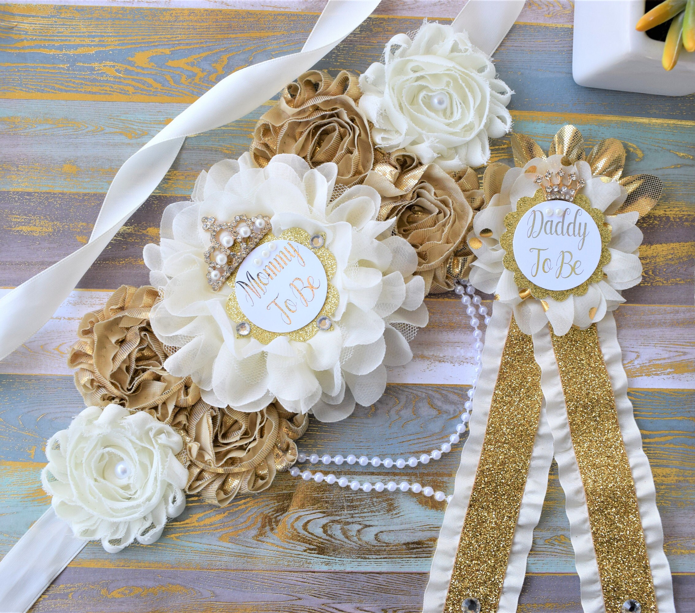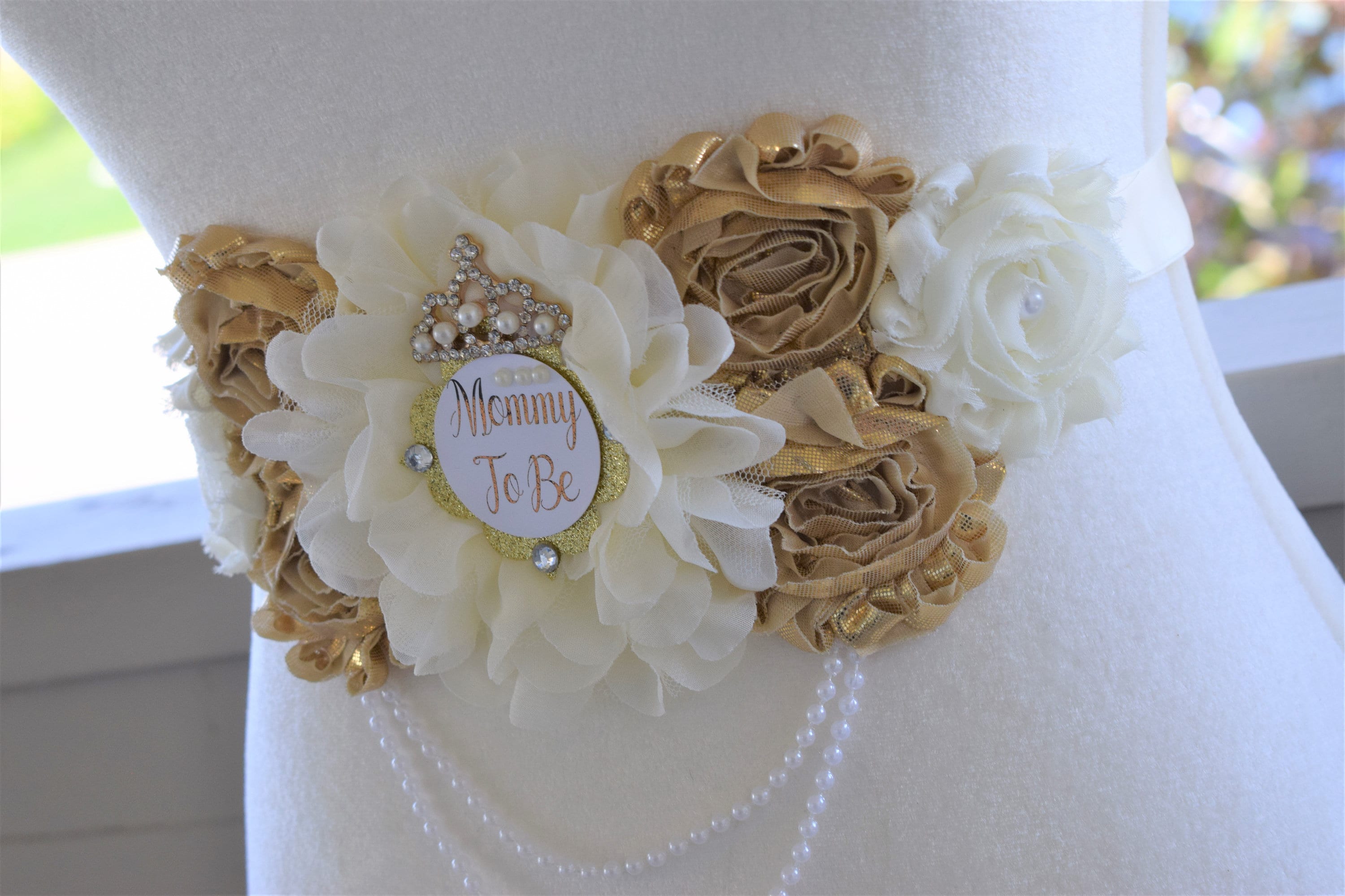 Ivory Gold Princess Flower Sash, Ivory Gold Maternity Sash, Ivory Gold Pregnant Sash, Mommy and Daddy To Be, Ivory Princess Baby Shower