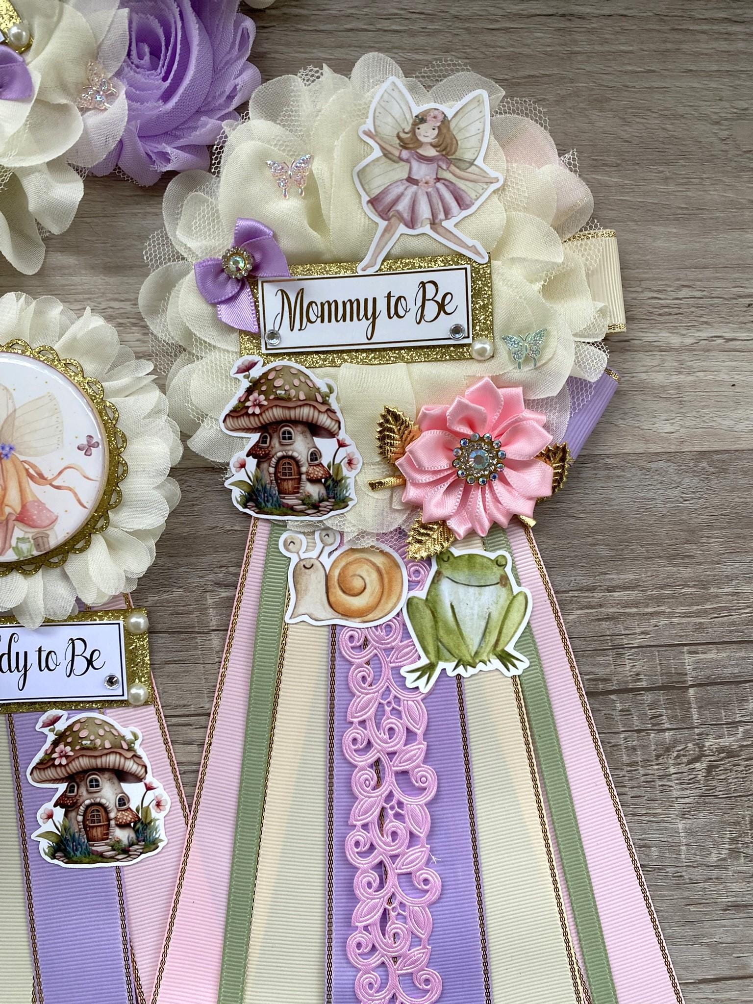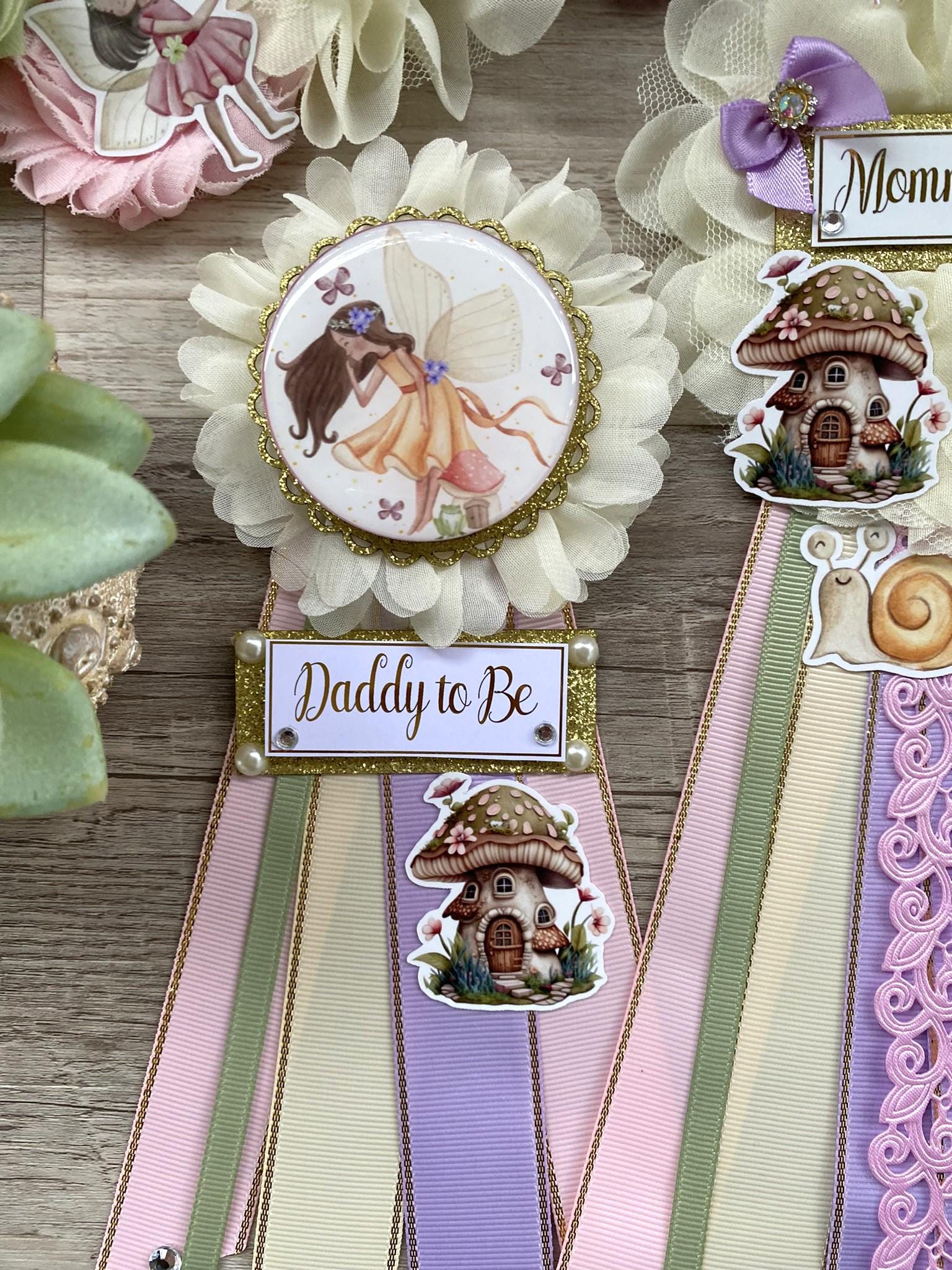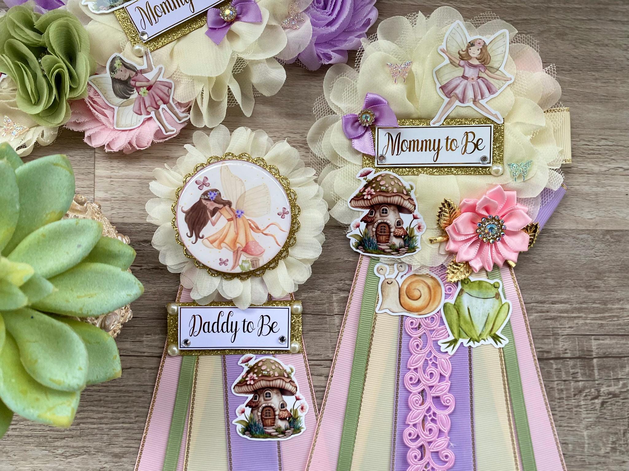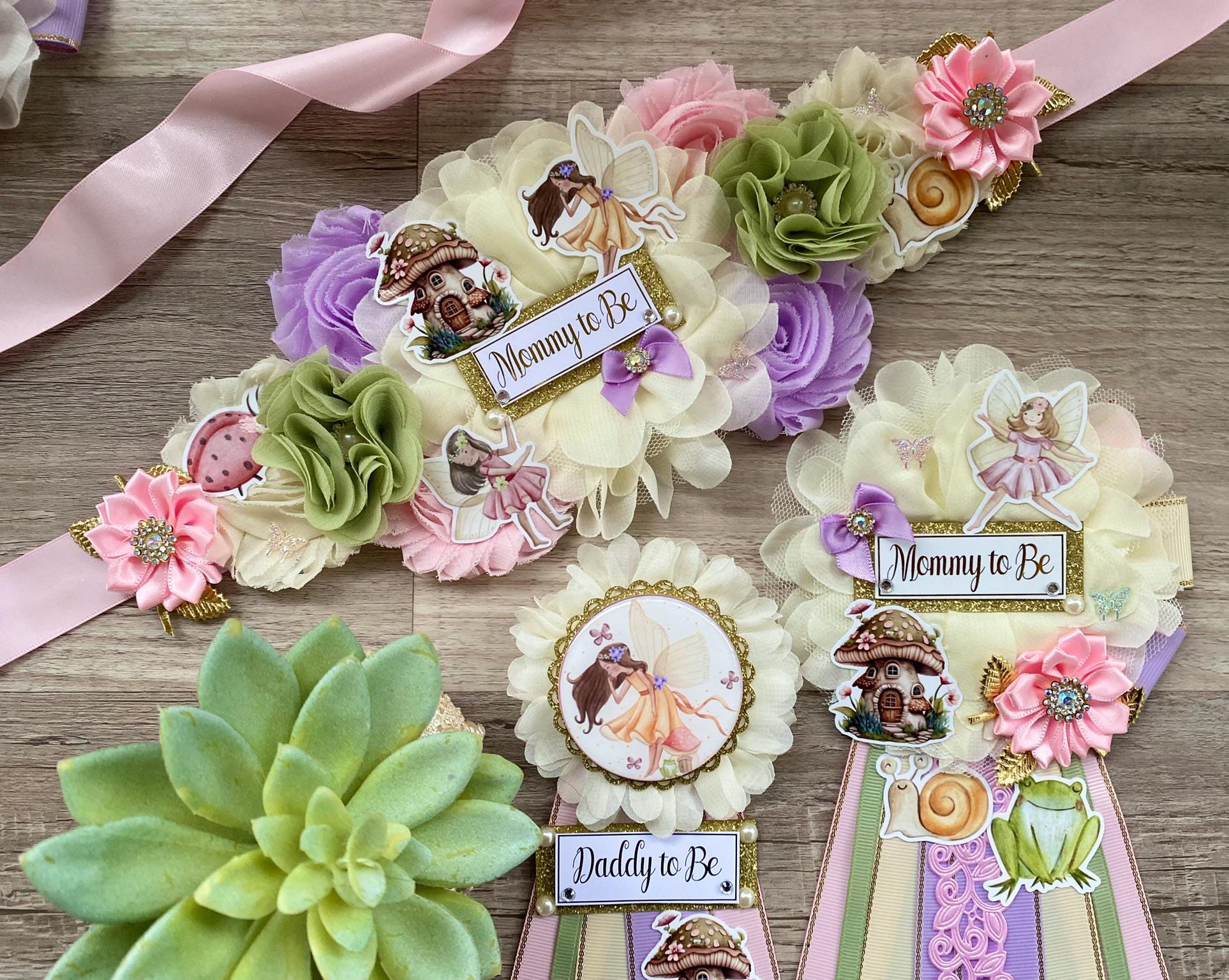 Fairytale Baby Shower, Fairy Pink Maternity Sash, Mommy To Be Ribbon Pin, Daddy To Be Badge Pin, Butterfly, Fairy Garden Mushrooms, Custom