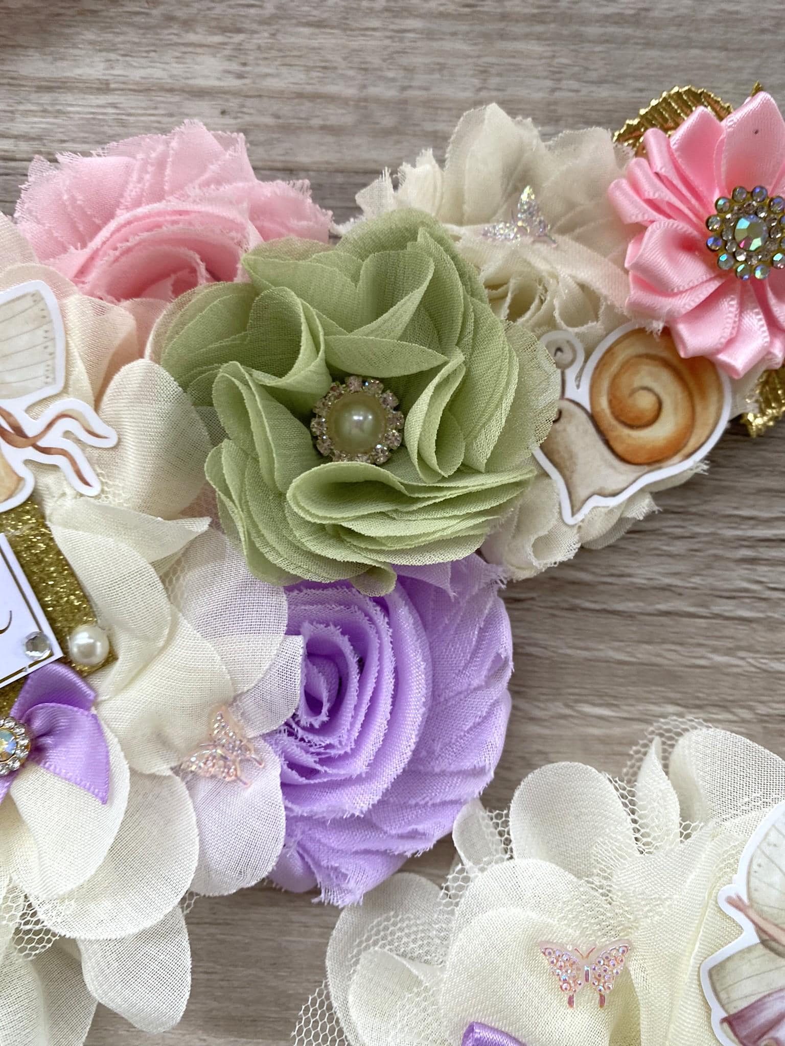 * Maternity Sash: It has eleven beautiful flowers in the shade of pink, sage, lavender, cream and a touch of gold colors embellished with rhinestones and pearls. The ribbon sash is 80'' (2 meters) long.