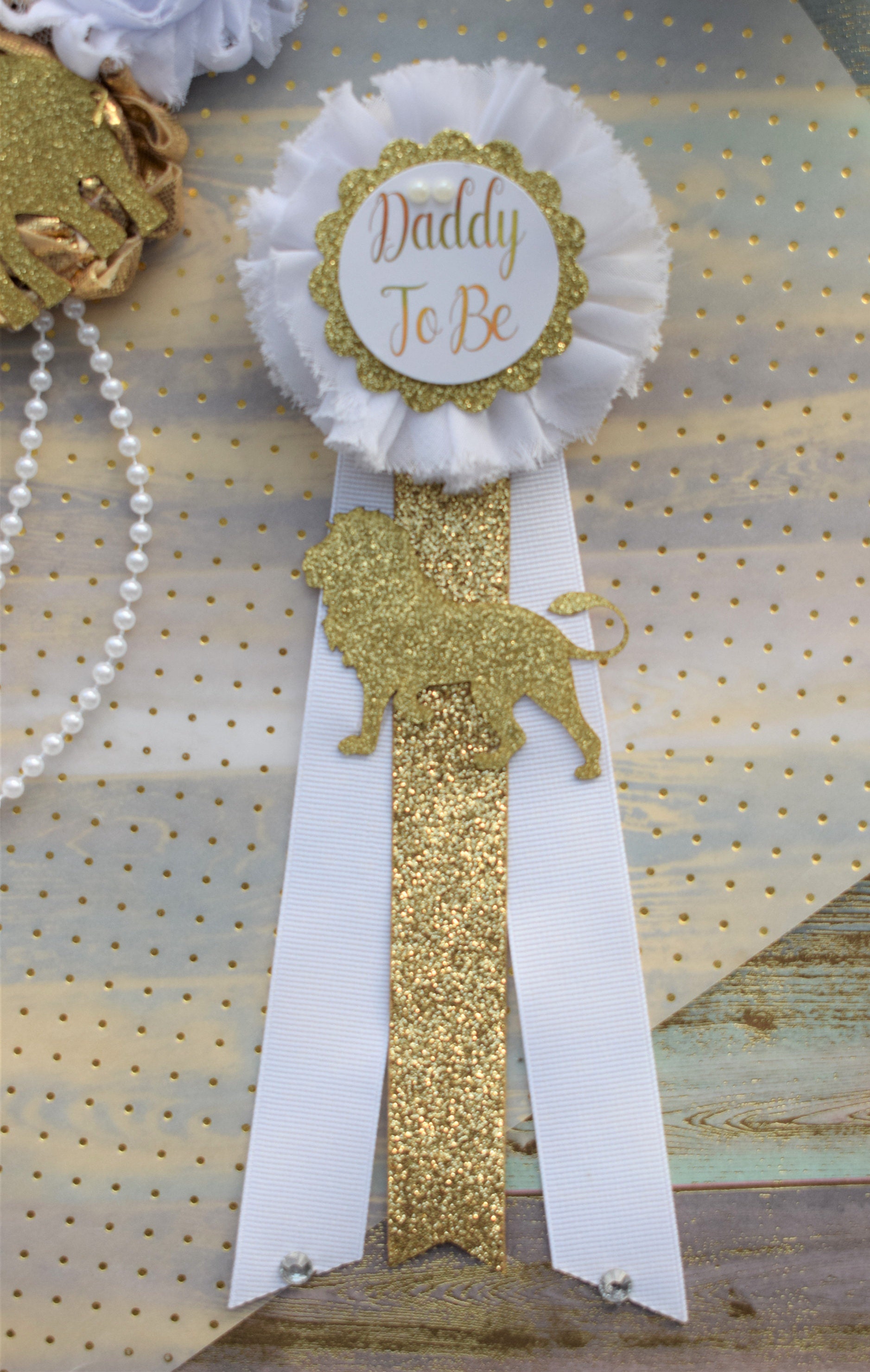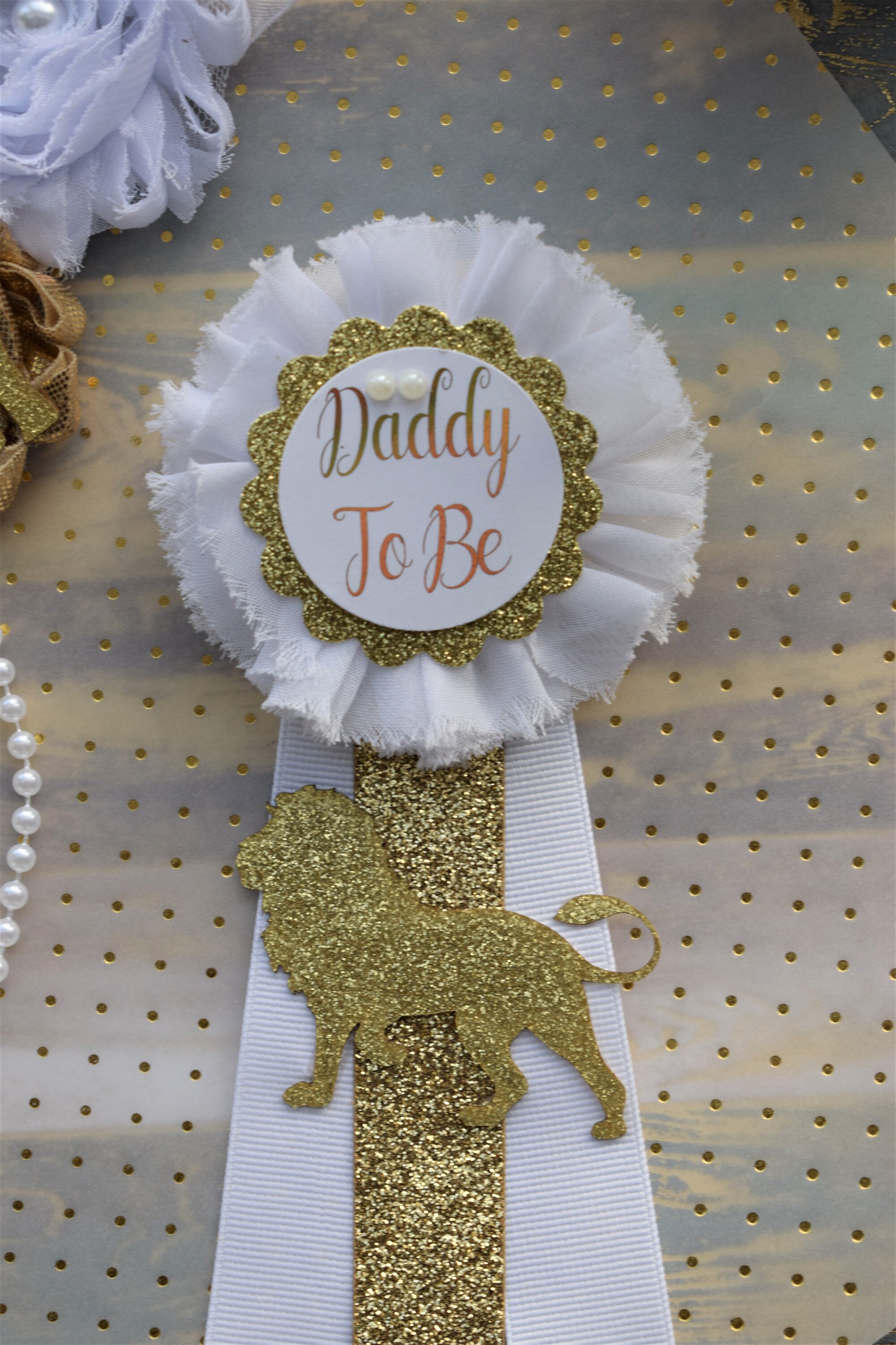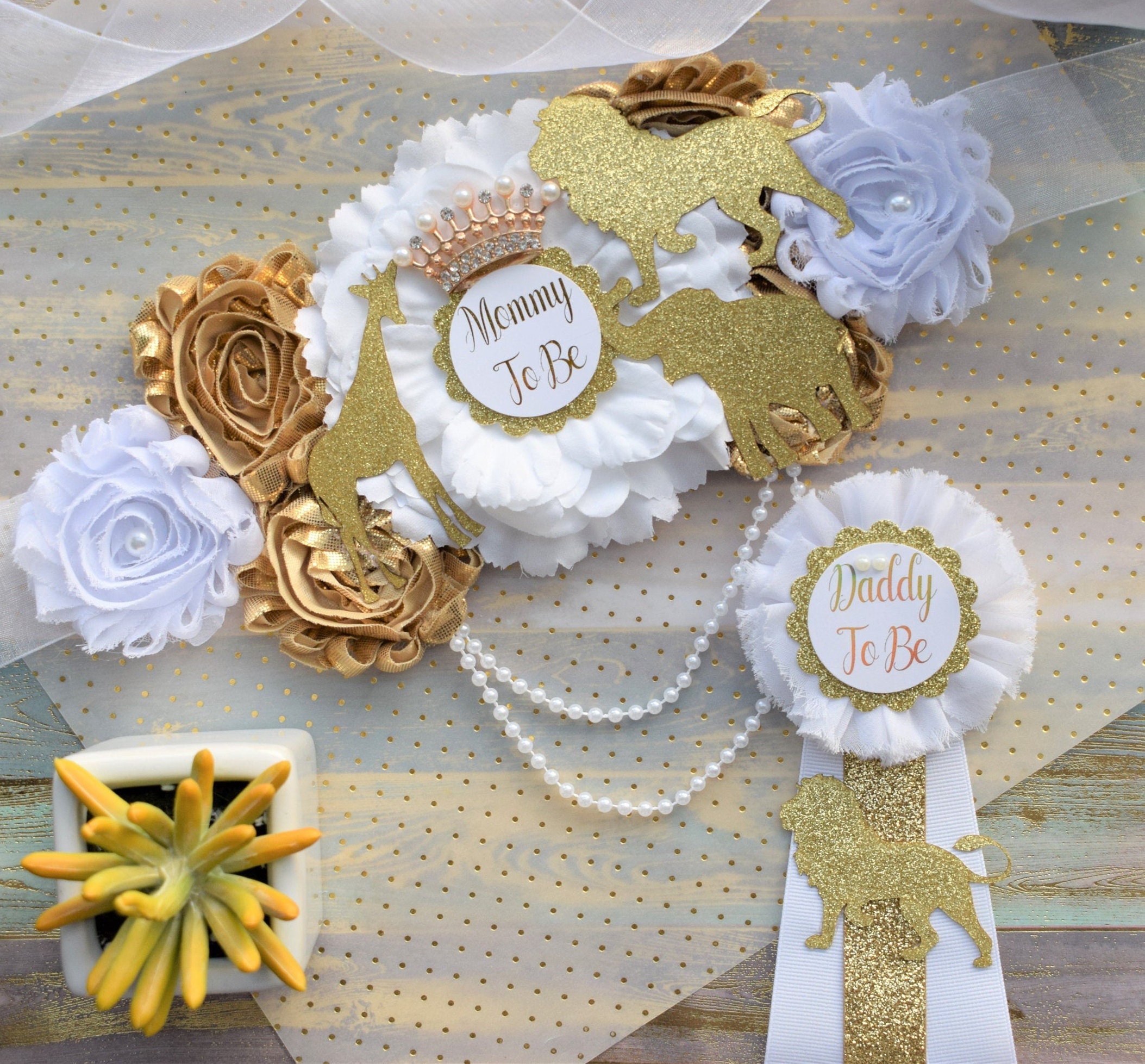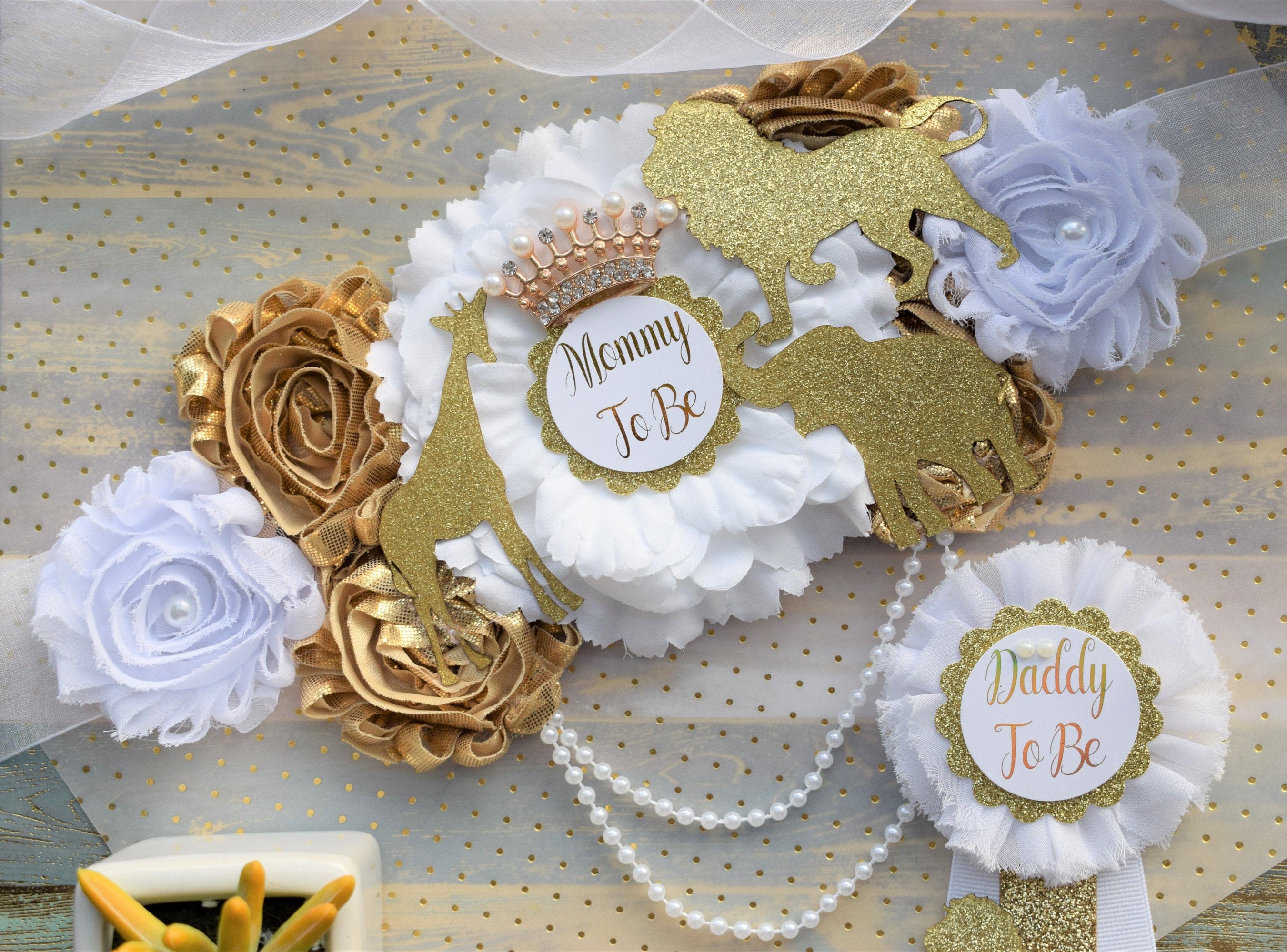 Safari White Gold Flower Sash, Gold Safari Animals, White Gold Maternity Sash, Jungle Safari White Gold Baby Shower, Mommy pin