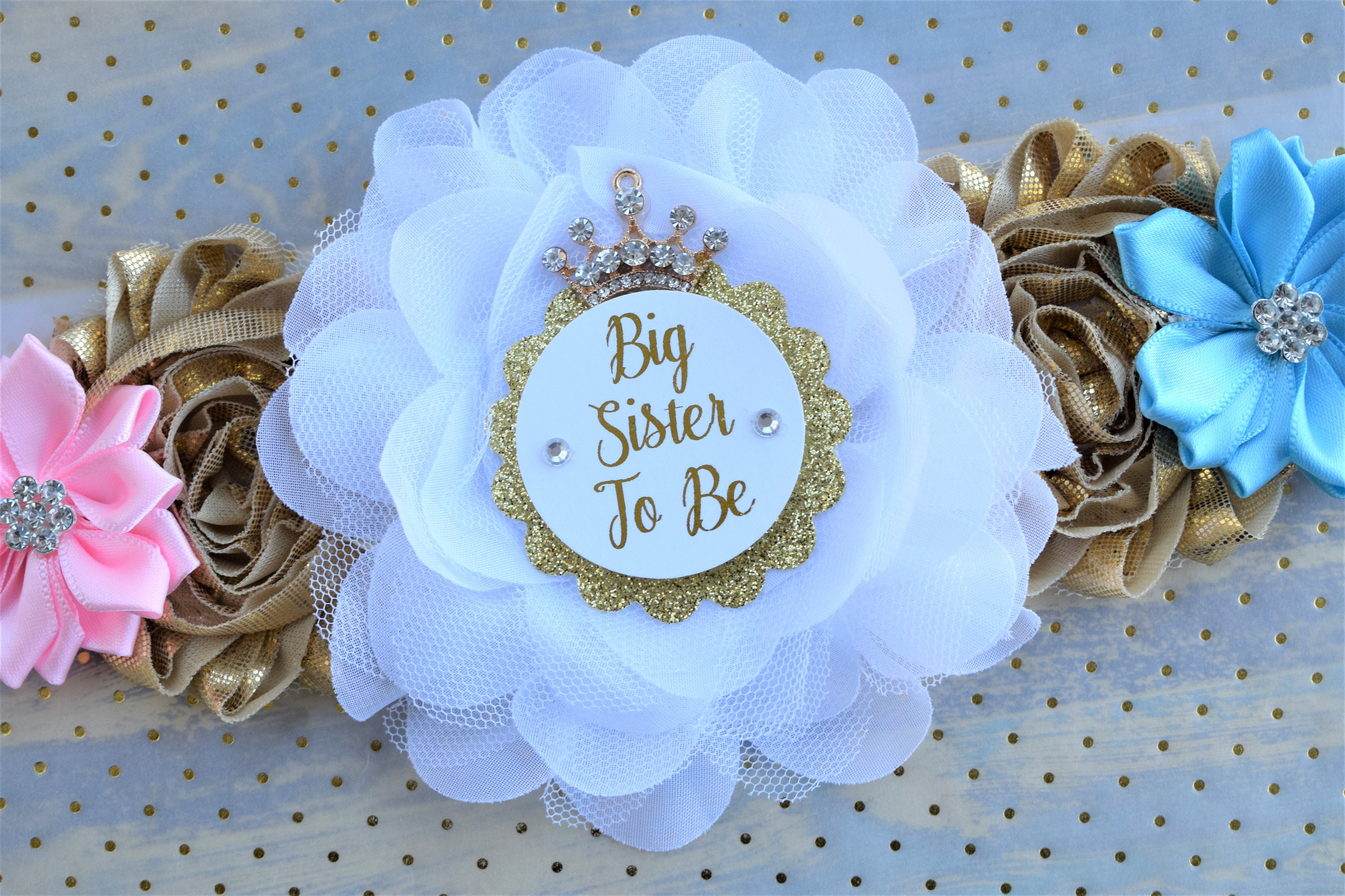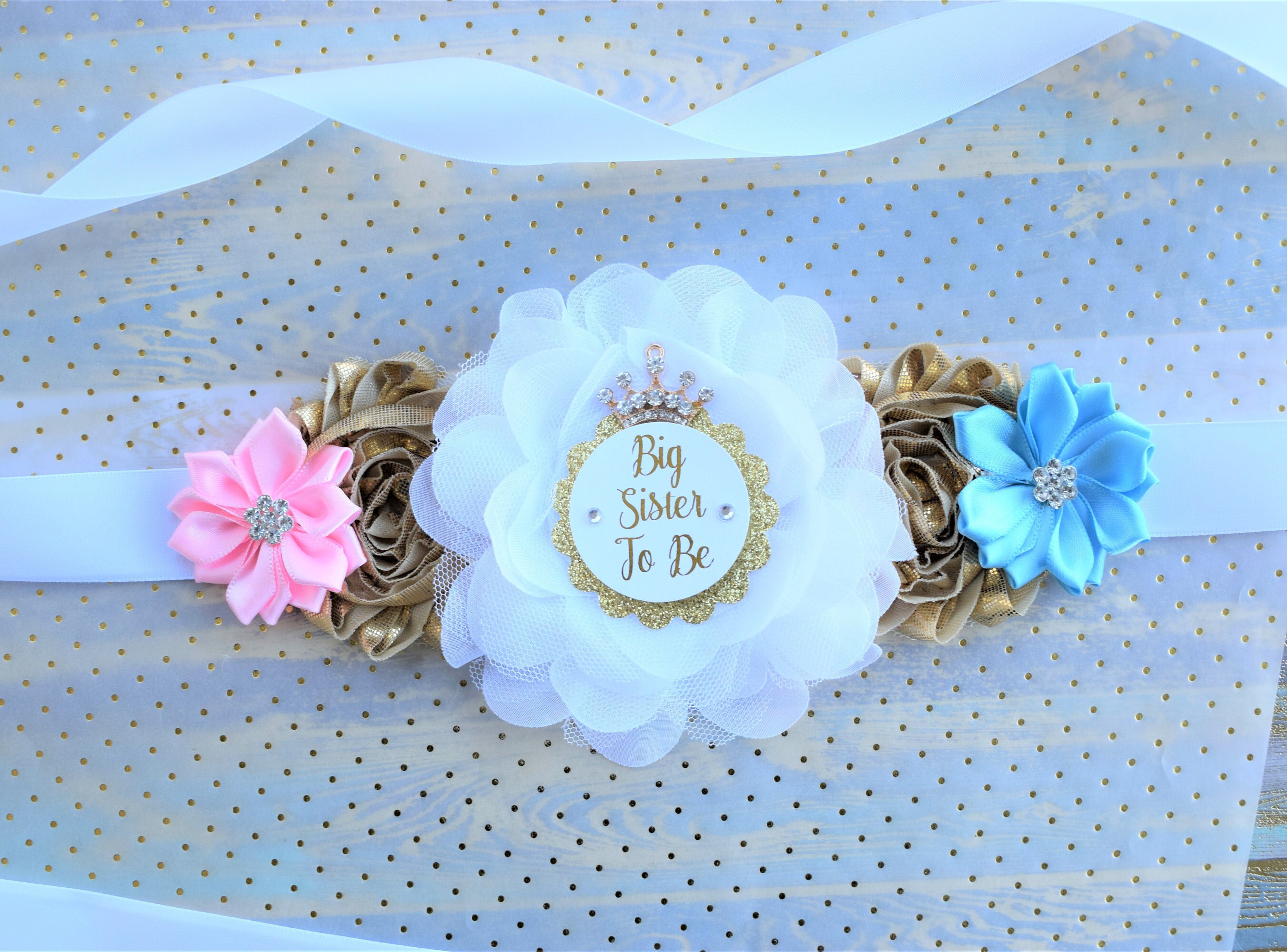 Big Sister To Be Flower Sash, White Pink Blue Gold Maternity Sash, Gender Reveal Gold Pregnant Sash, White Gold Baby Shower, Custom Sash