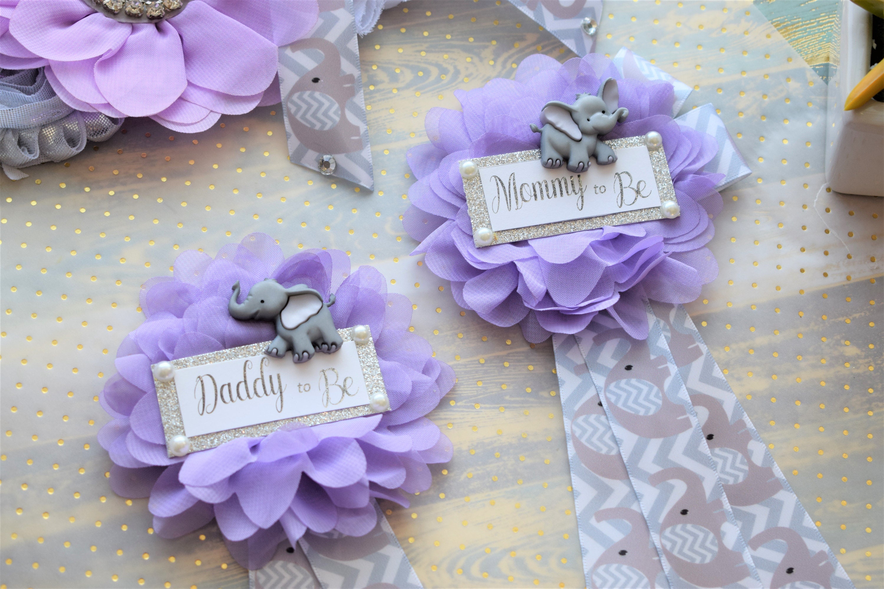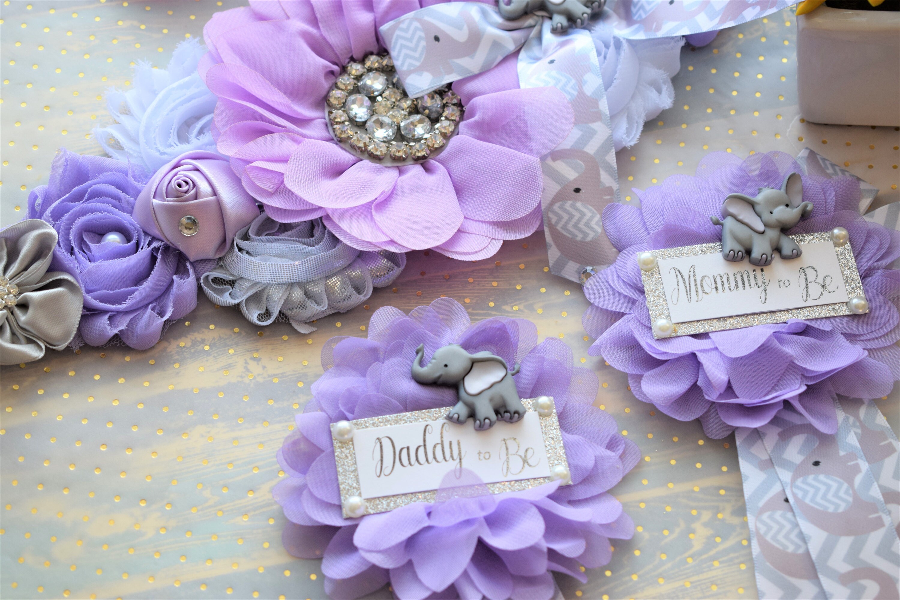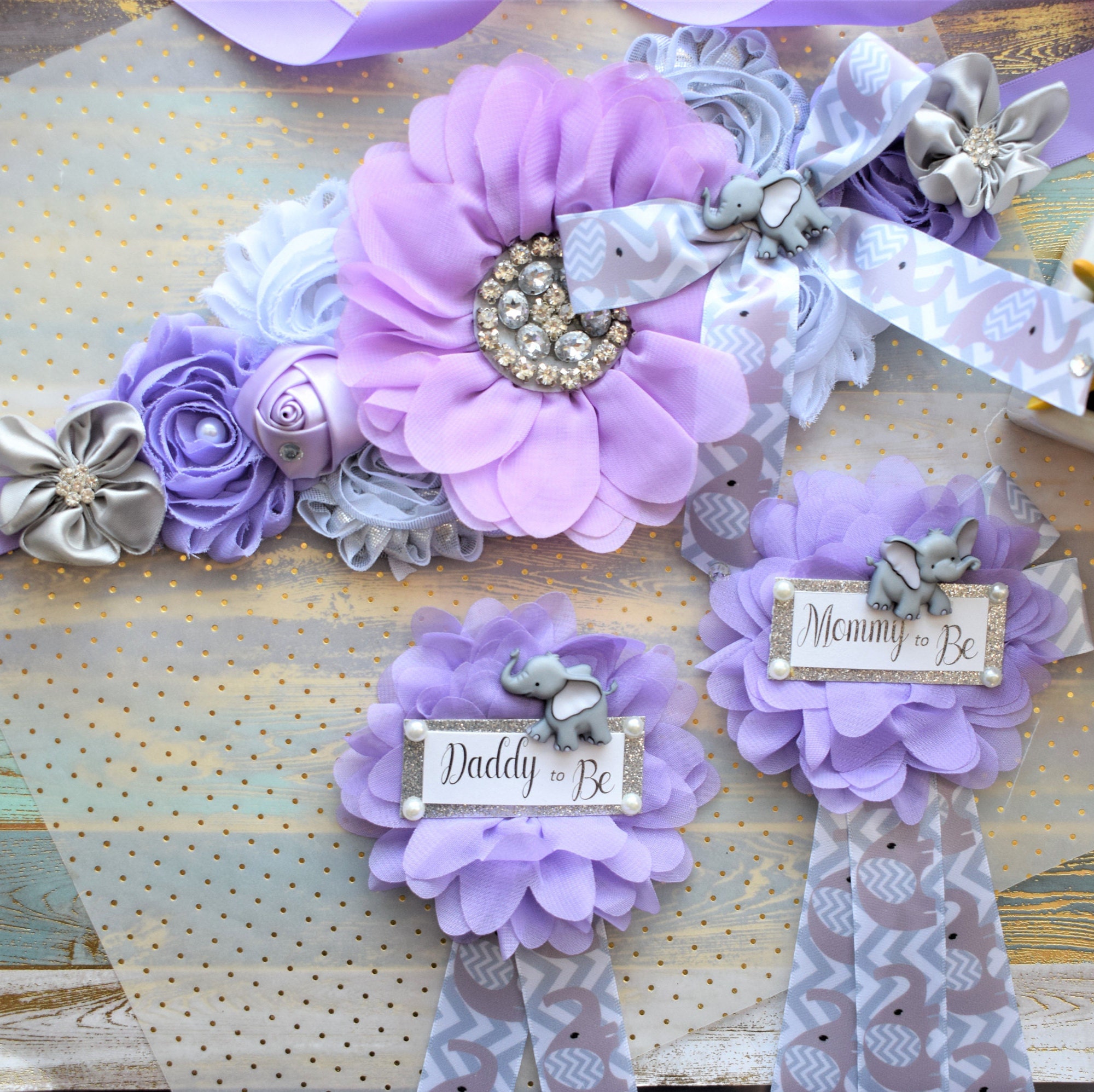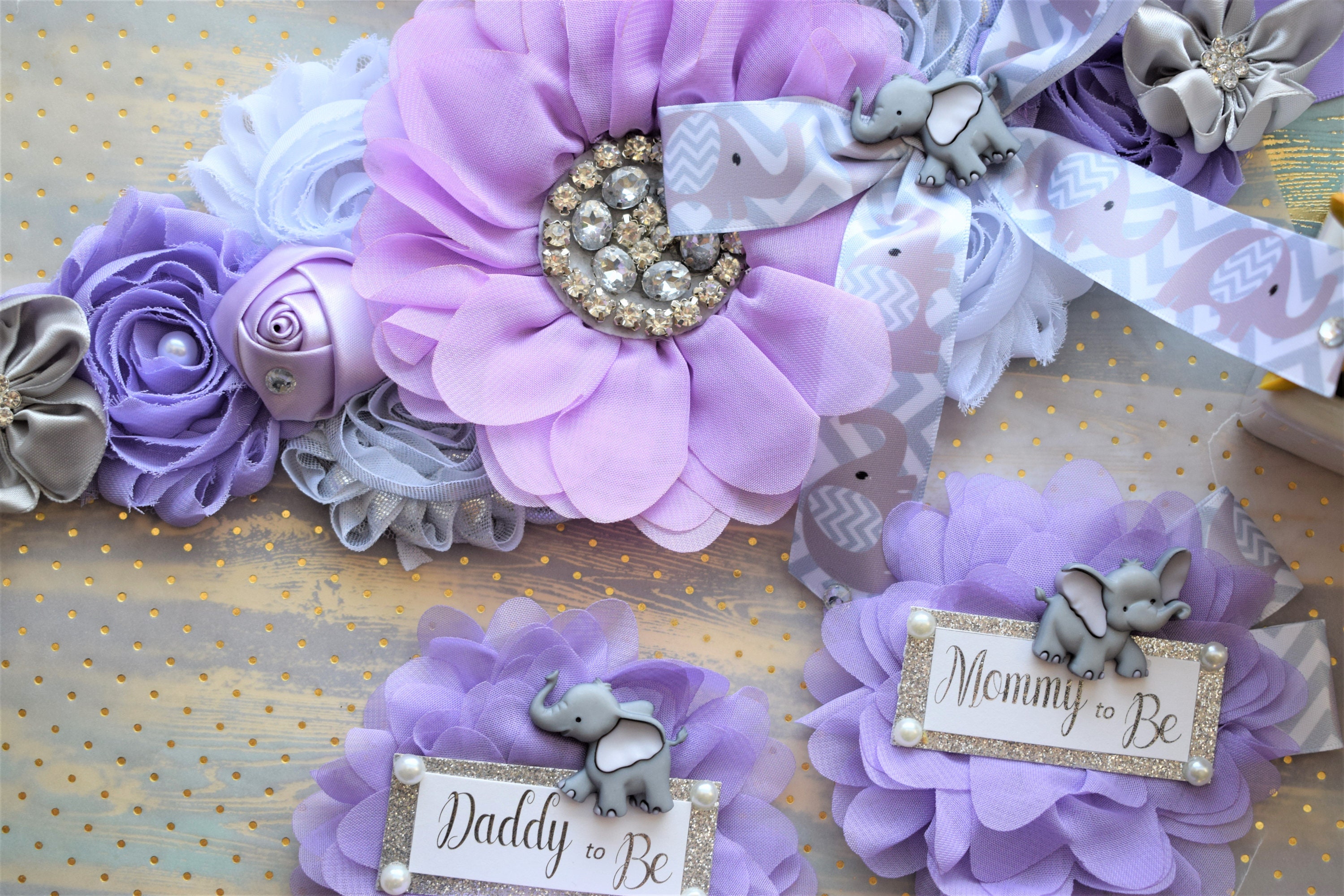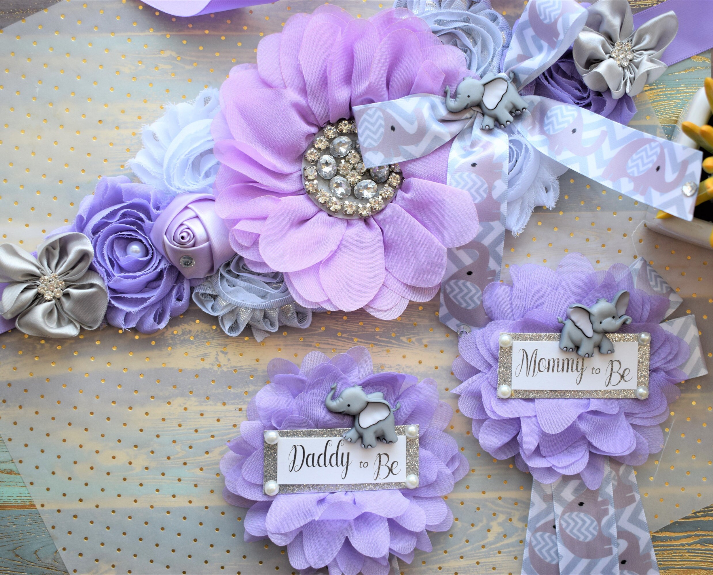 This Lavender Grey Elephant Sash & Pin Set was made especially for a Baby Shower or a Photo Prop.