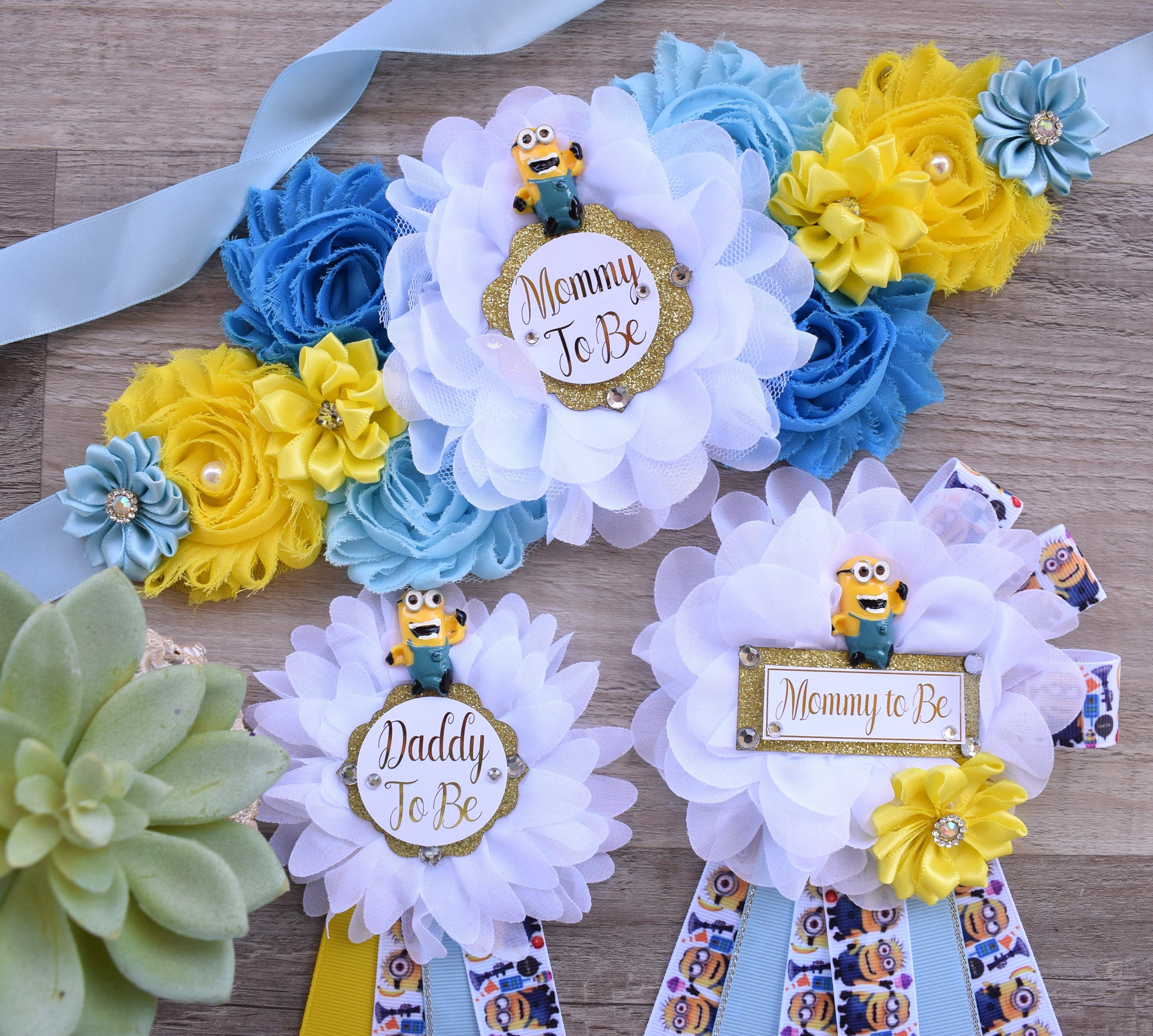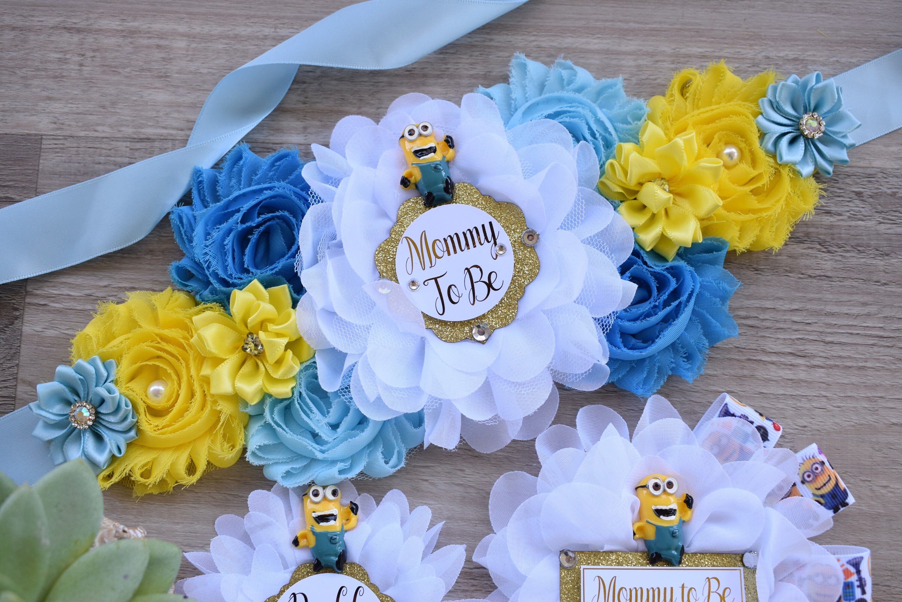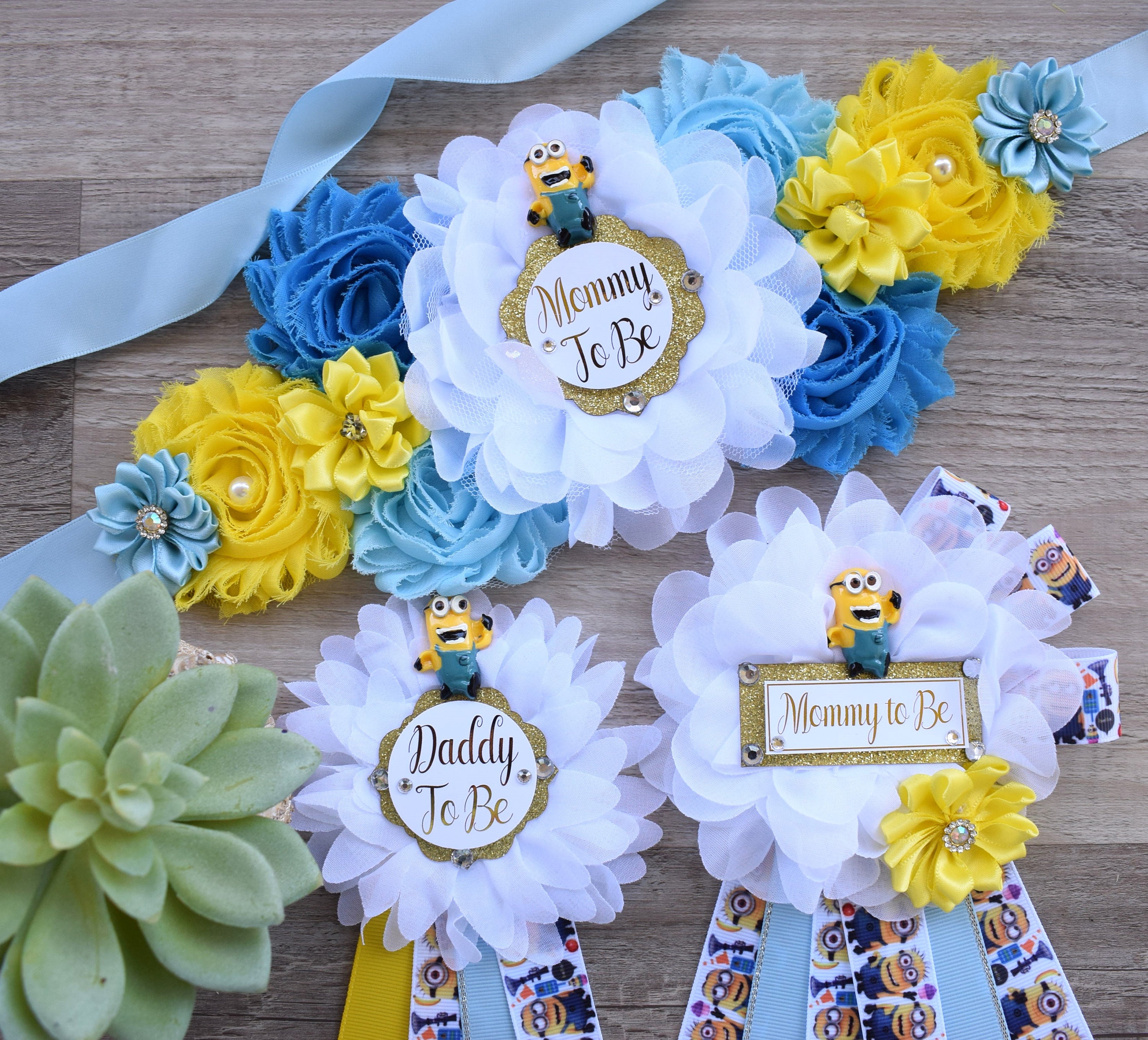 Yellow Comedy Baby Shower, Yellow Blue Maternity Sash, Blue Yellow Mommy To Be Ribbon, Daddy To Be Pin, Baby Shower Pin, Custom