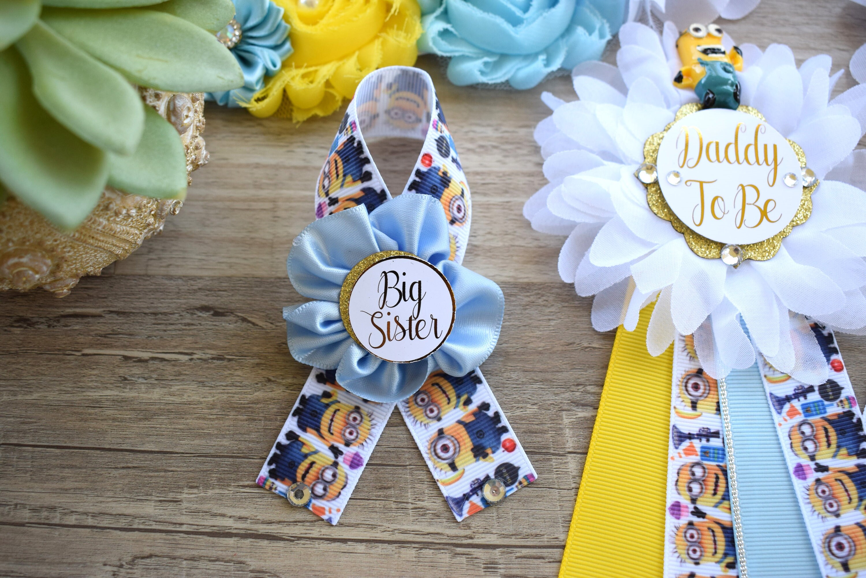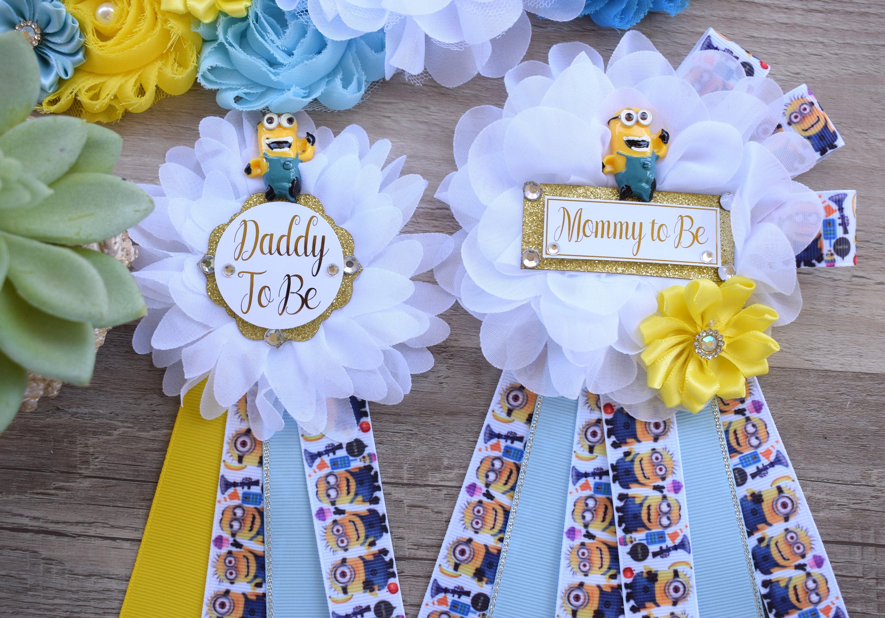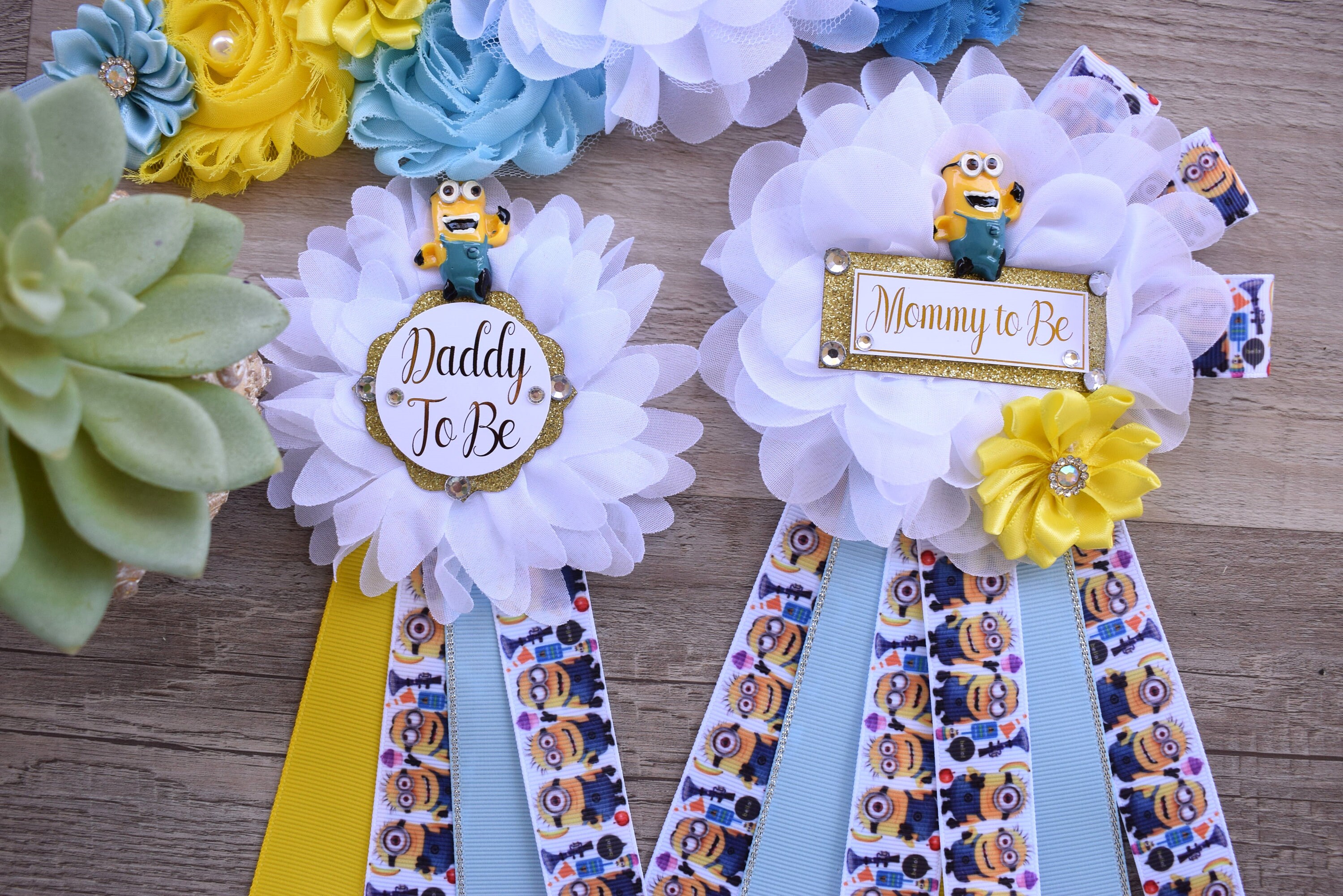 Yellow Comedy Baby Shower, Yellow Blue Maternity Sash, Blue Yellow Mommy To Be Ribbon, Daddy To Be Pin, Baby Shower Pin, Custom