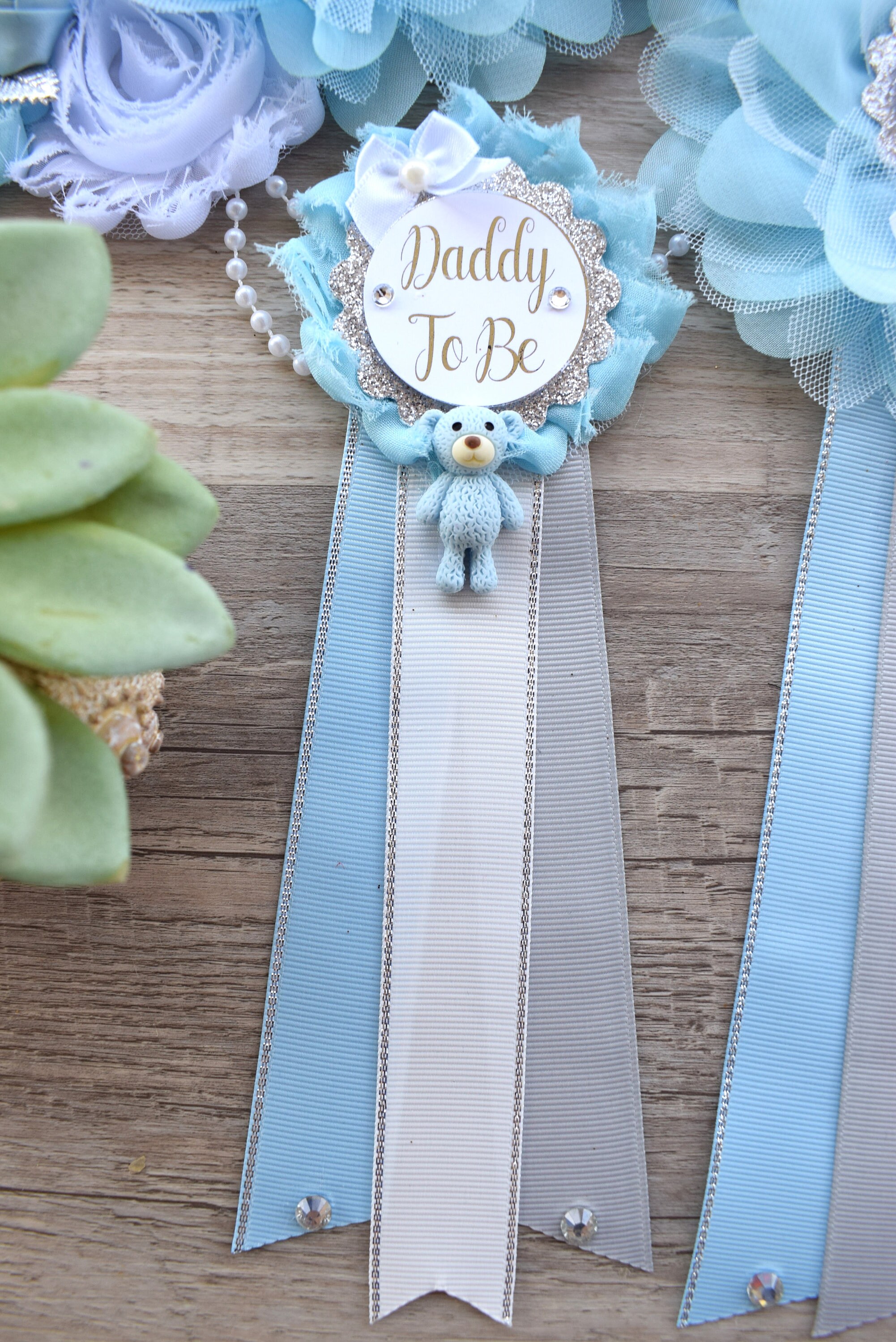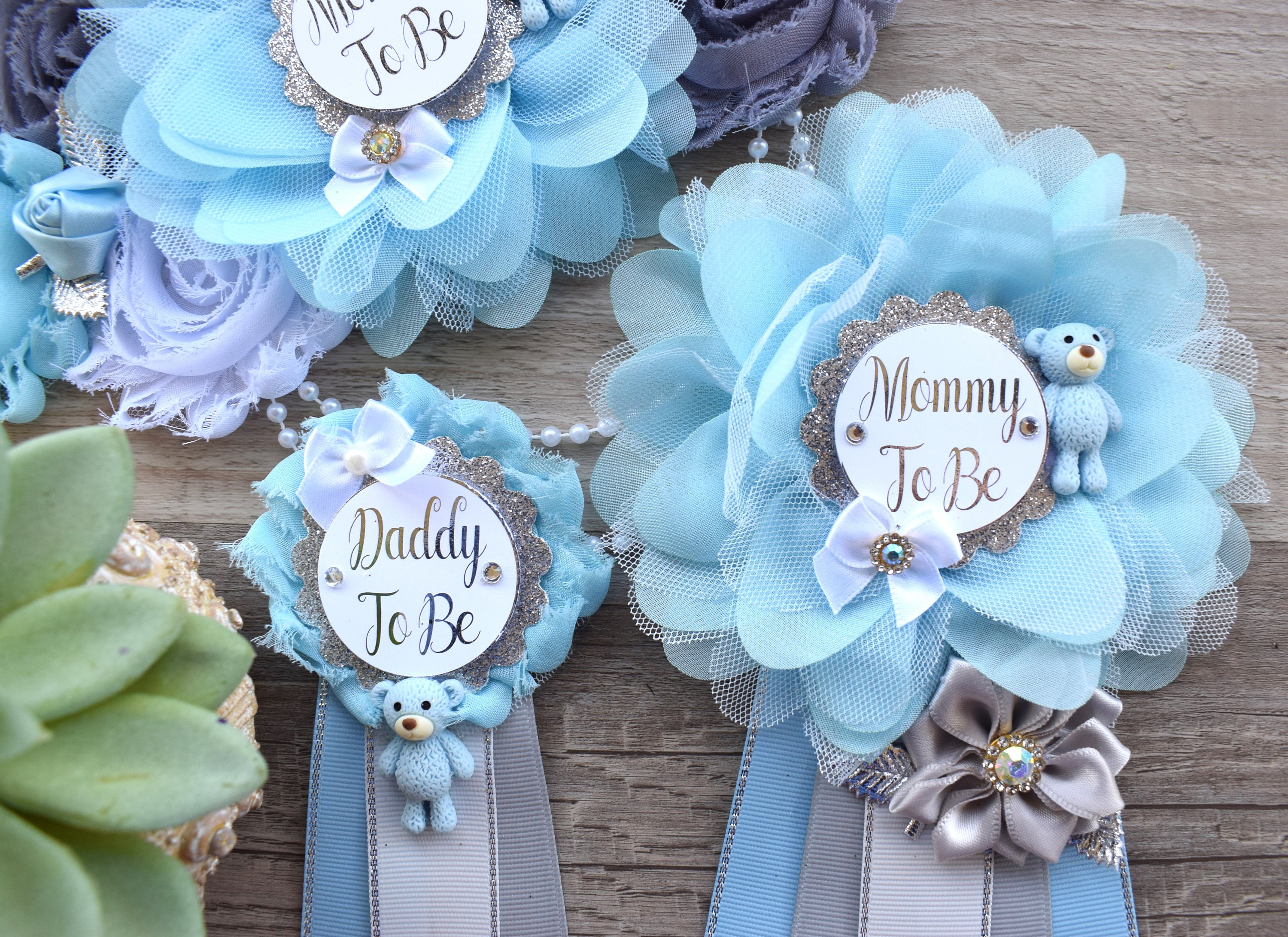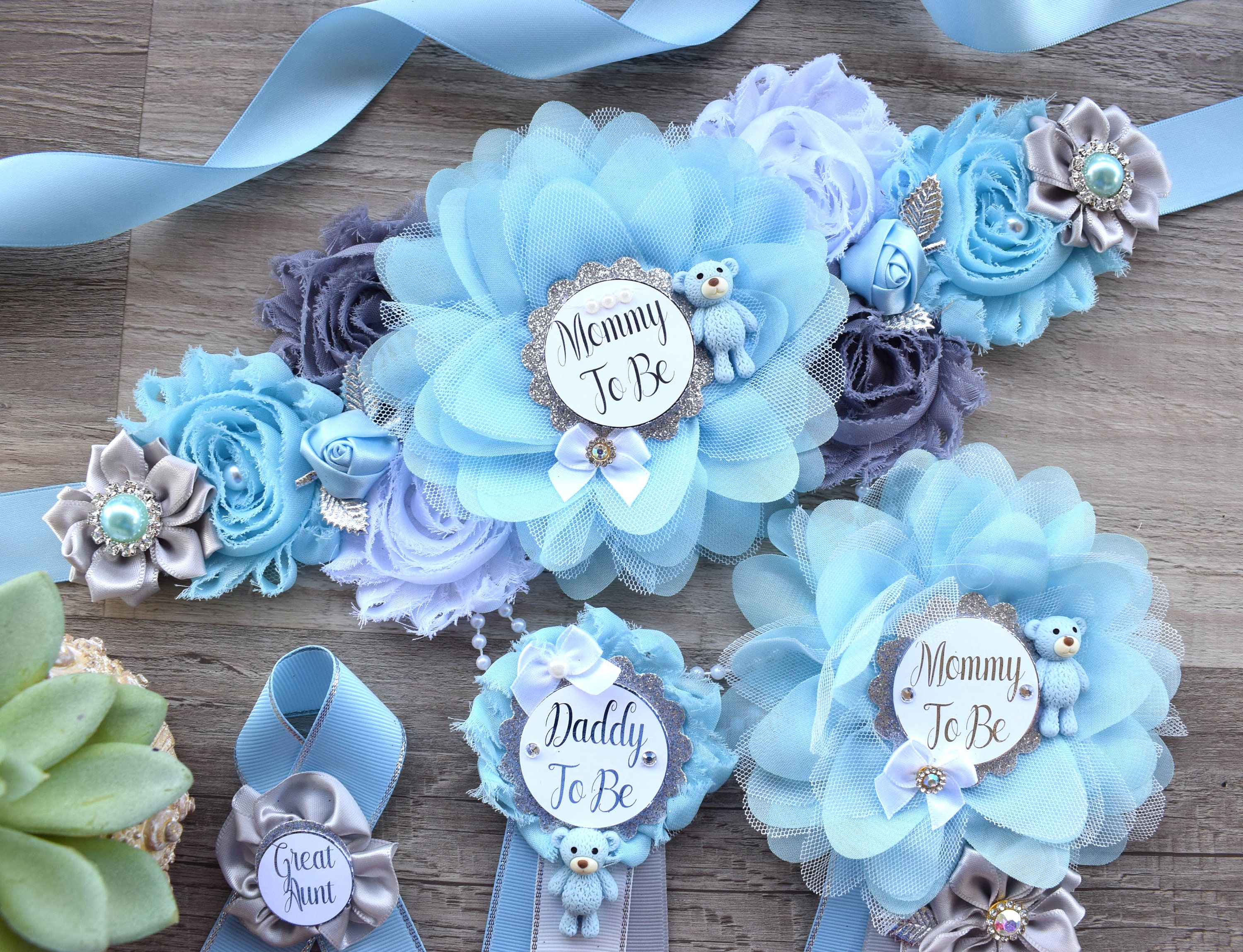Teddy Bear Baby Shower, Grey Blue White Teddy Bear Blue Flower Sash, Teddy Bear Mommy To Be, Bear Daddy To Be, Blue Grey Bear Baby Shower