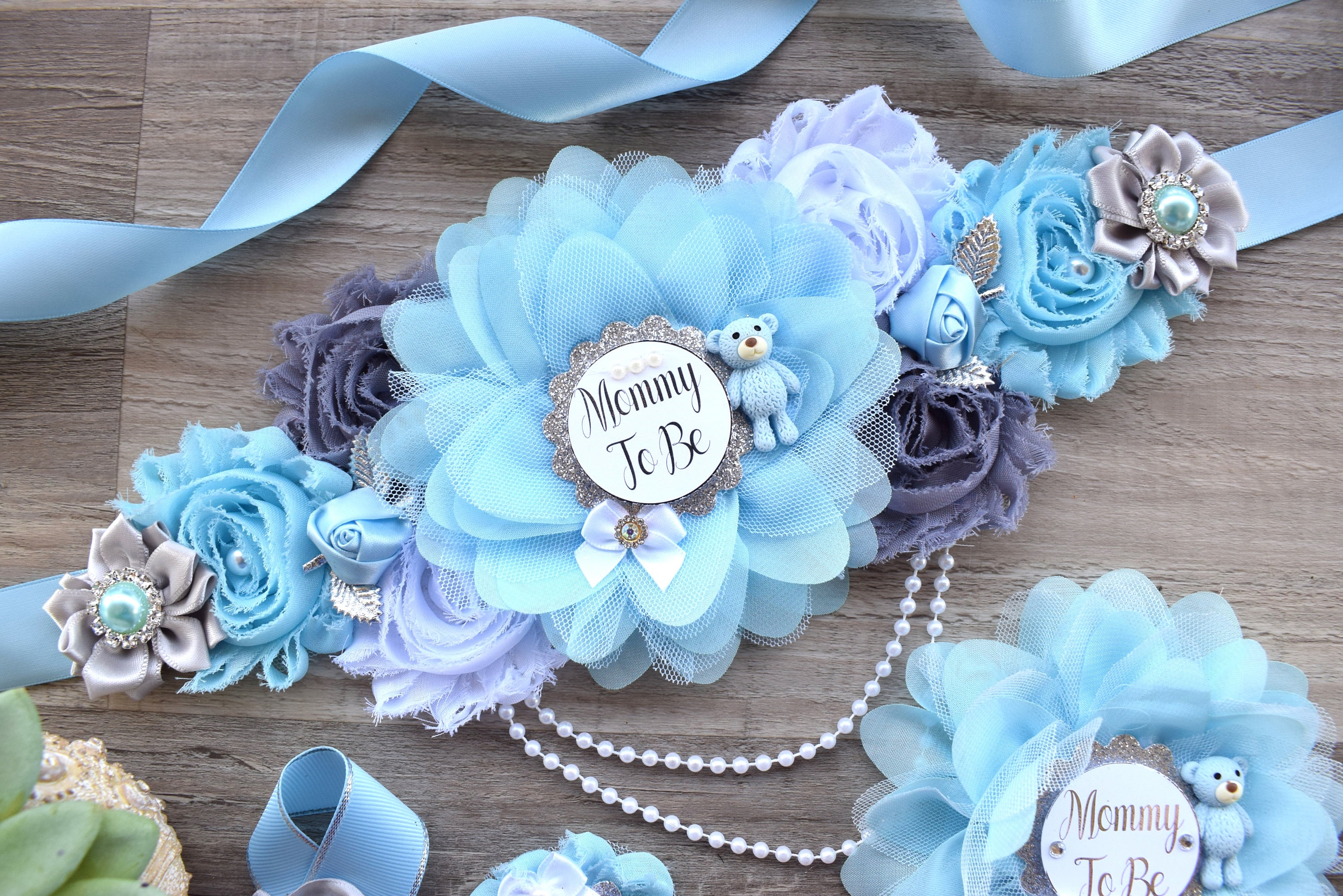 * Maternity Sash: It has eight beautiful flowers in Grey, White & Blue colors embellished with rhinestones and pearls. The ribbon sash is 80'' (2 meters) long.