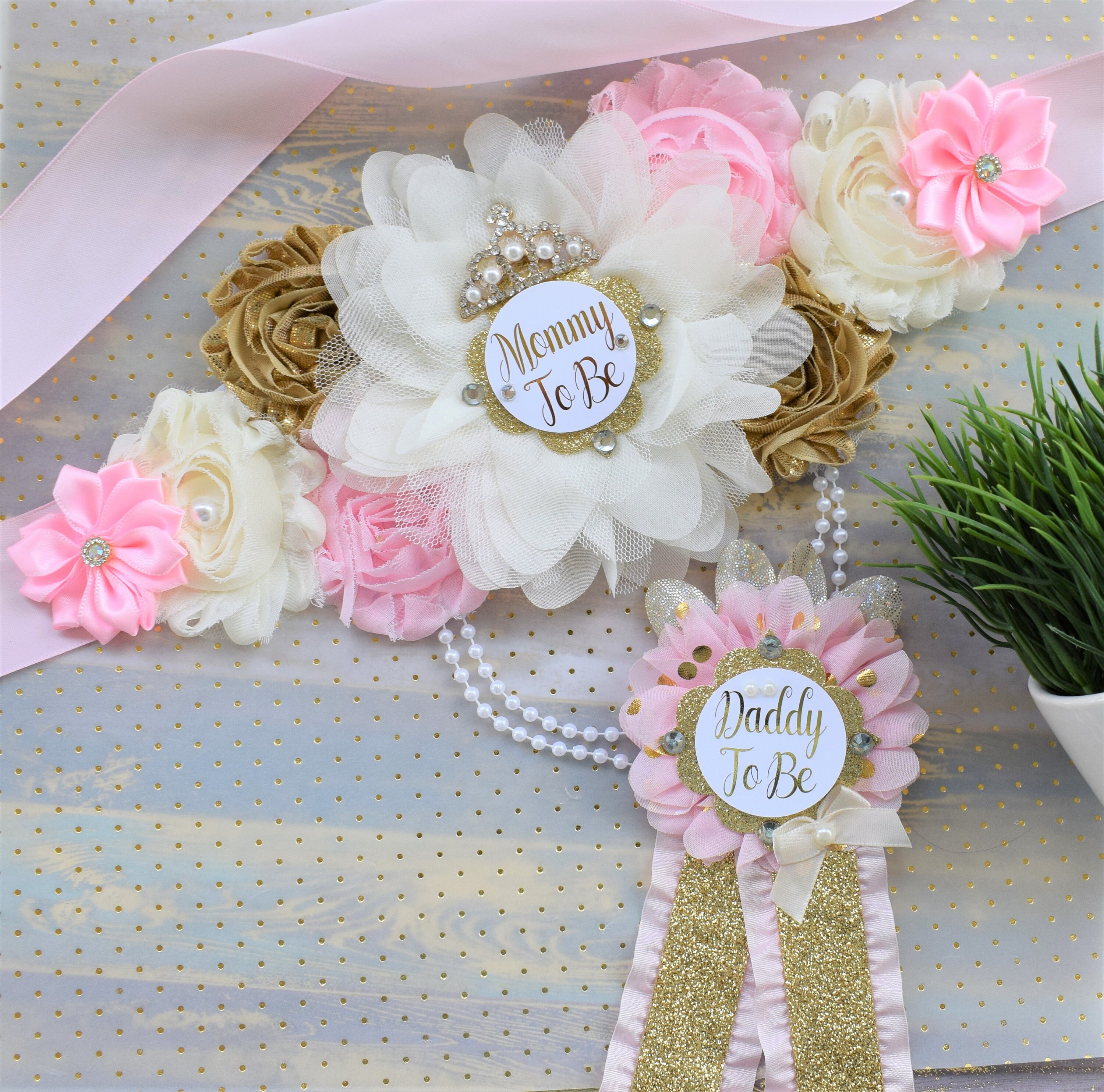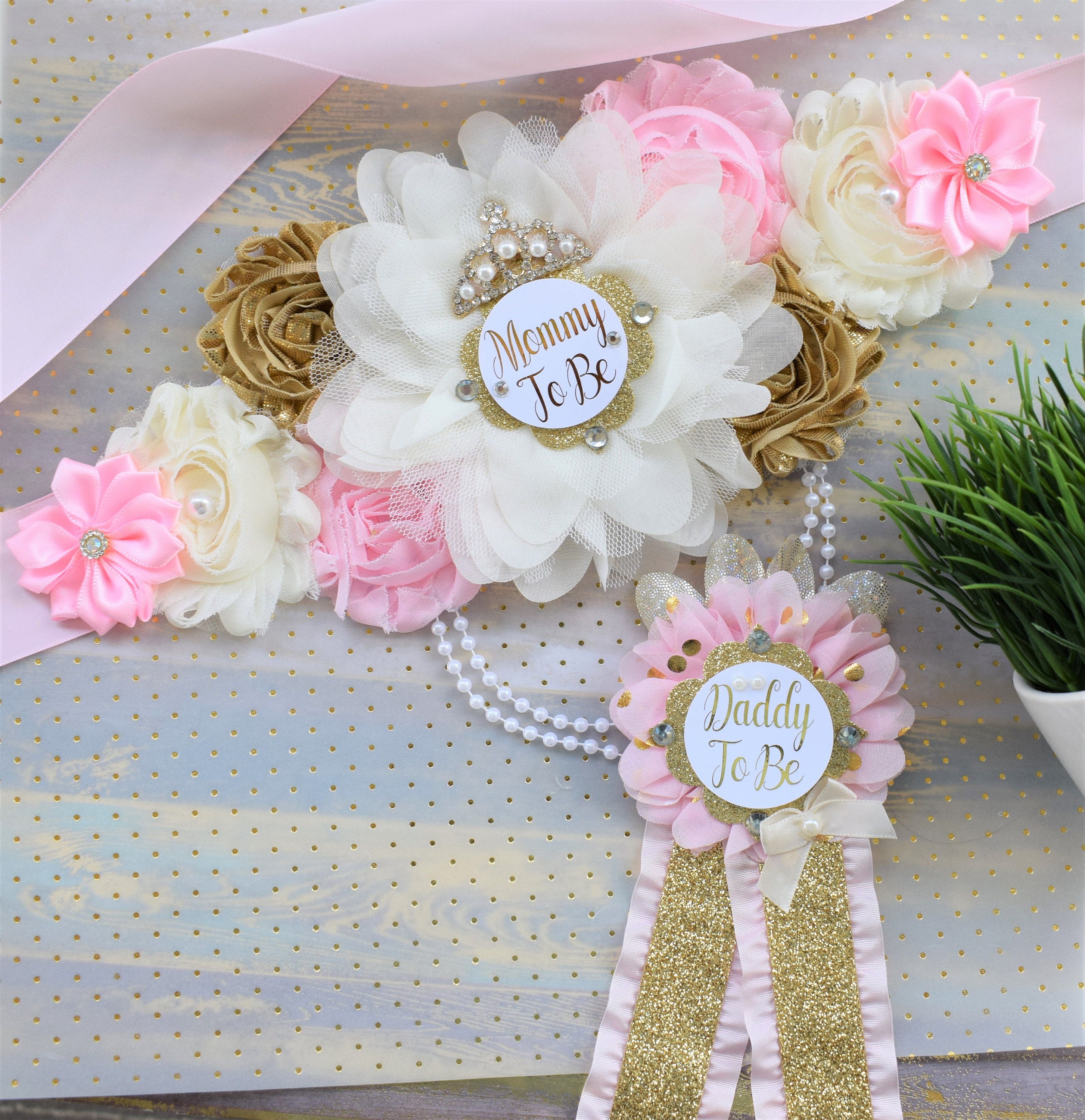This Gold, Ivory & Pink Princess Flower Sash is made especially for a Baby Shower or a Photo Prop.