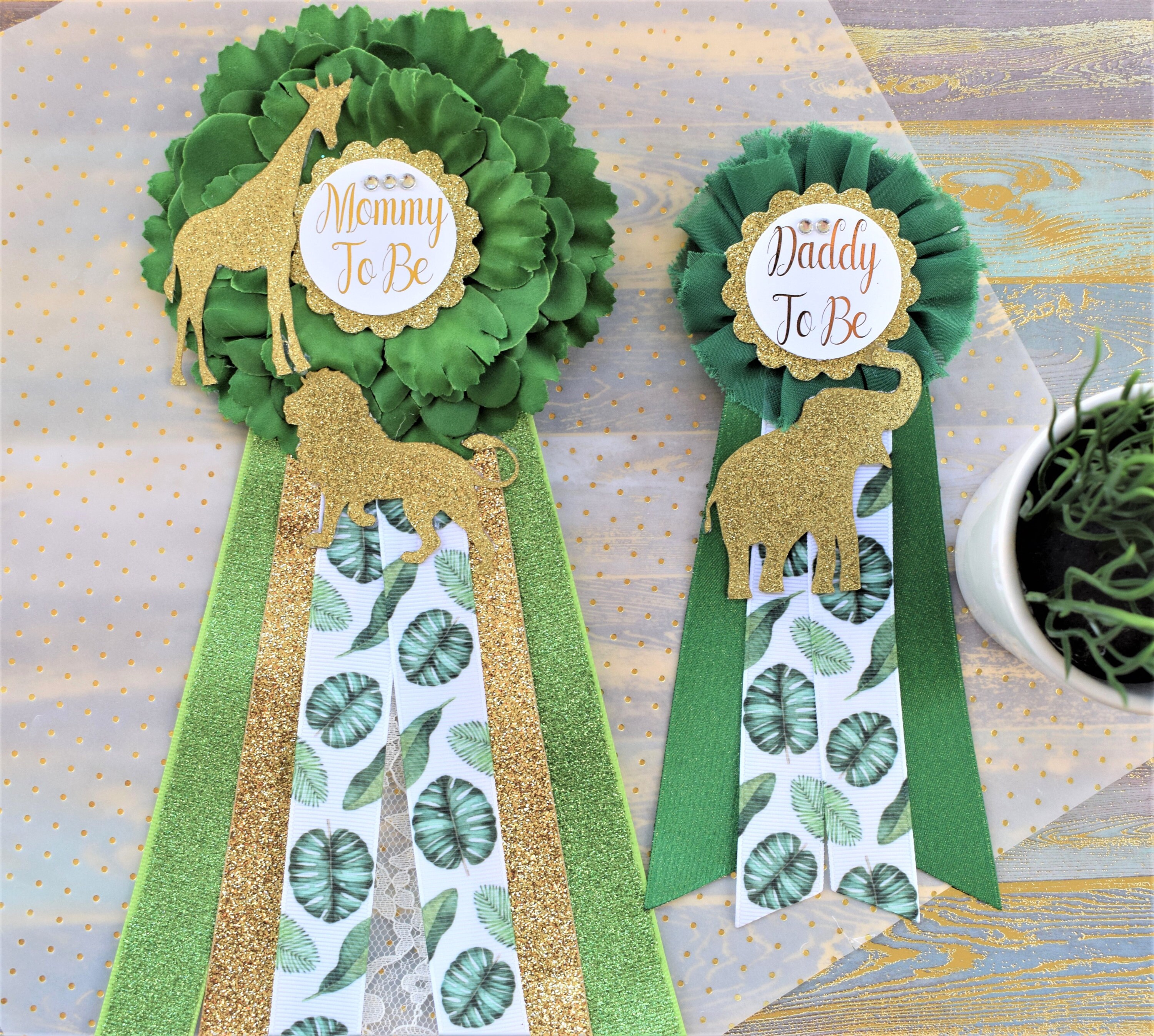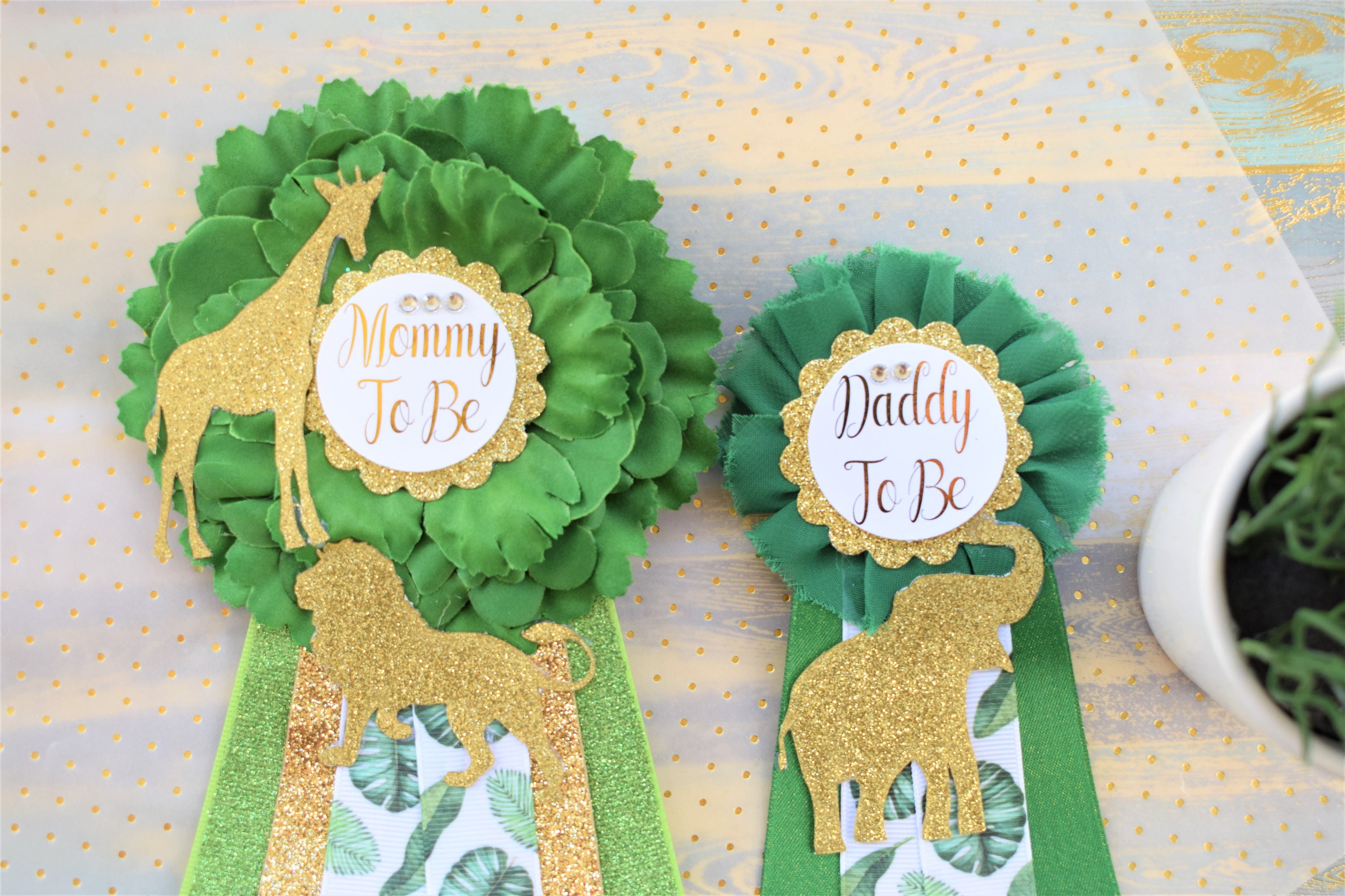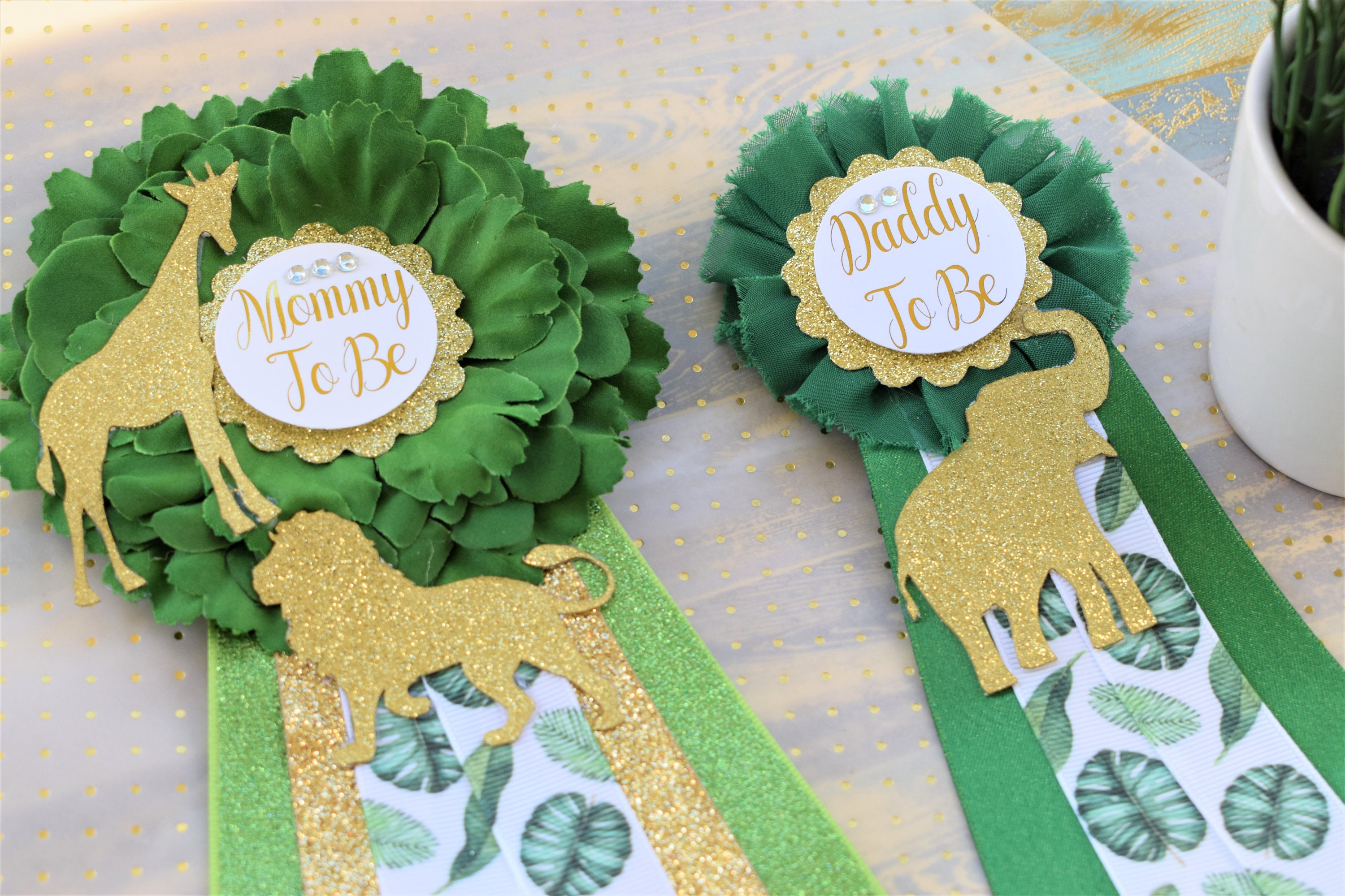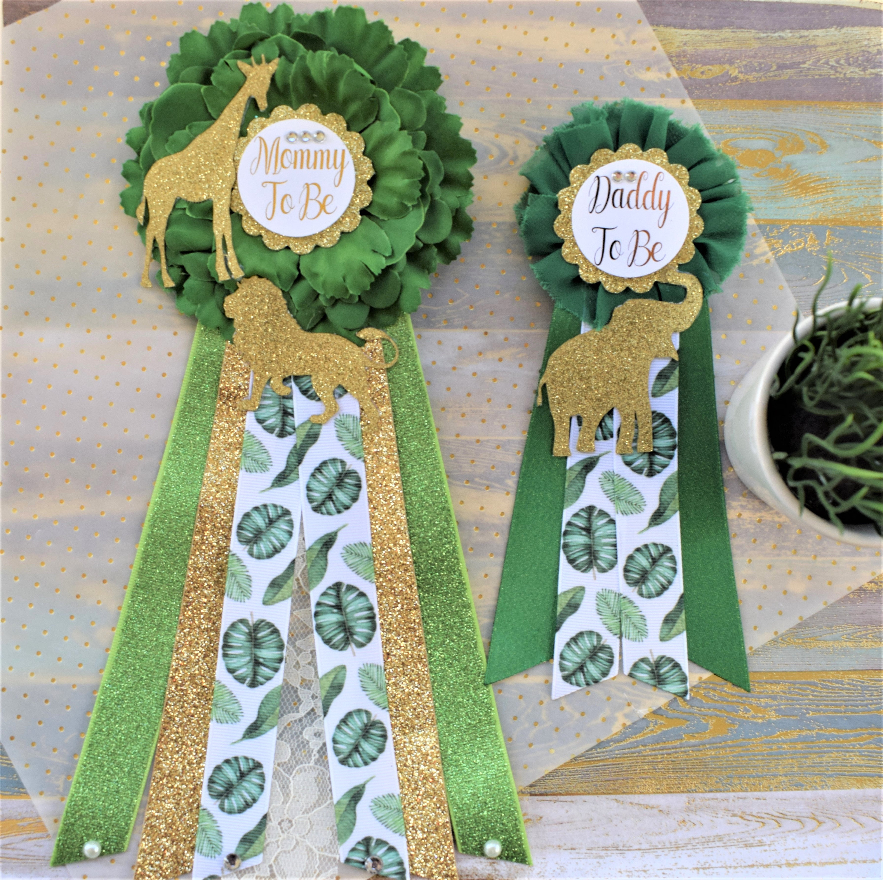 Safari Green Gold Leave Corsage Pins, Gold Safari Animal, Greenery Gold Mommy Pin, Jungle Safari Green Gold Baby Shower, Mommy and Daddy pin