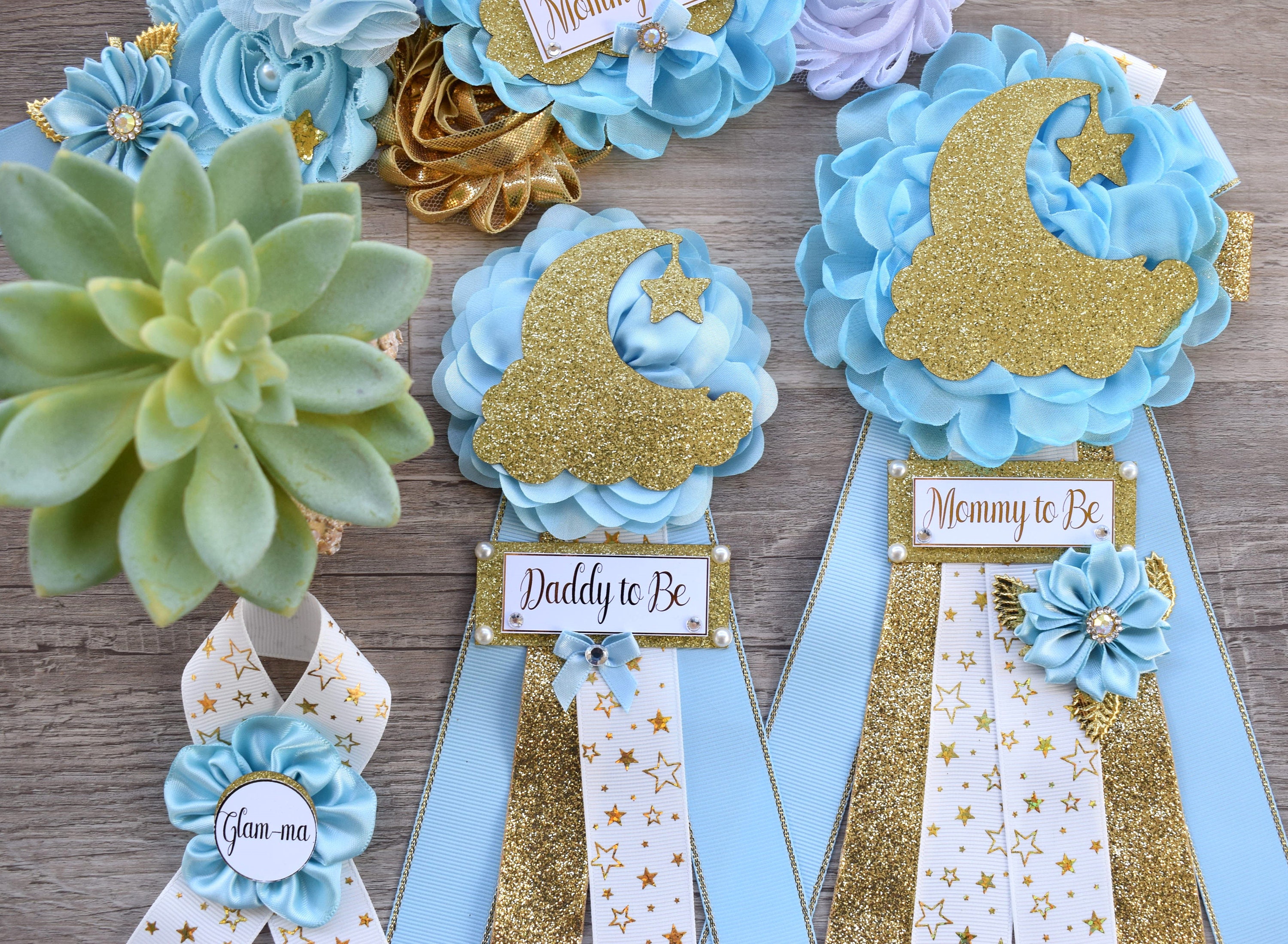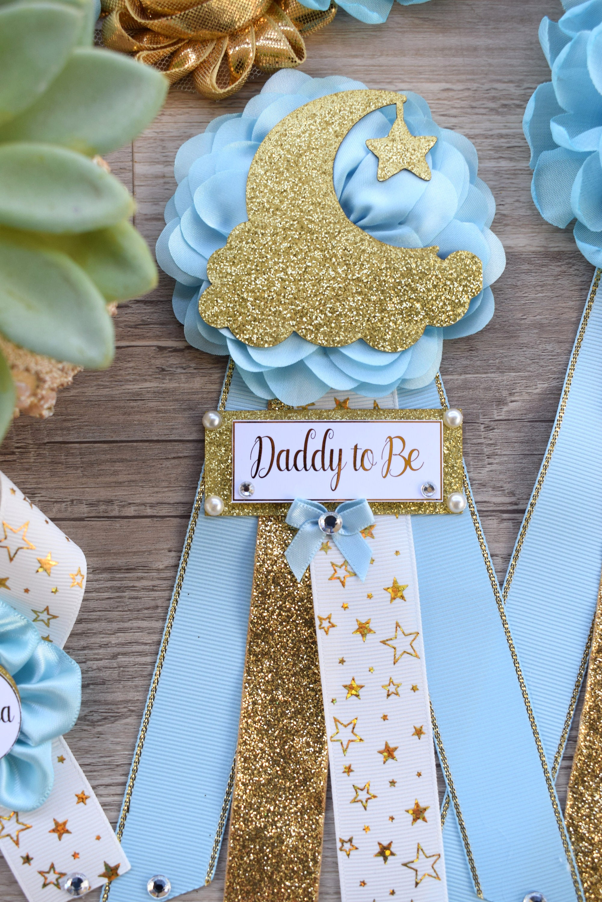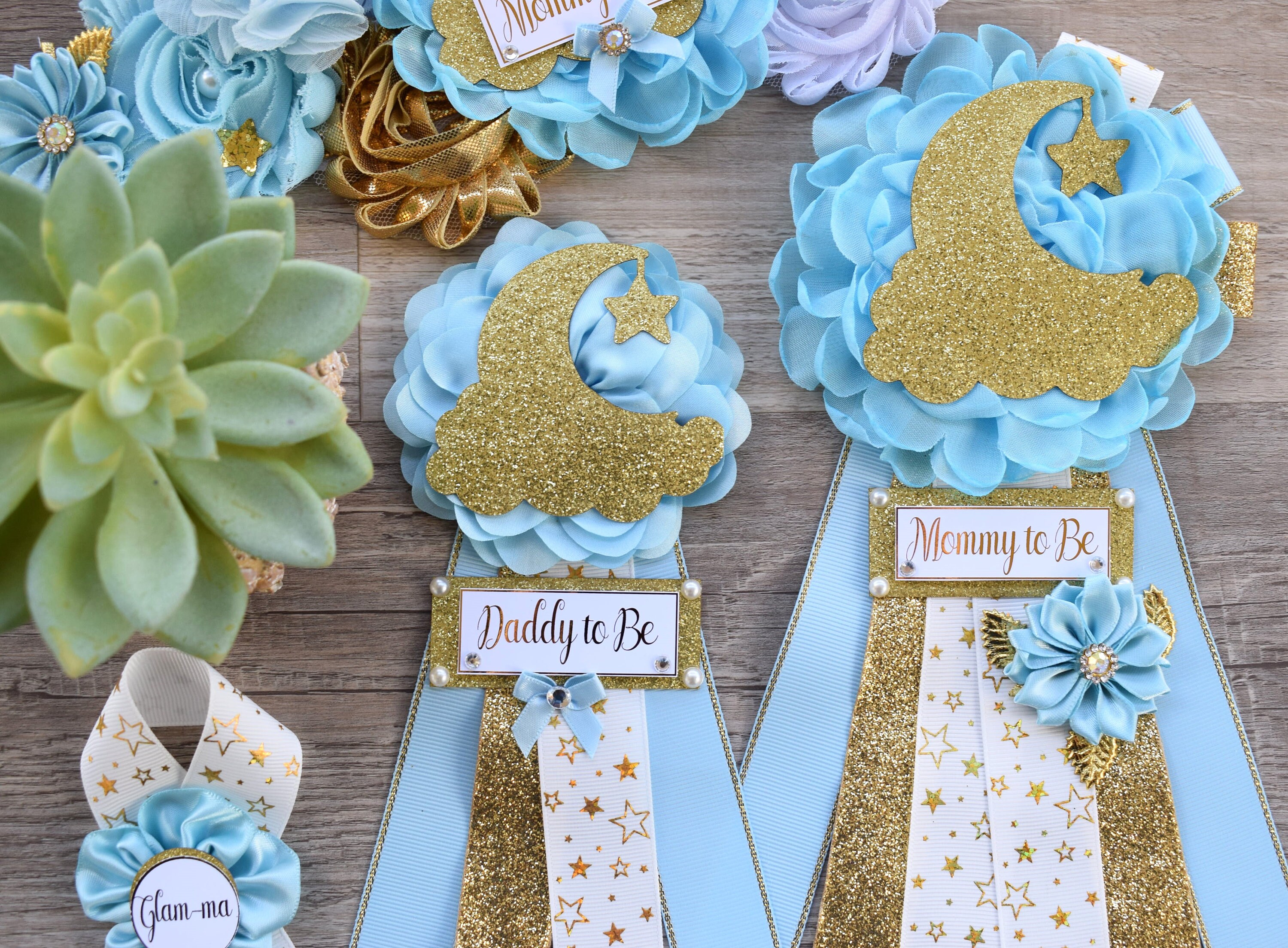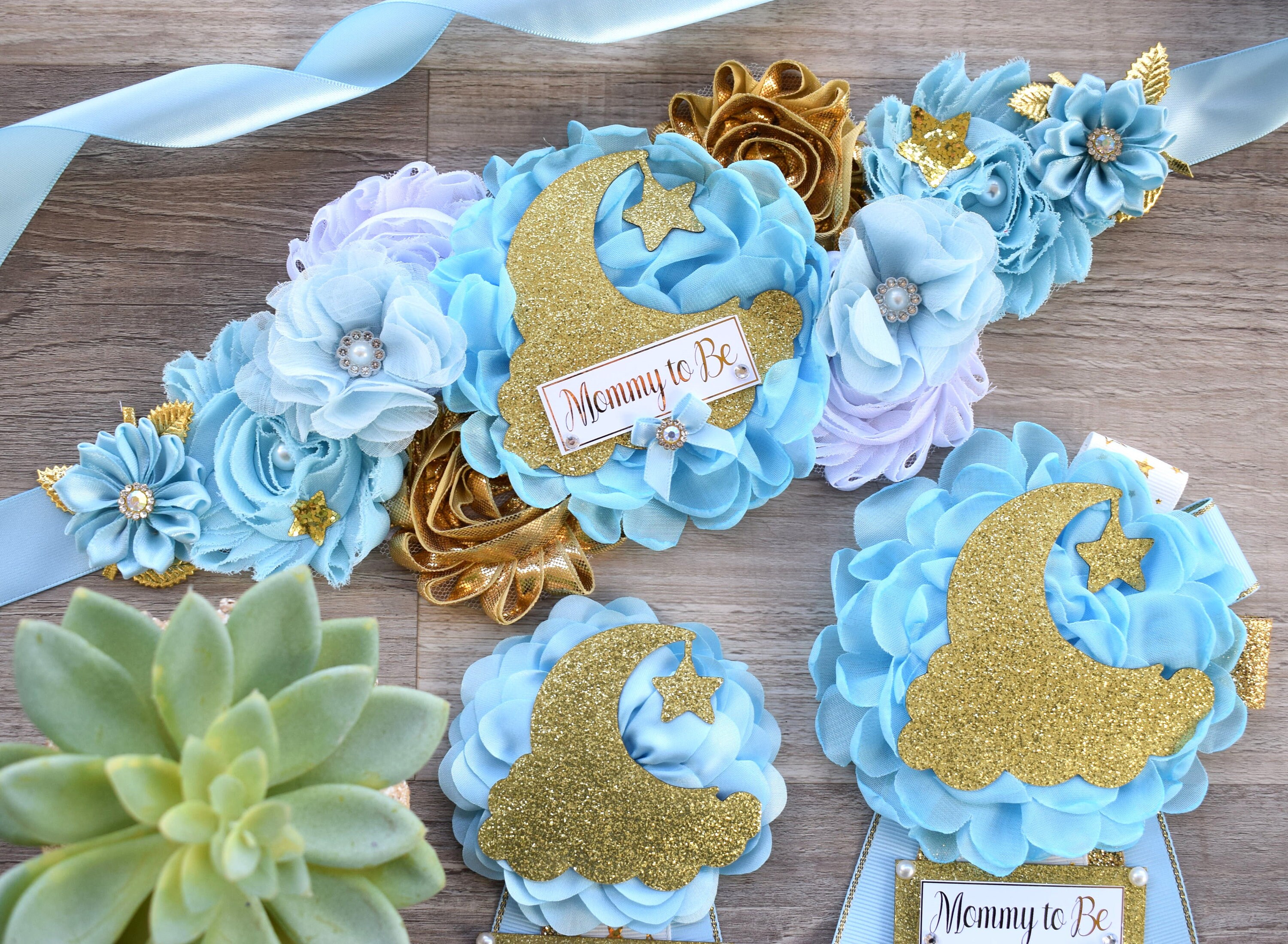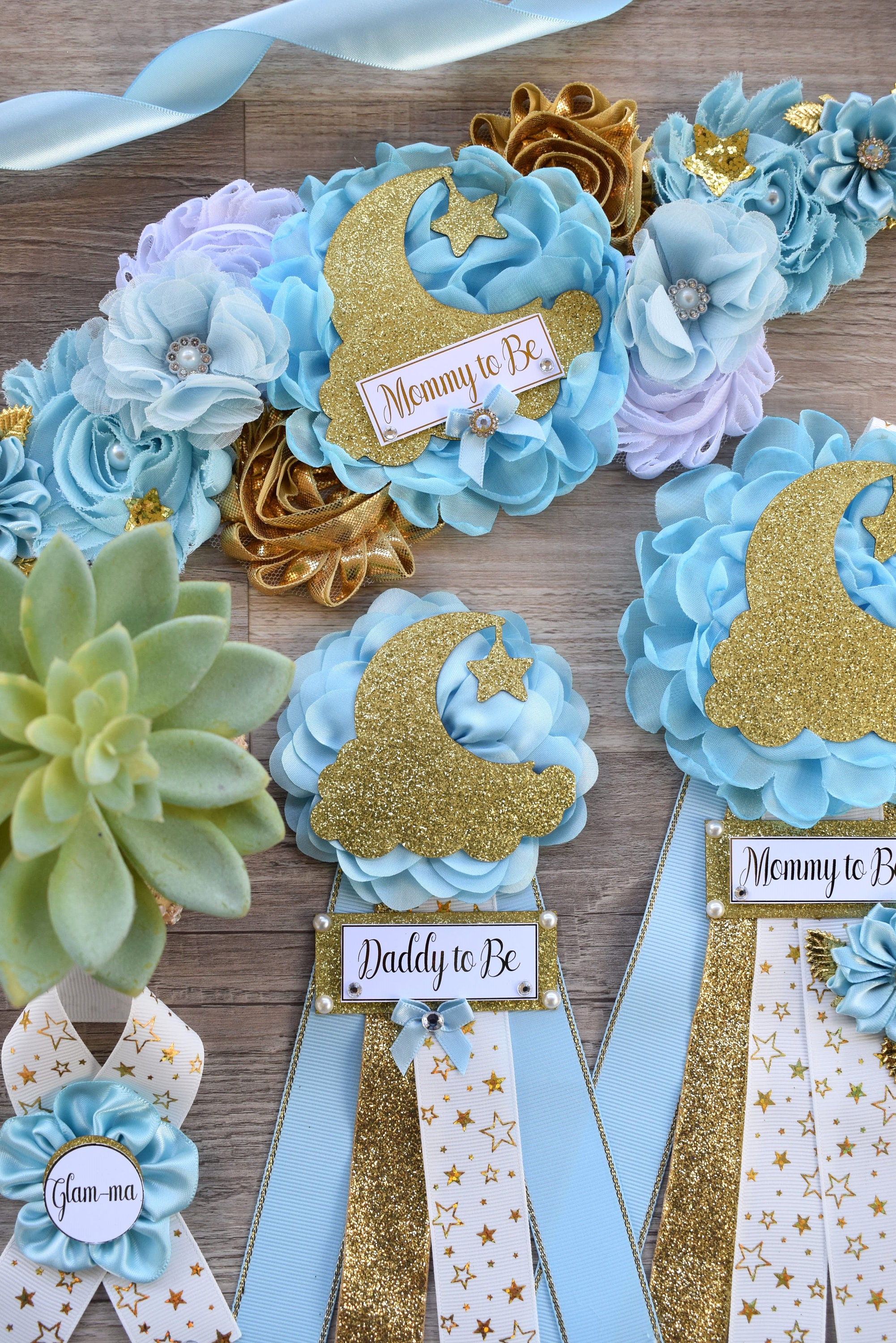 Boy Twinkle Twinkle Little Star Baby Shower, Moon Maternity Sash, Blue White Gold Twinkle Star Mommy To Be Pin, Twinkle Star Daddy To Be Pin