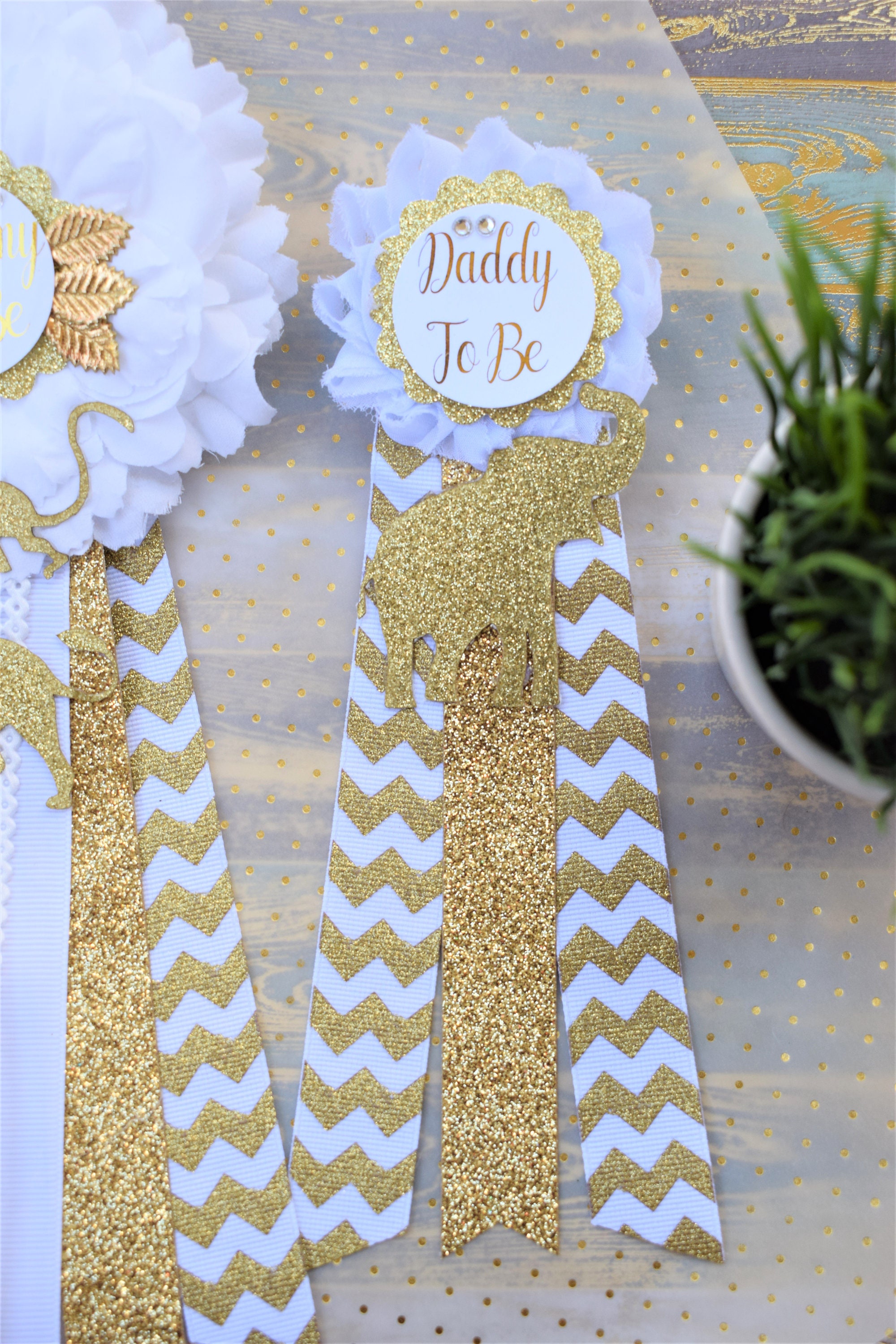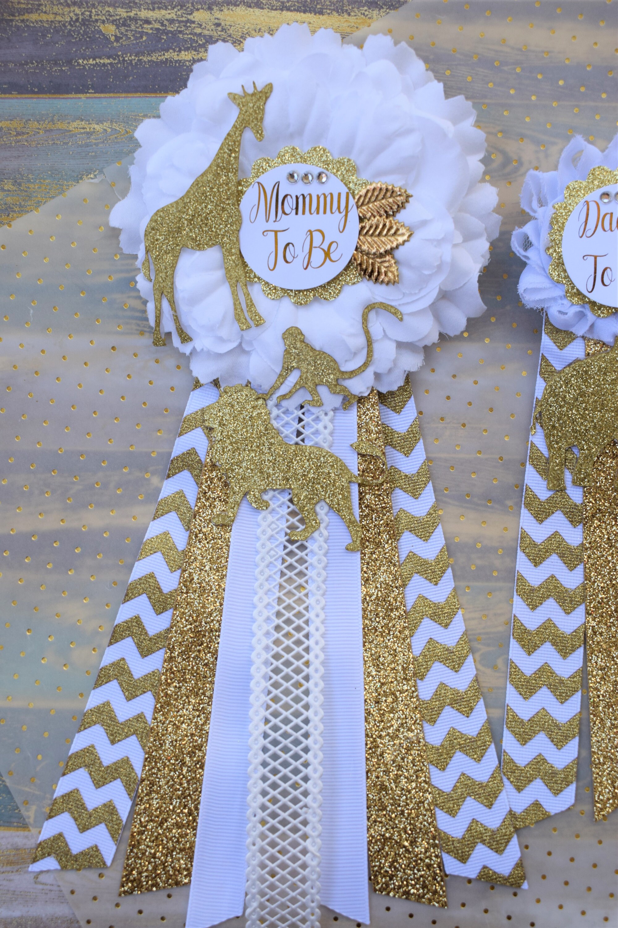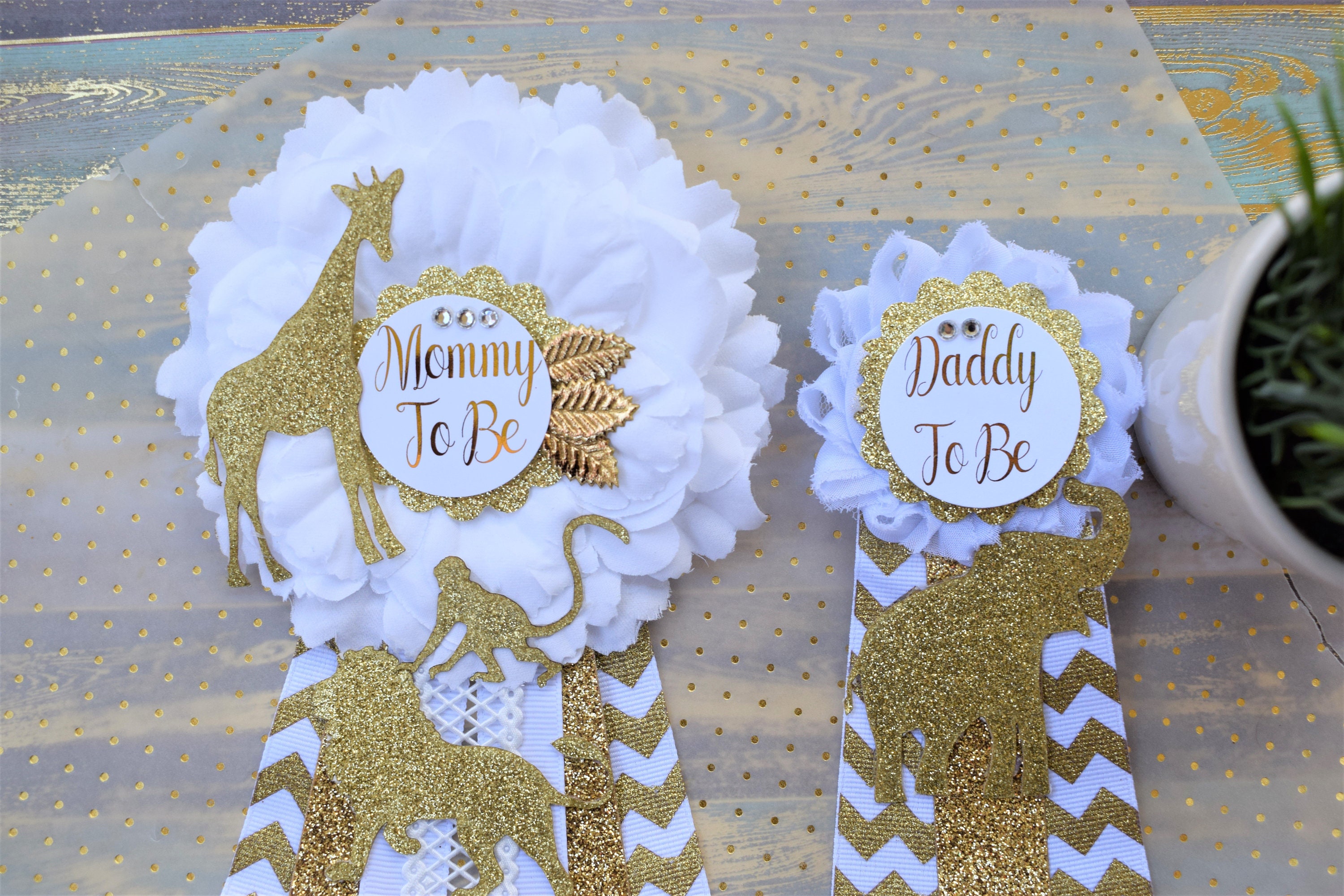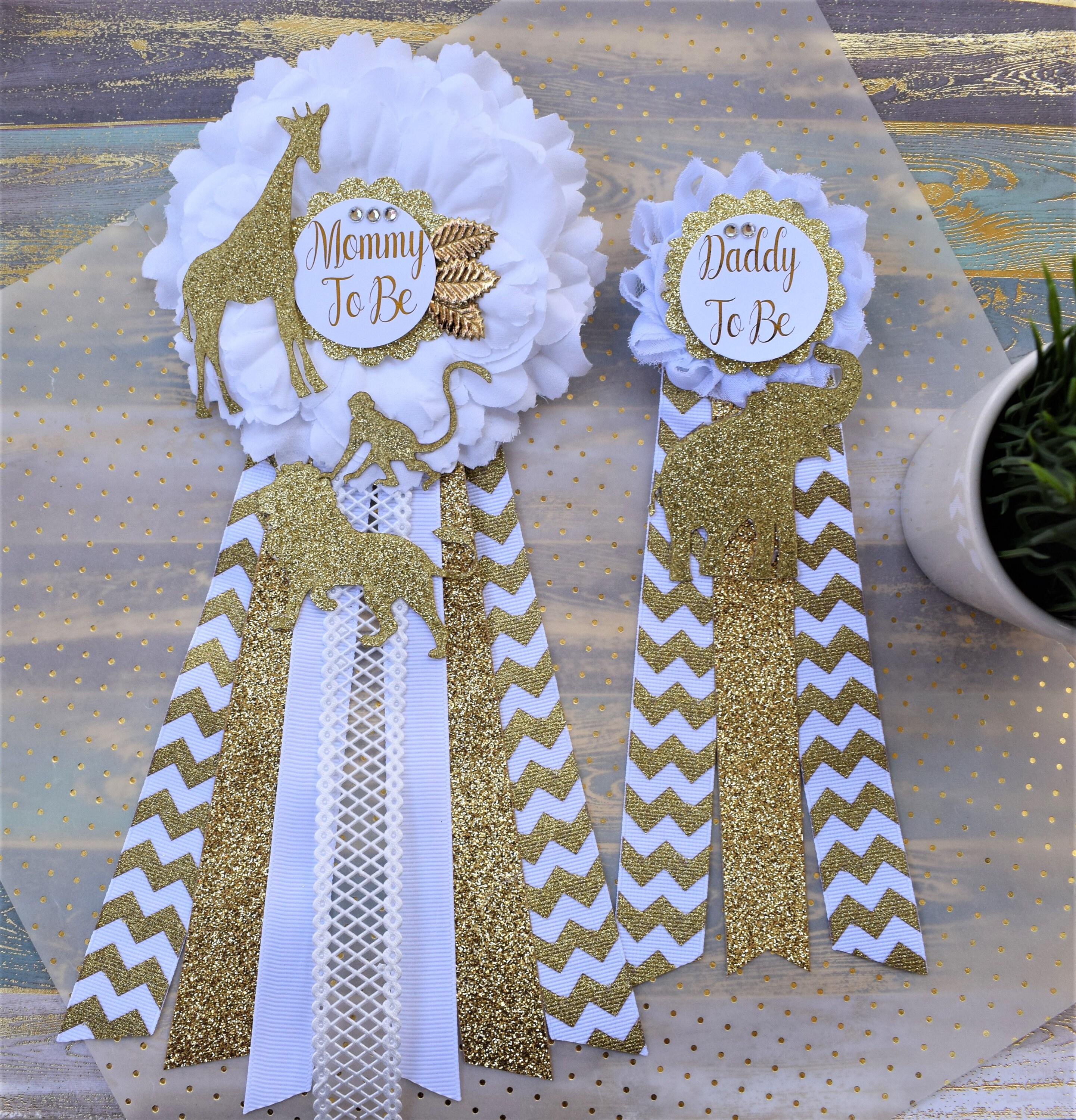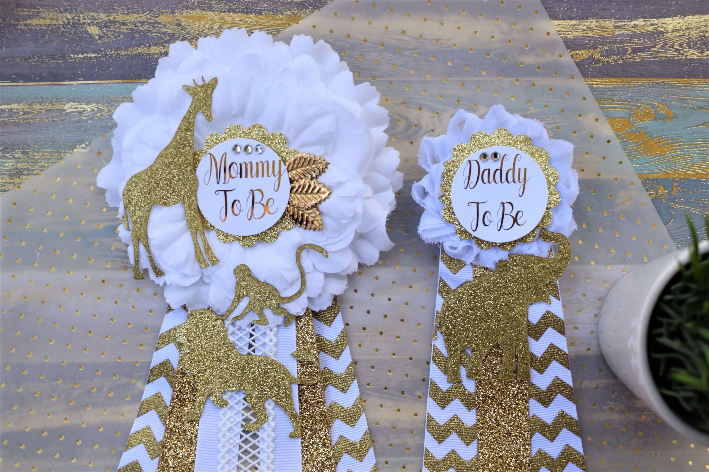This Safari Gold & White Corsage Pins are made especially for a Baby Shower or a Photo Prop.