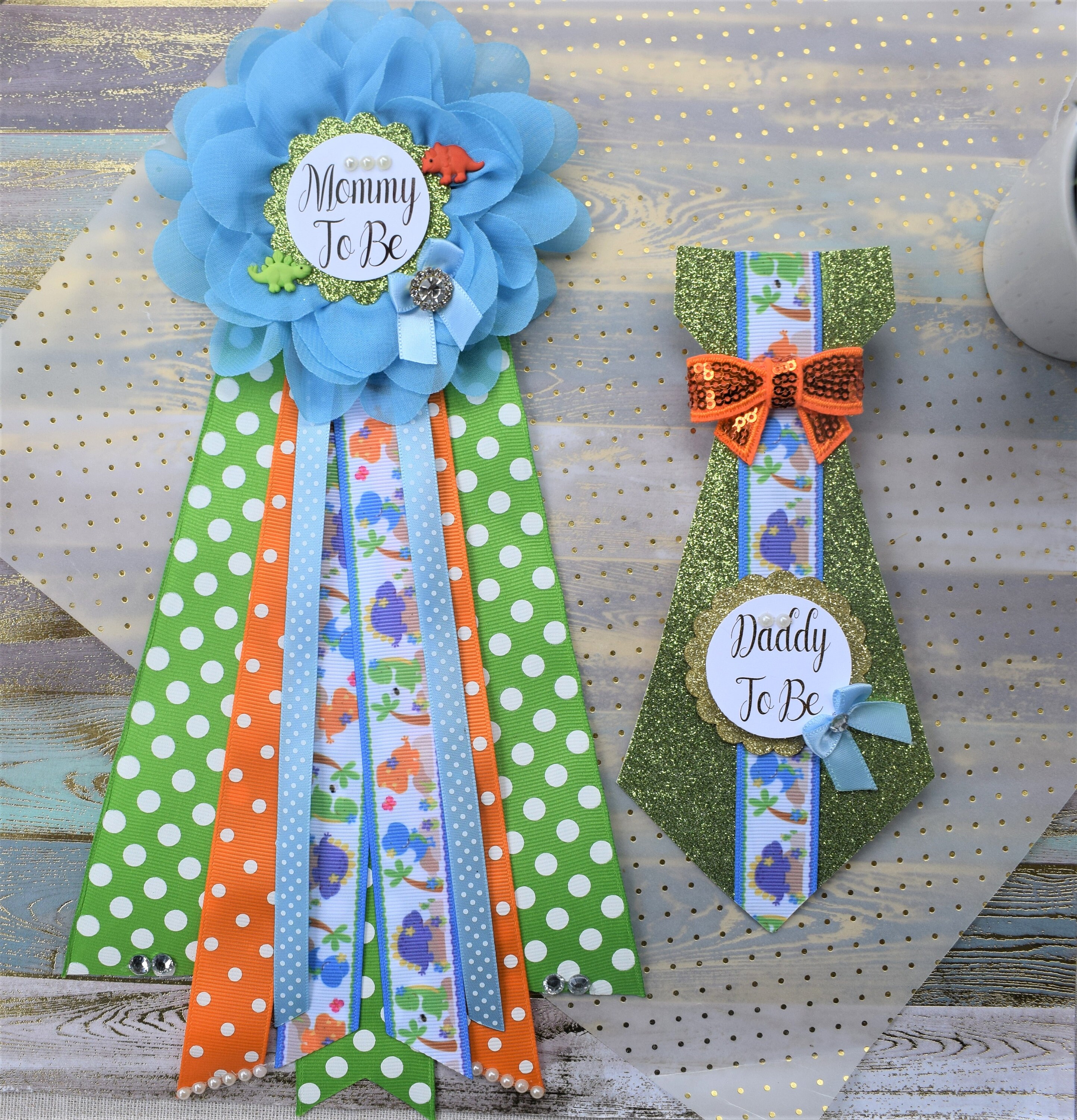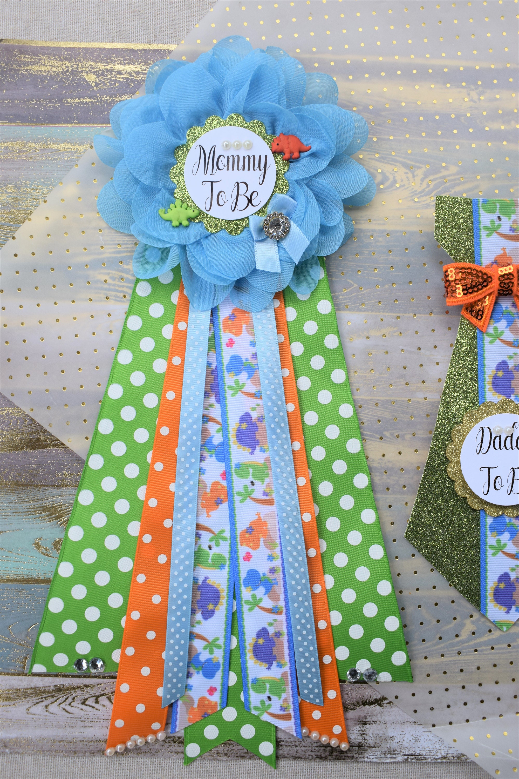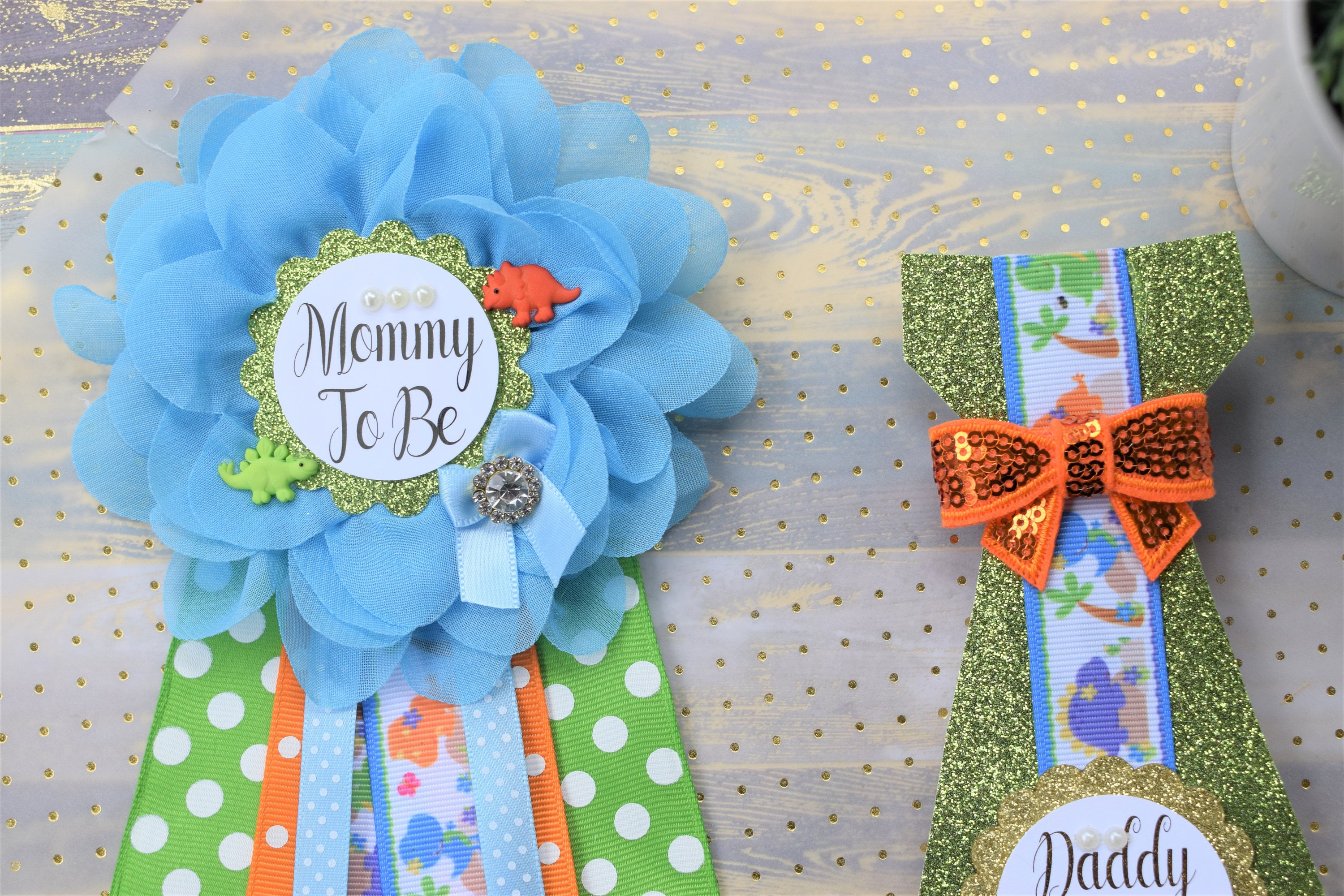 Dinosaur Baby Shower, Dinosaur Corsage Pin Set, Dinosaur Mommy to Be, Dinosaur Daddy to Be, Mamasaurus, Dinosaur Orange Green Blue, Custom