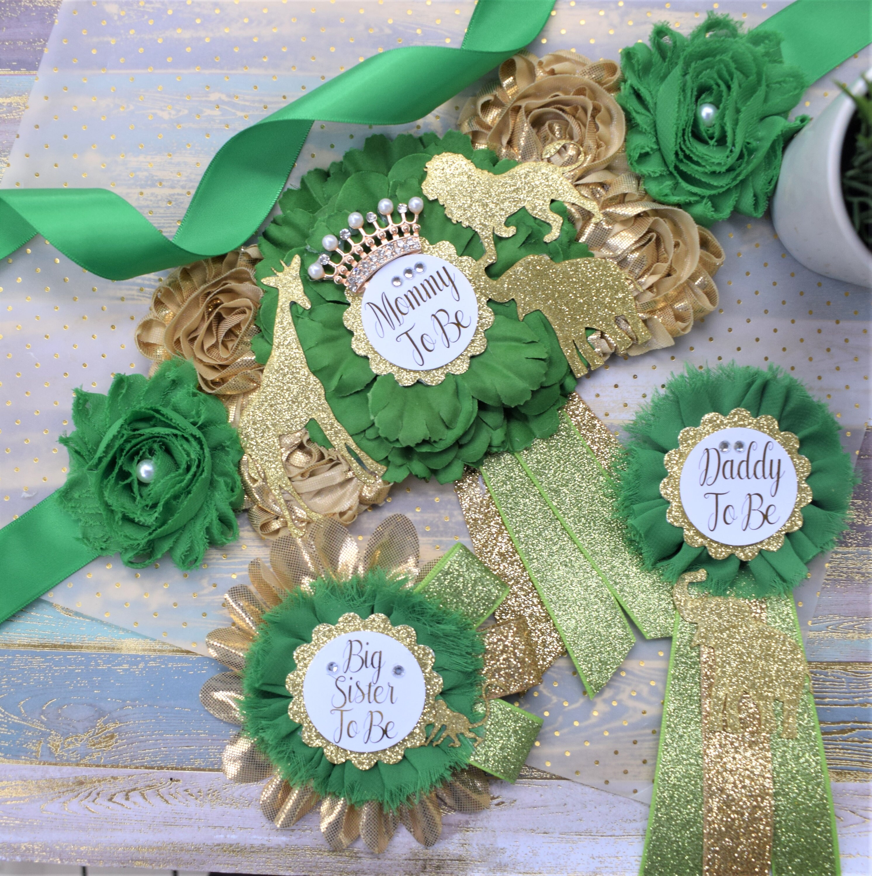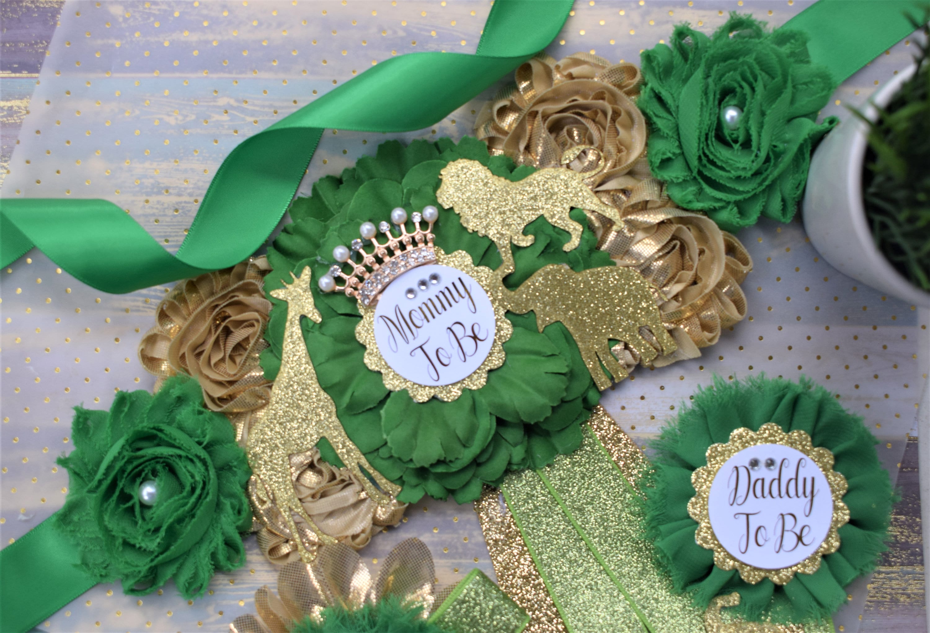 Safari Green Gold Flower Sash, Gold Safari Animals, Greenery Gold Maternity Sash, Jungle Safari Green Gold Baby Shower, Mommy pin, Daddy pin