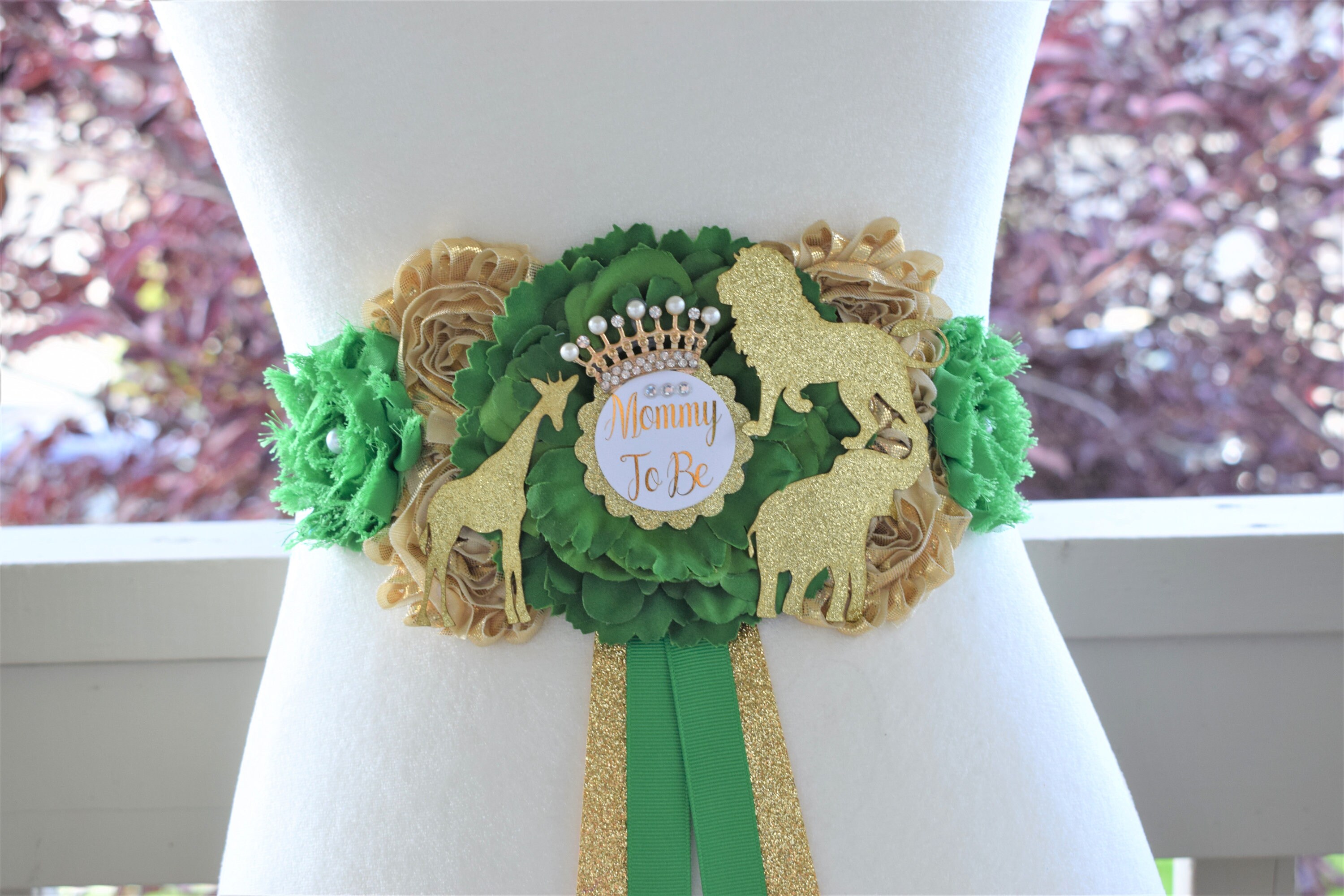 This Safari Gold & Green Flower Sash is made especially for a Baby Shower or a Photo Prop.