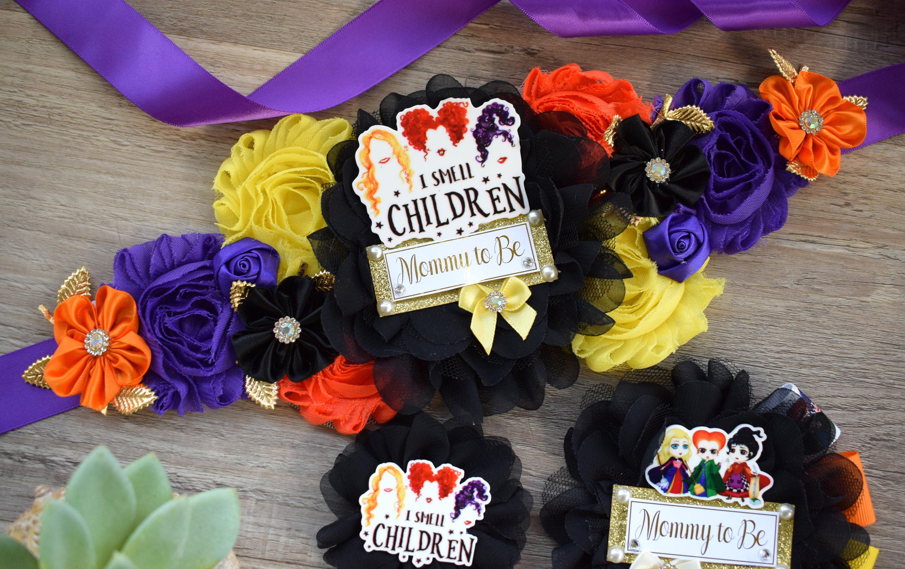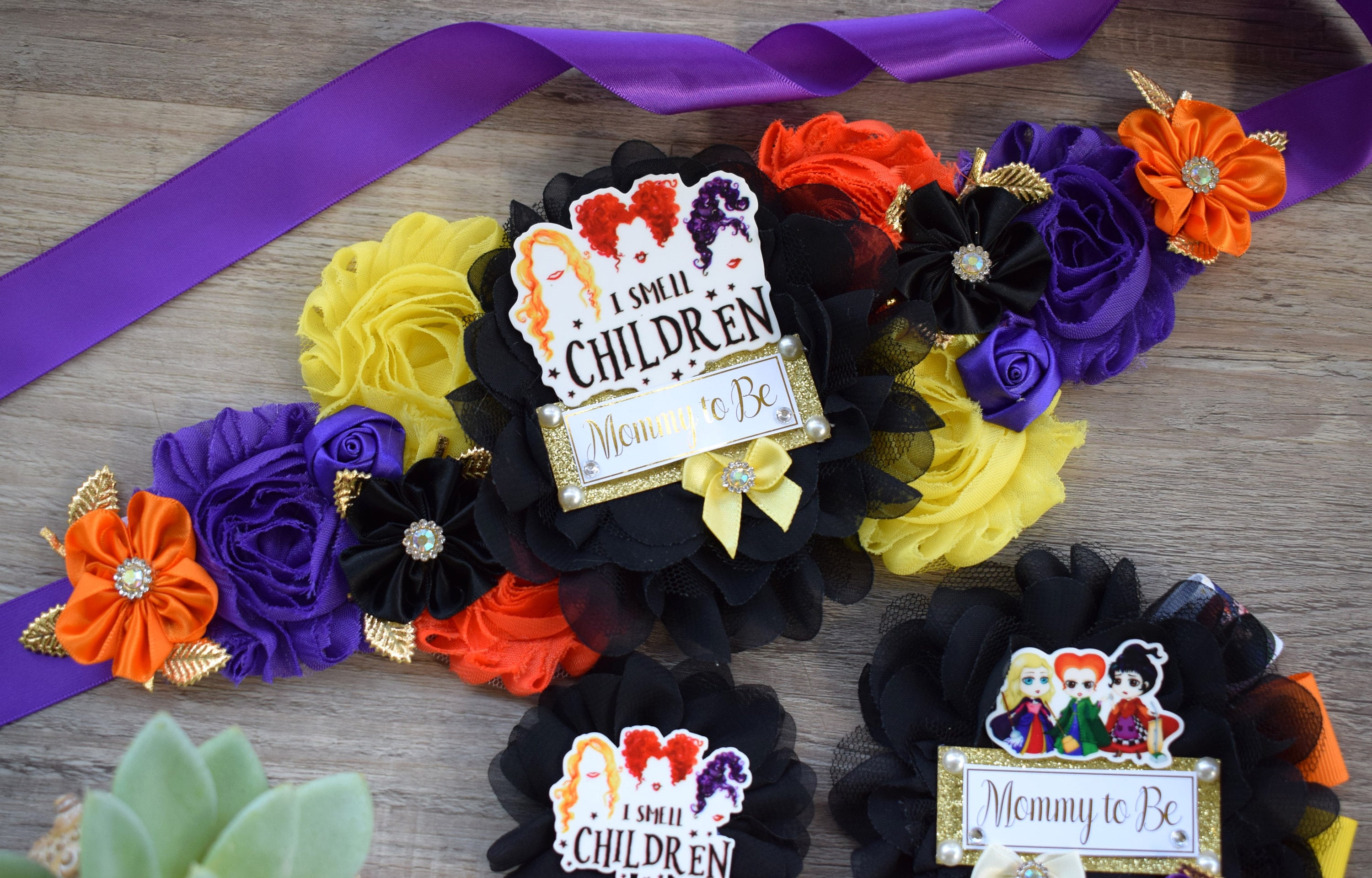 ☆ Maternity Sash: It has eleven beautiful flowers in Black, Orange, Yellow & Purple colors embellished with rhinestones and pearls. The ribbon sash is 80'' (2 meters) long.