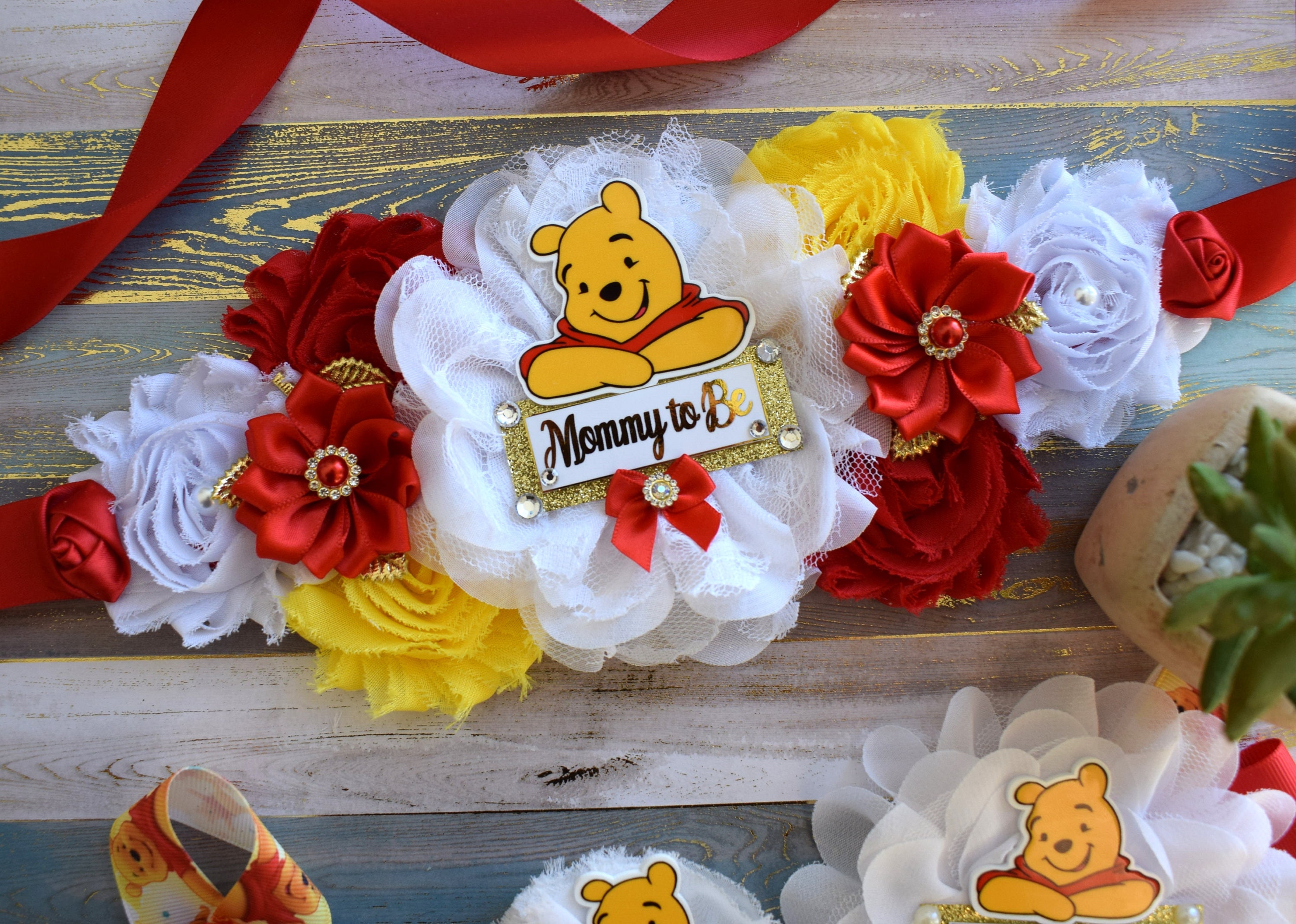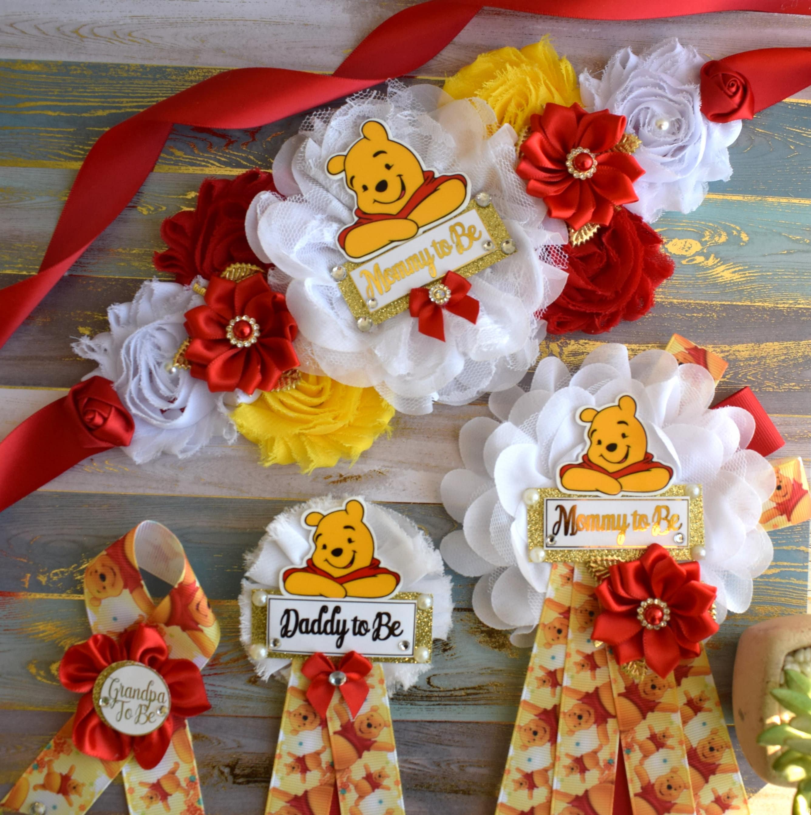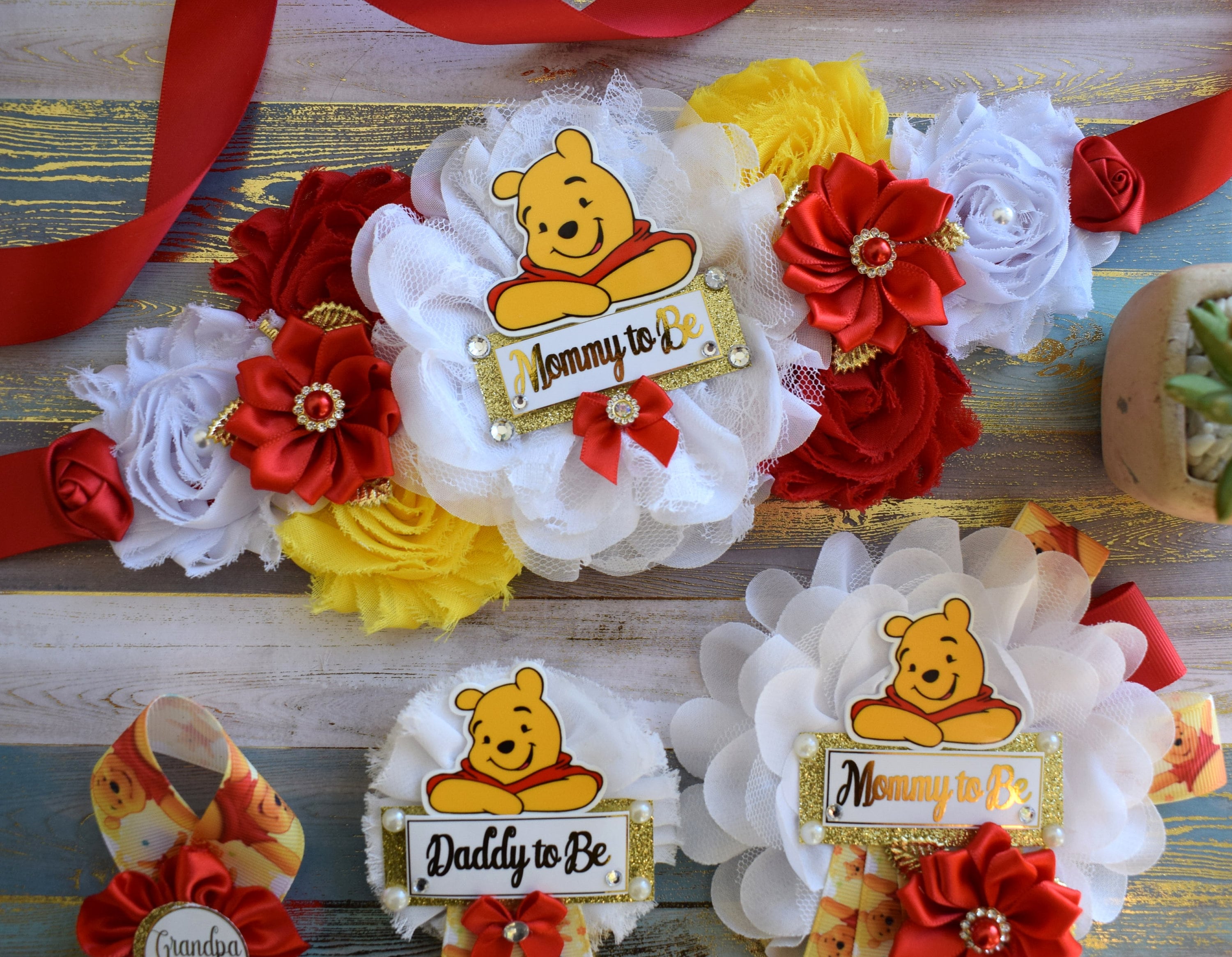 Winnie the Pooh Baby Shower Sash, Winnie the Pooh Maternity Sash, Winnie the Pooh, Winnie the Pooh Mommy and Daddy Pin, Winnie Flower Sash