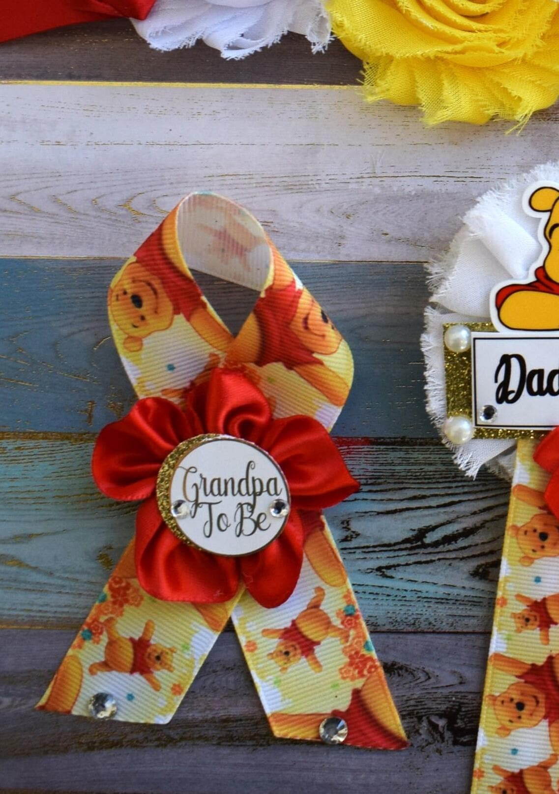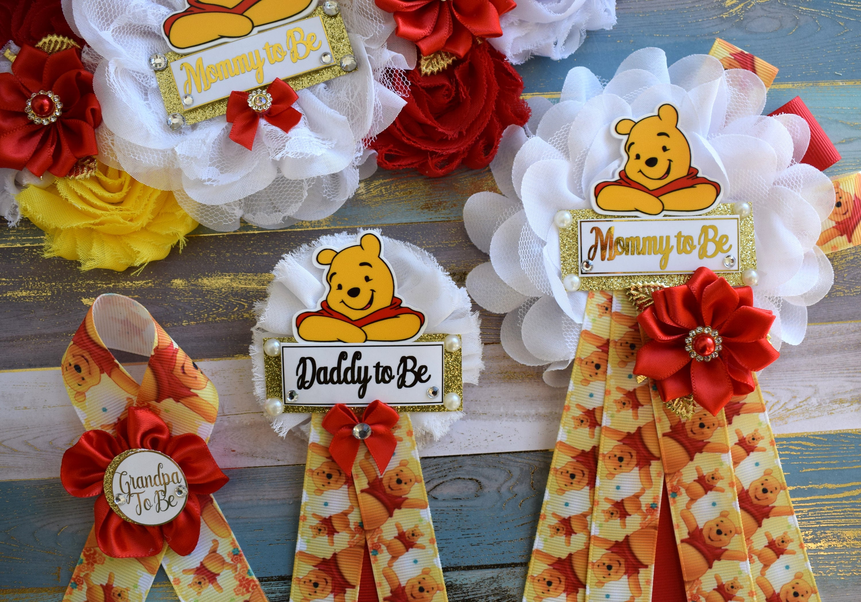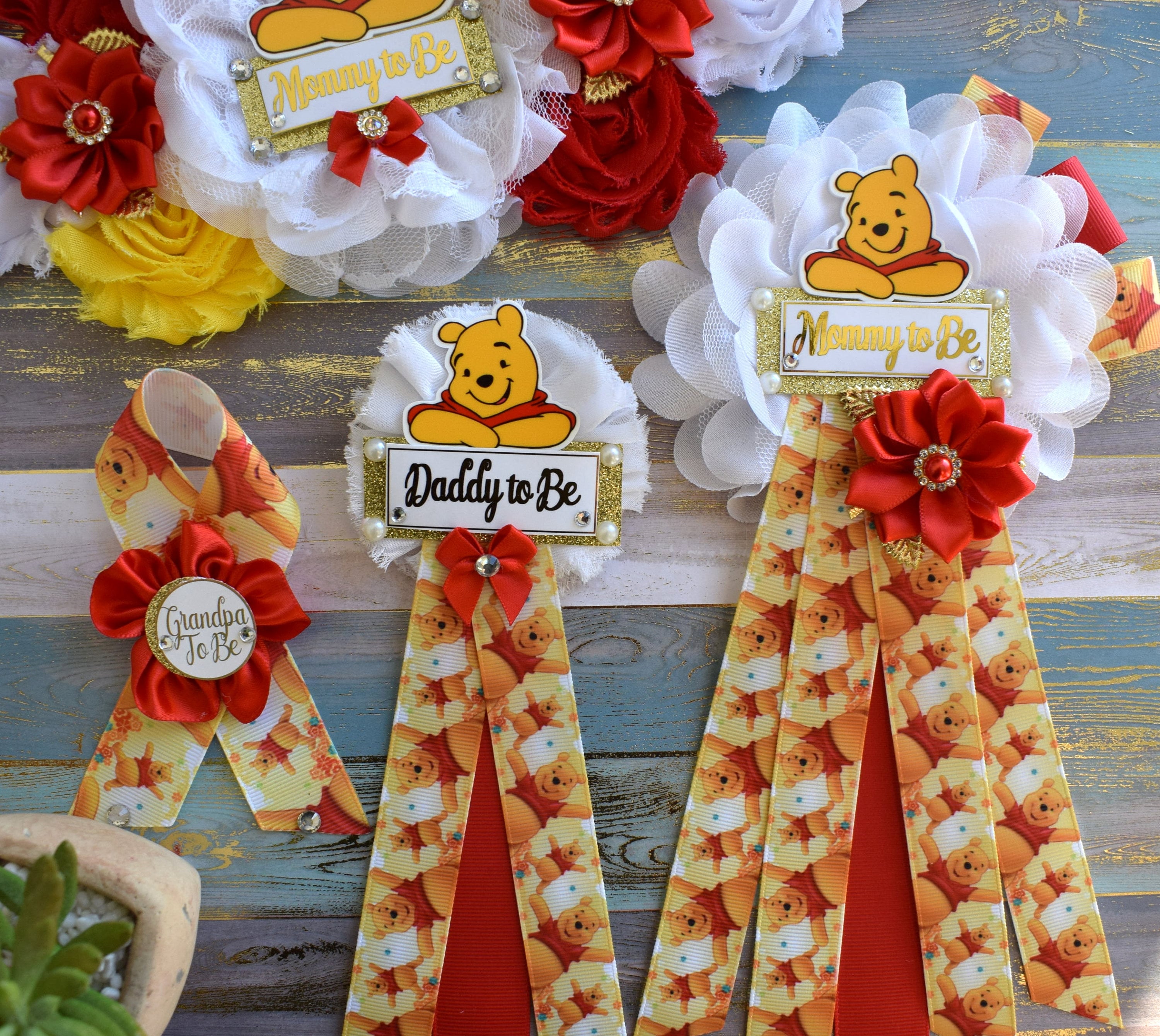 Winnie the Pooh Baby Shower Sash, Winnie the Pooh Maternity Sash, Winnie the Pooh, Winnie the Pooh Mommy and Daddy Pin, Winnie Flower Sash