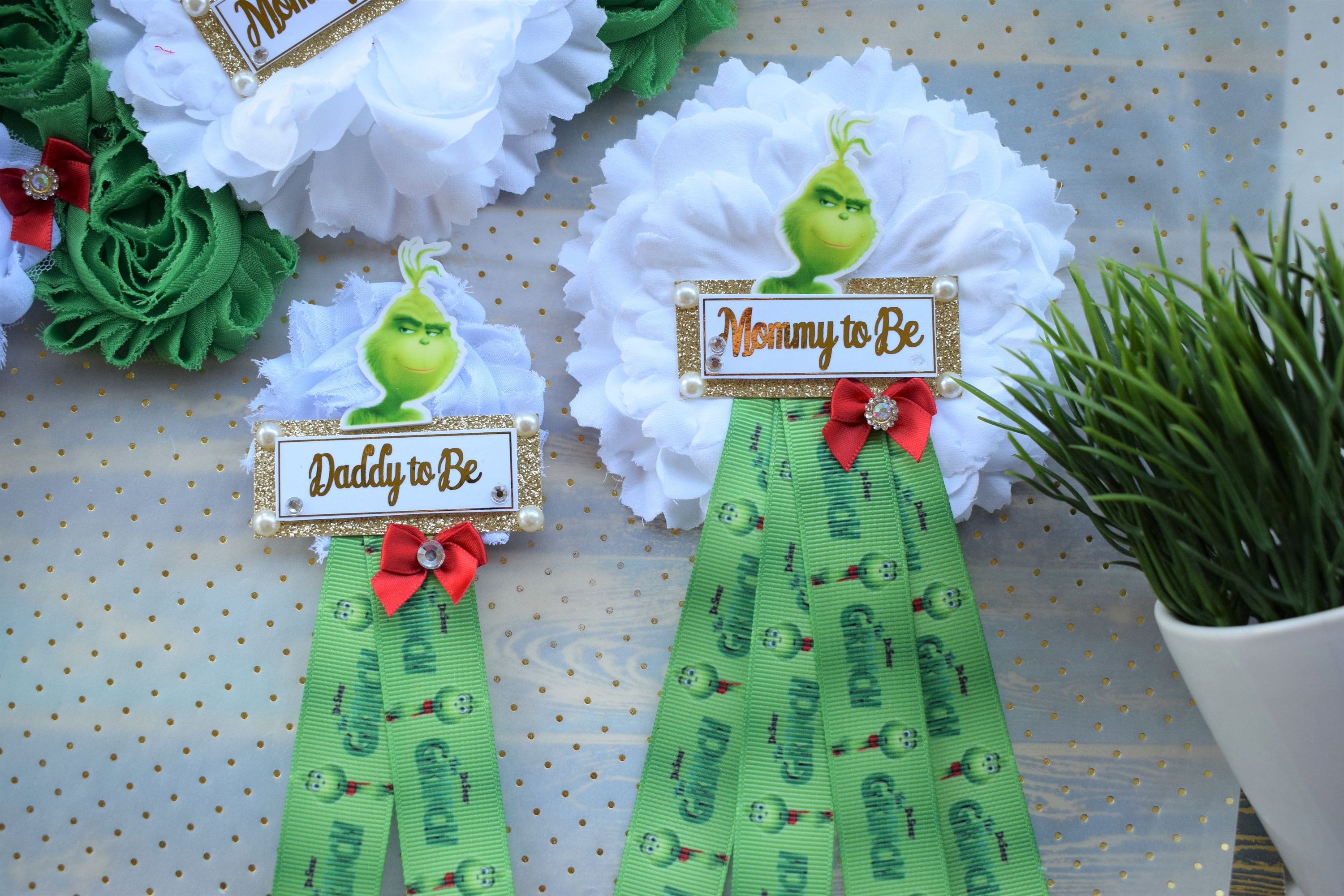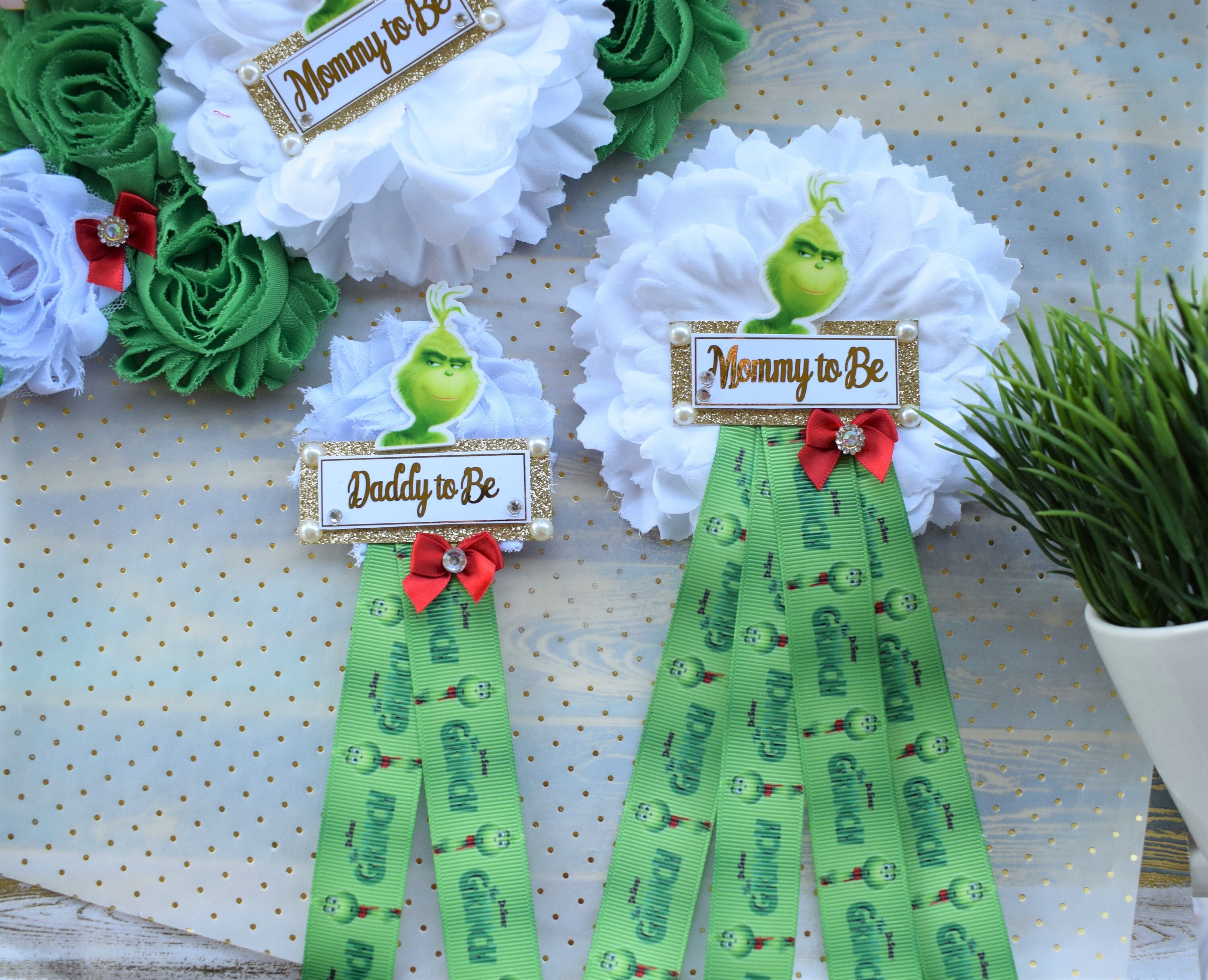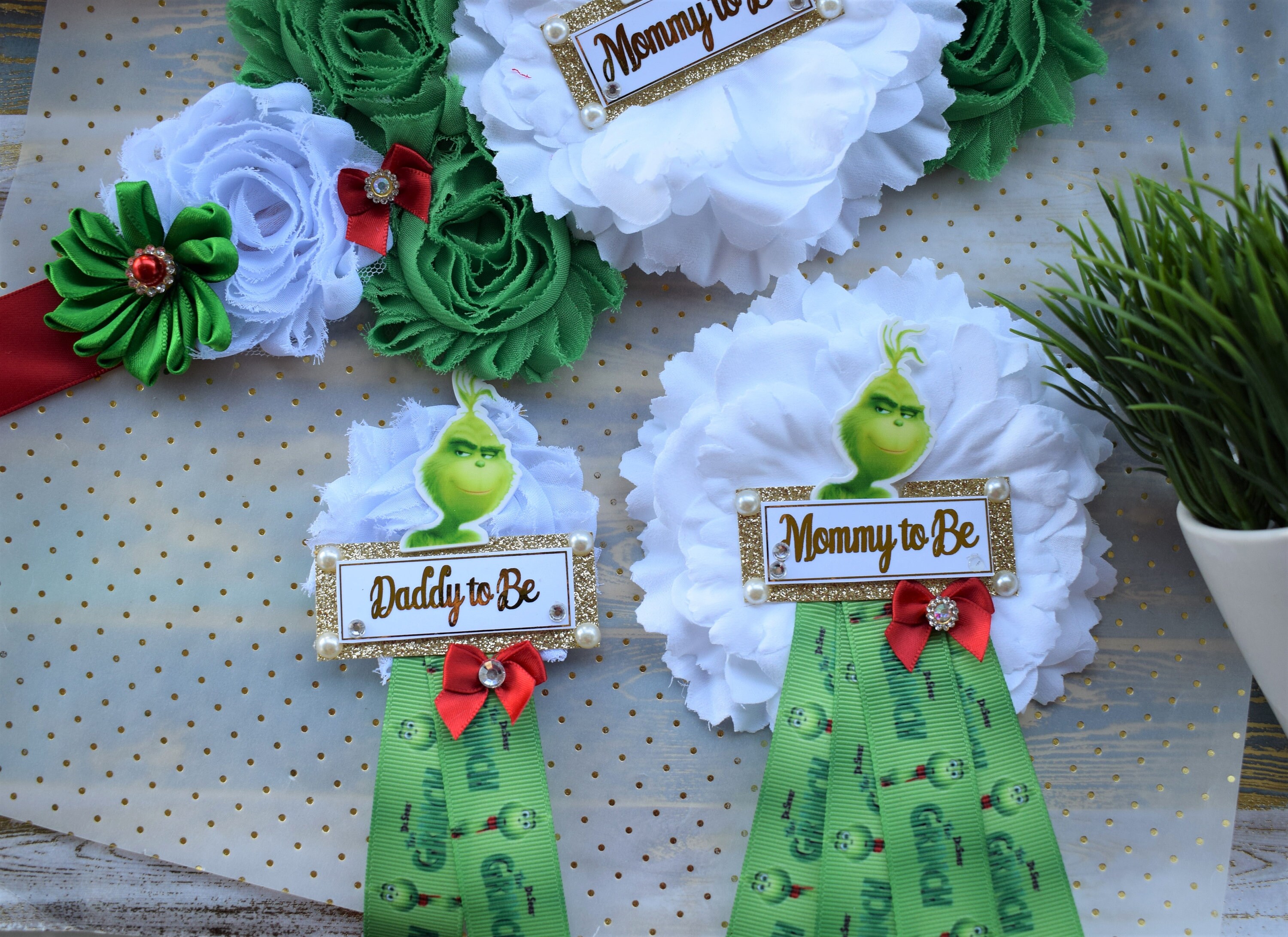Grinch Baby Shower Set, Christmas Maternity Sash, Red Green Mommy To Be Pin, Daddy To Be Pin, Baby Shower Gift, Custom Order Welcome