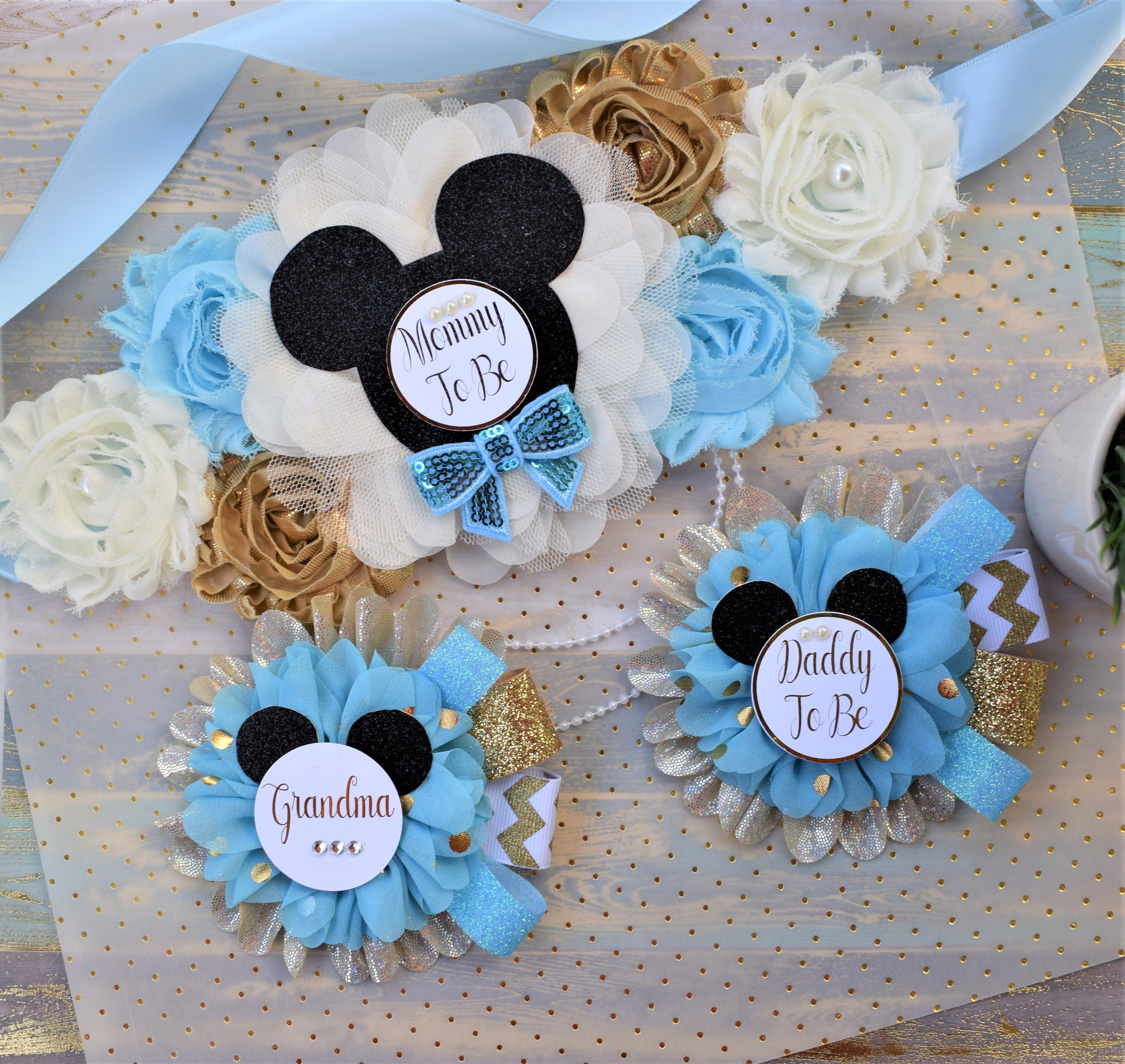 * Maternity Sash: It has nine beautiful flowers in baby blue, cream and navy blue colors embellished with rhinestones and pearls. The ribbon sash is 80'' (2 meters) long.