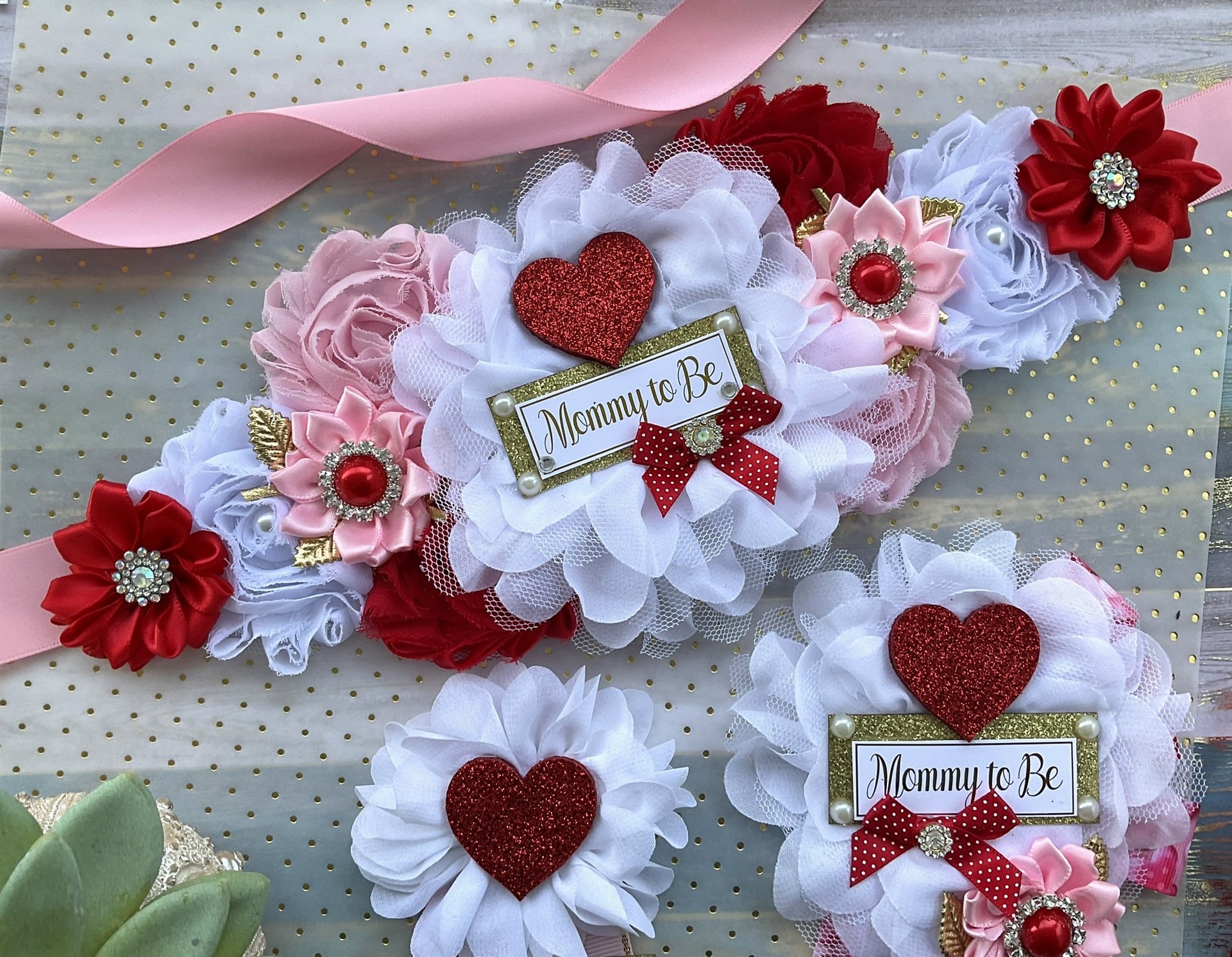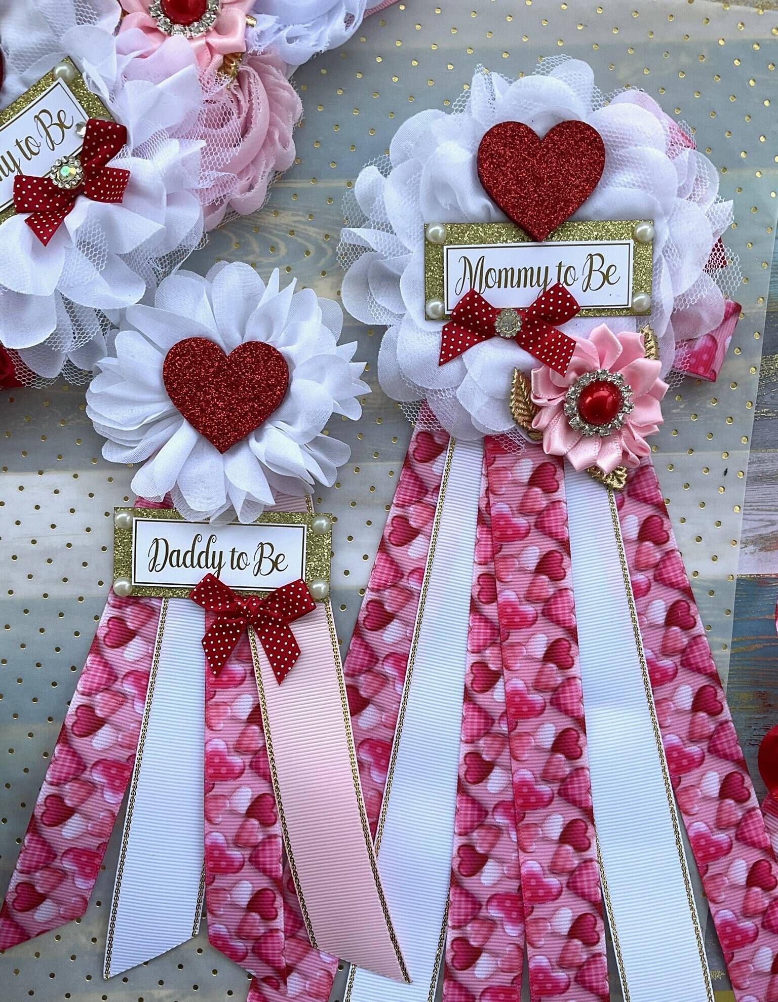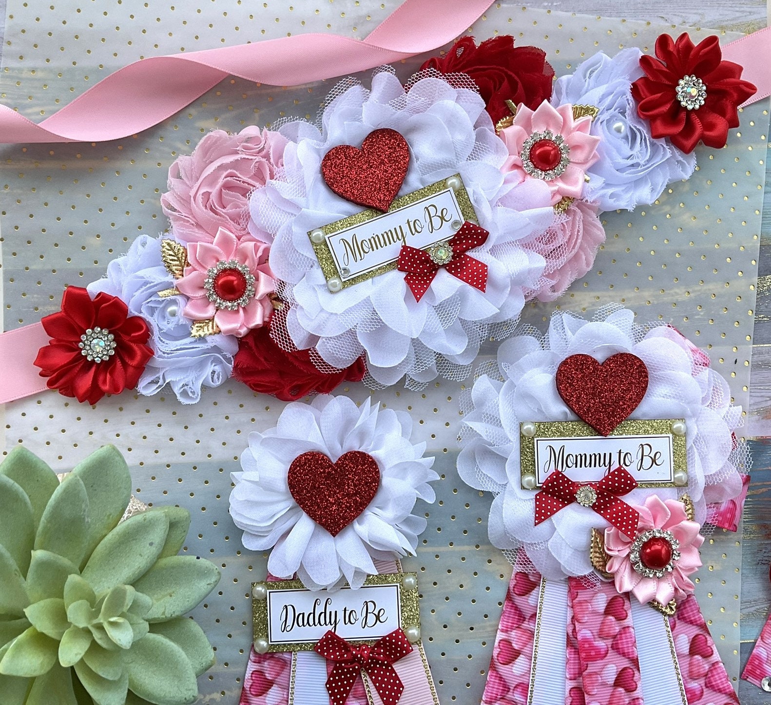 San Valentine Baby Shower, Red Pink White Heart Maternity Sash, Red Love Heart Mommy To Be Ribbon, Valentine Daddy To Be Pin, Custom