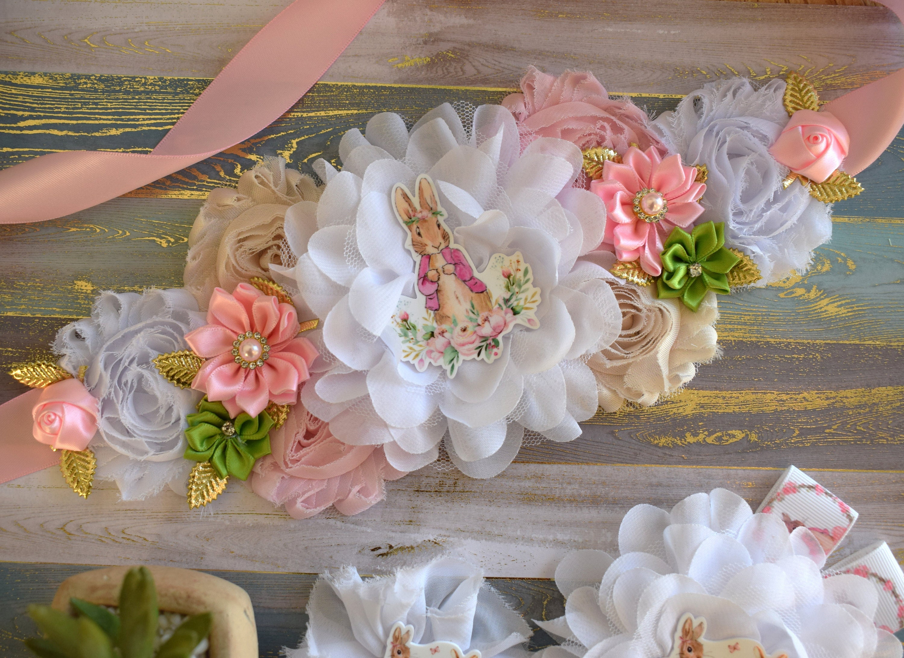 * Maternity Sash: It has eleven beautiful flowers in pink, cream, white, & green colors embellished with rhinestones and pearls. The ribbon sash is 80'' (2 meters) long.