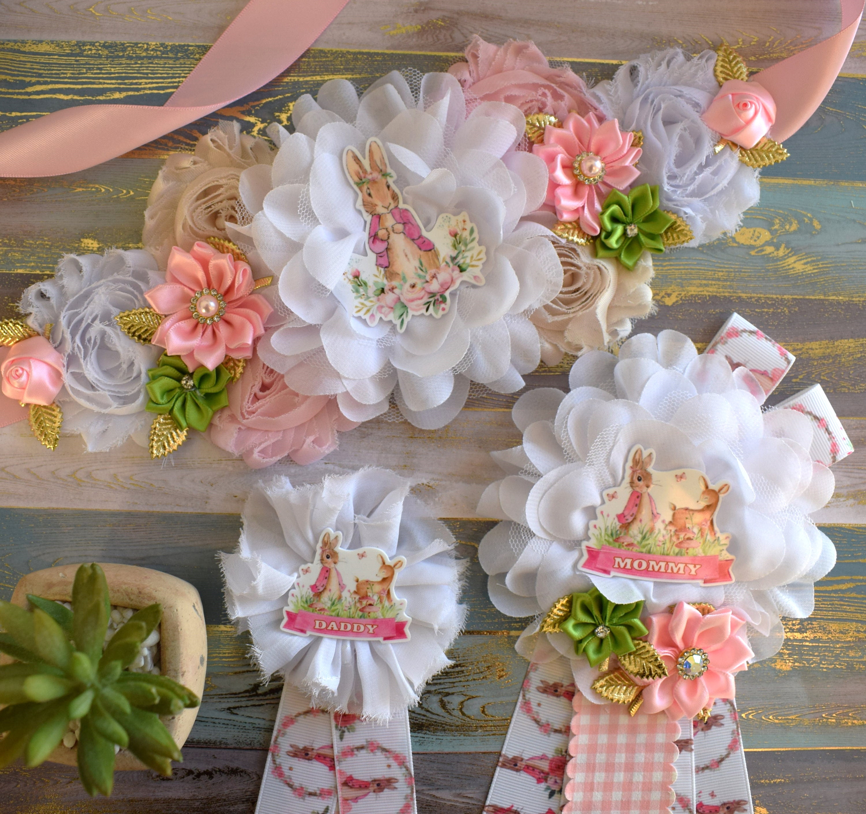 Girl Rabbit Baby Shower, Maternity Sash, Girl Rabbit Mommy to Be Pin, Pink Green Rabbit Shower, Rabbit Mommy Corsage Pin