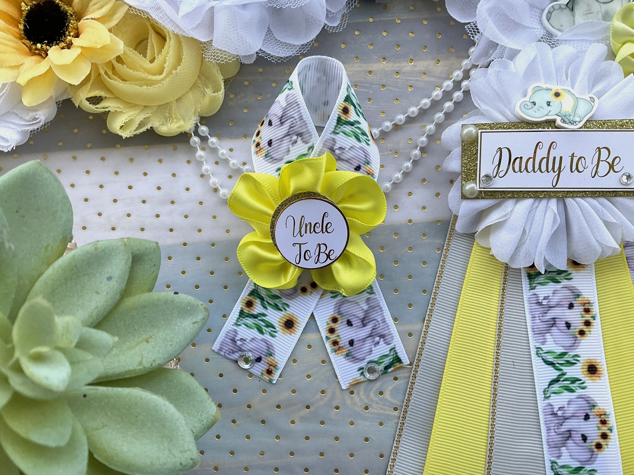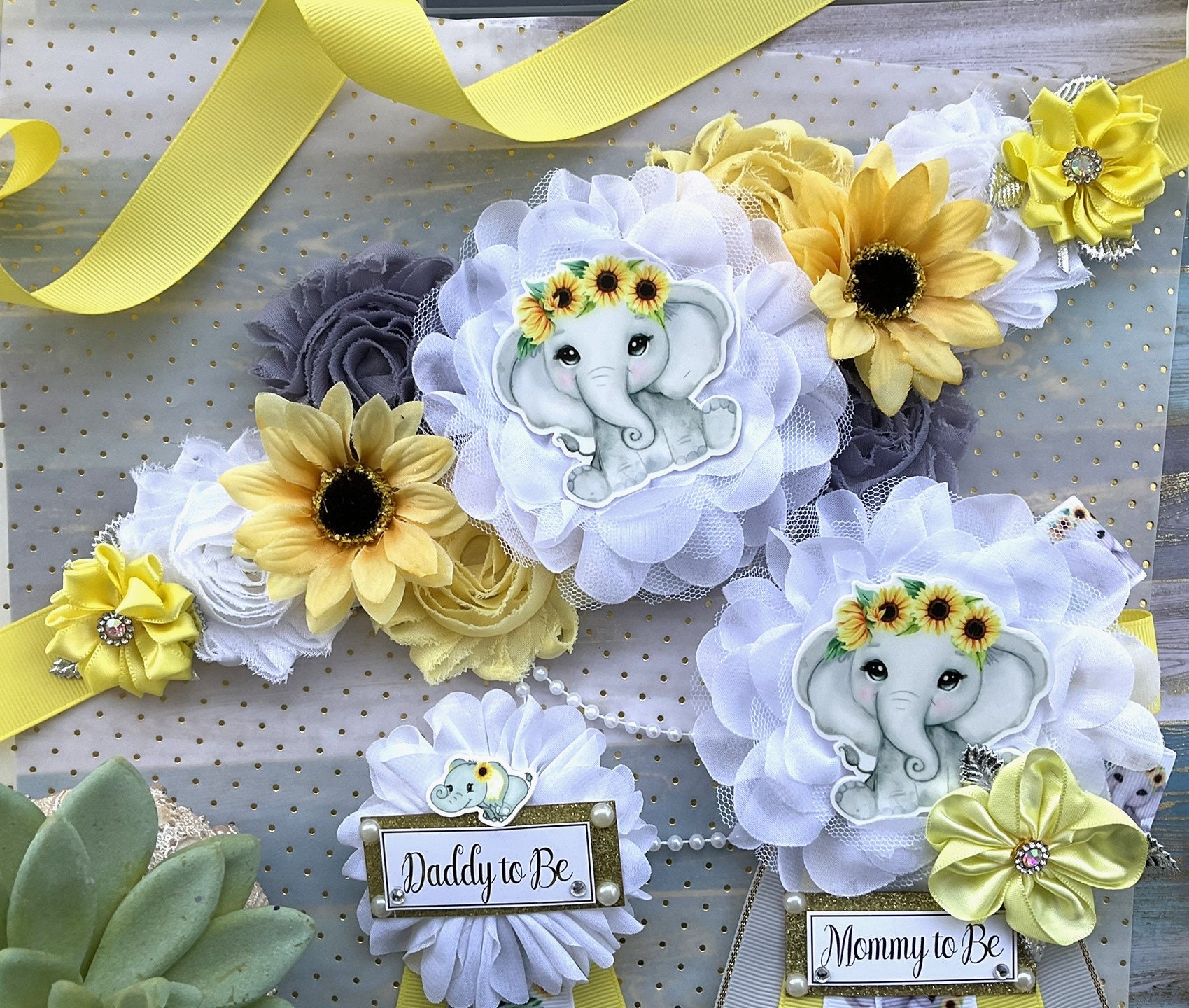 This Sunflower Elephant Baby Shower Theme Sash & Pin Set were made especially for a Baby Shower or a Photo Prop.