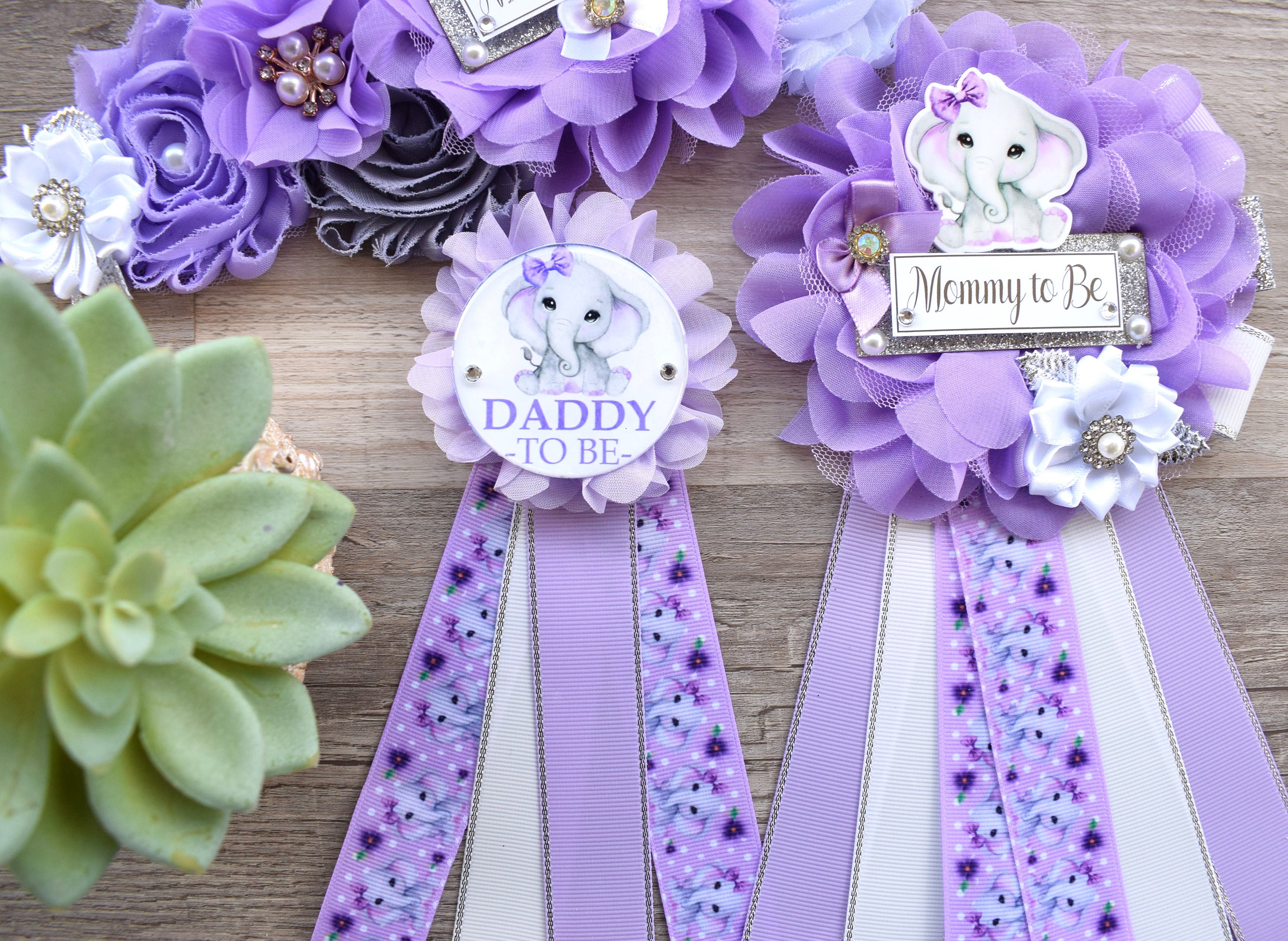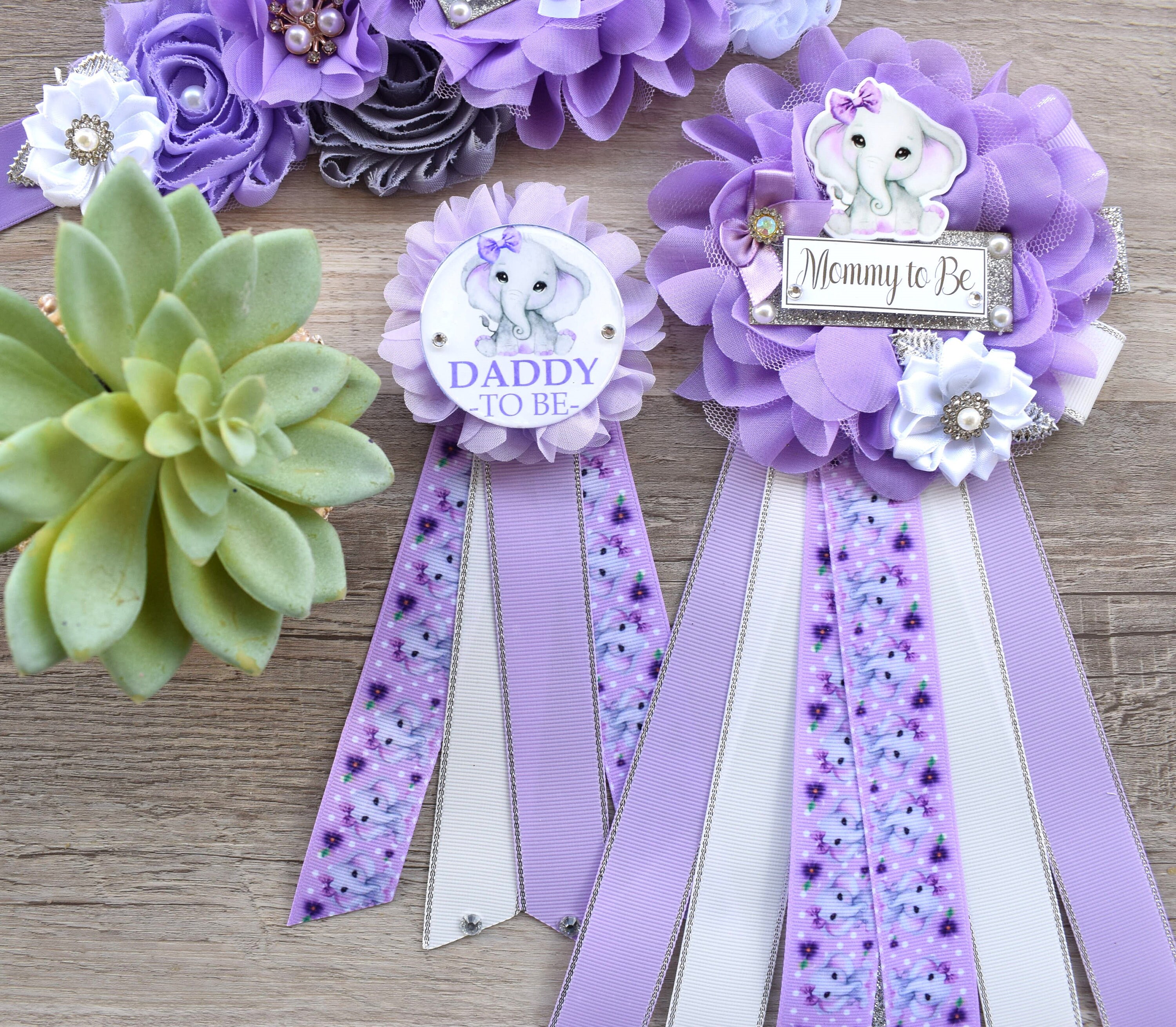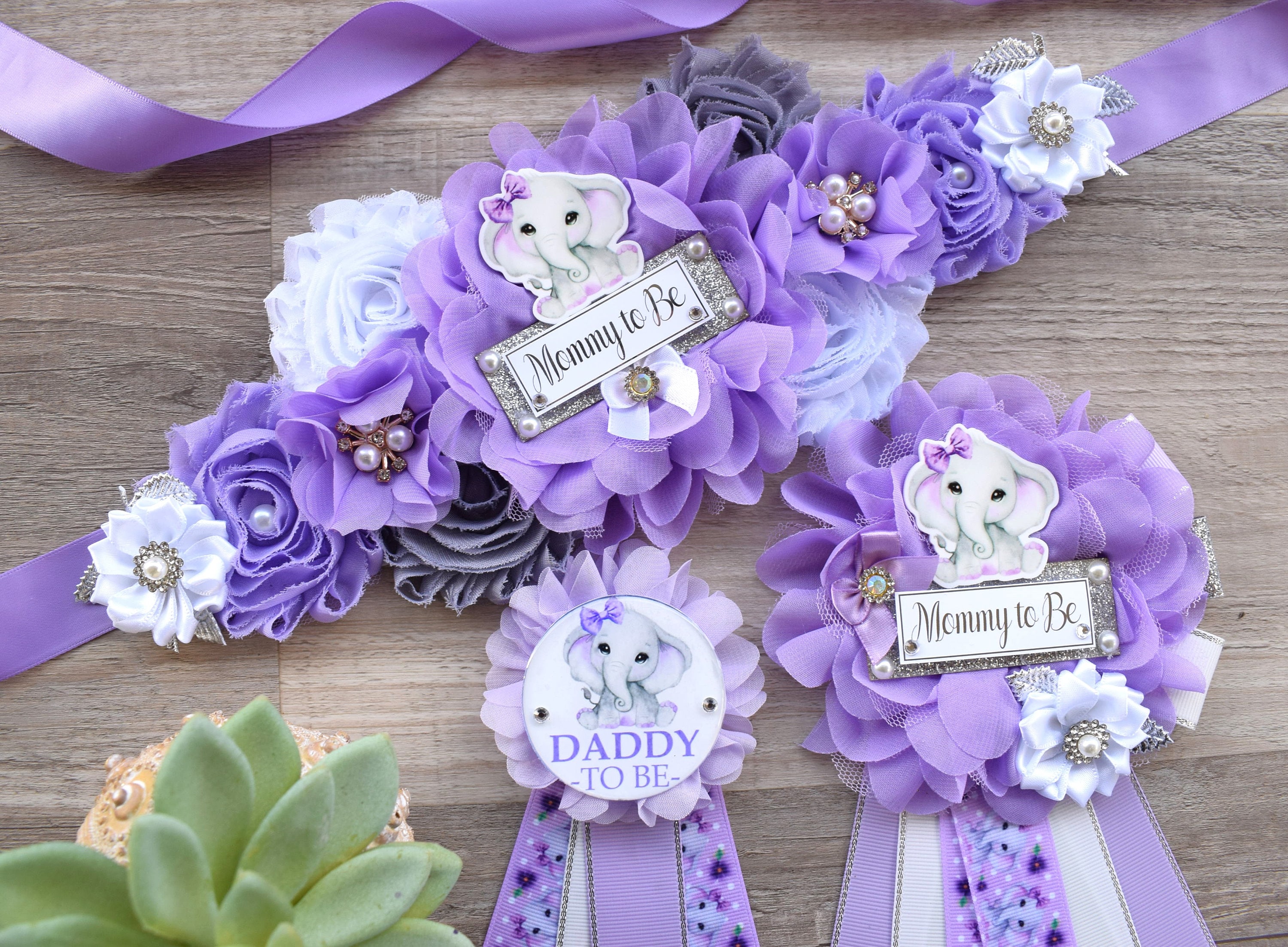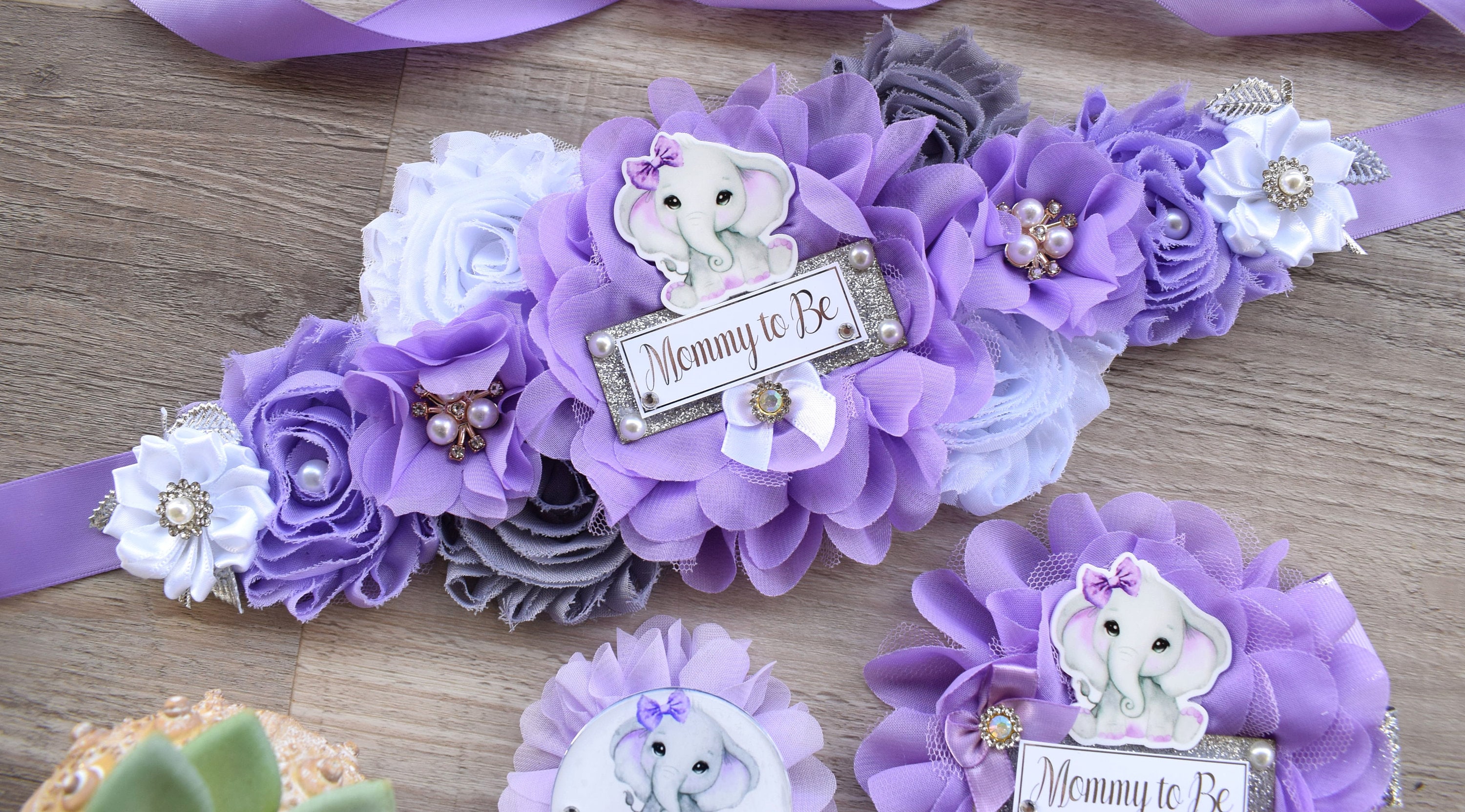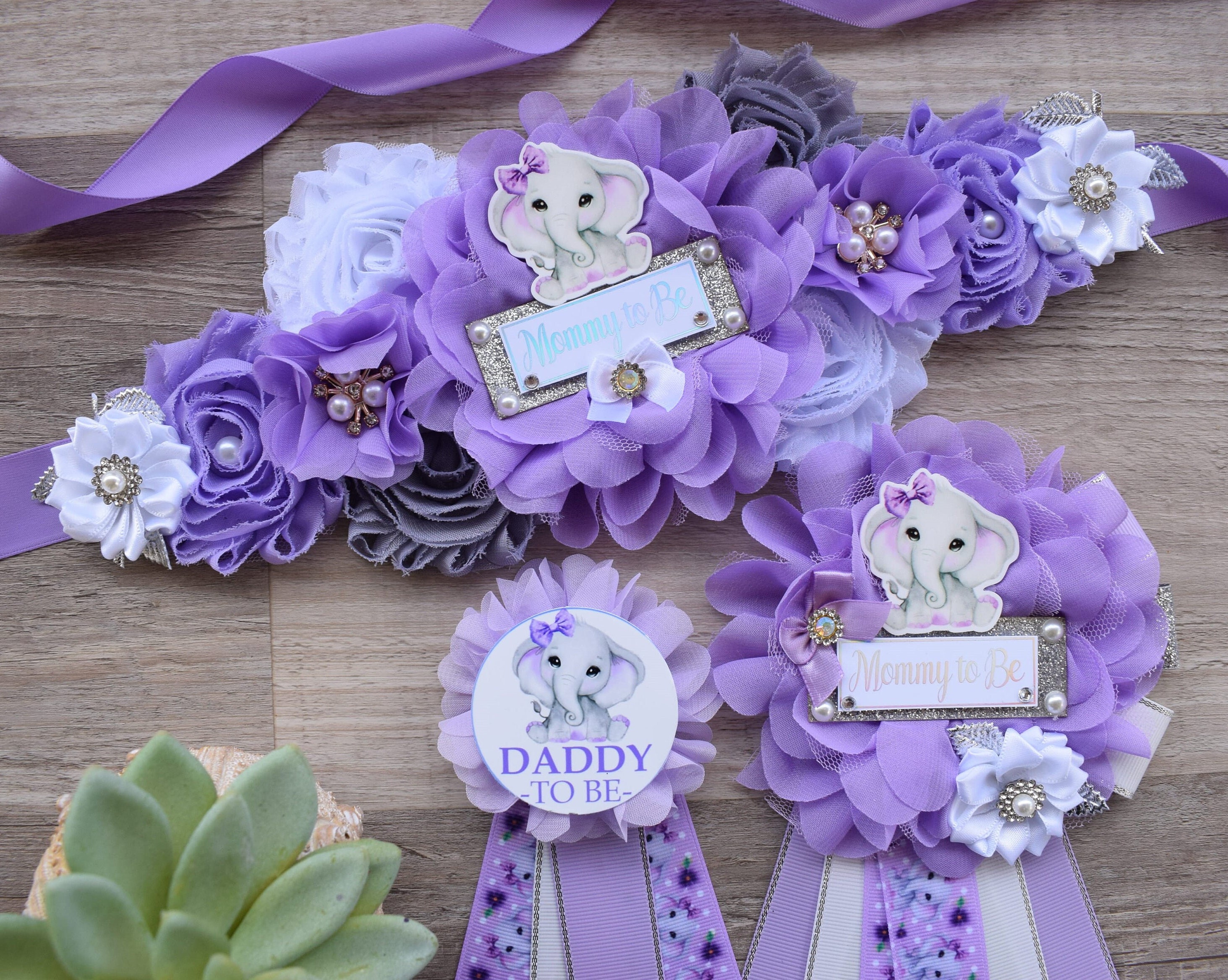 This Lavender Grey Elephant Sash & Pin Set was made especially for a Baby Shower or a Photo Prop.