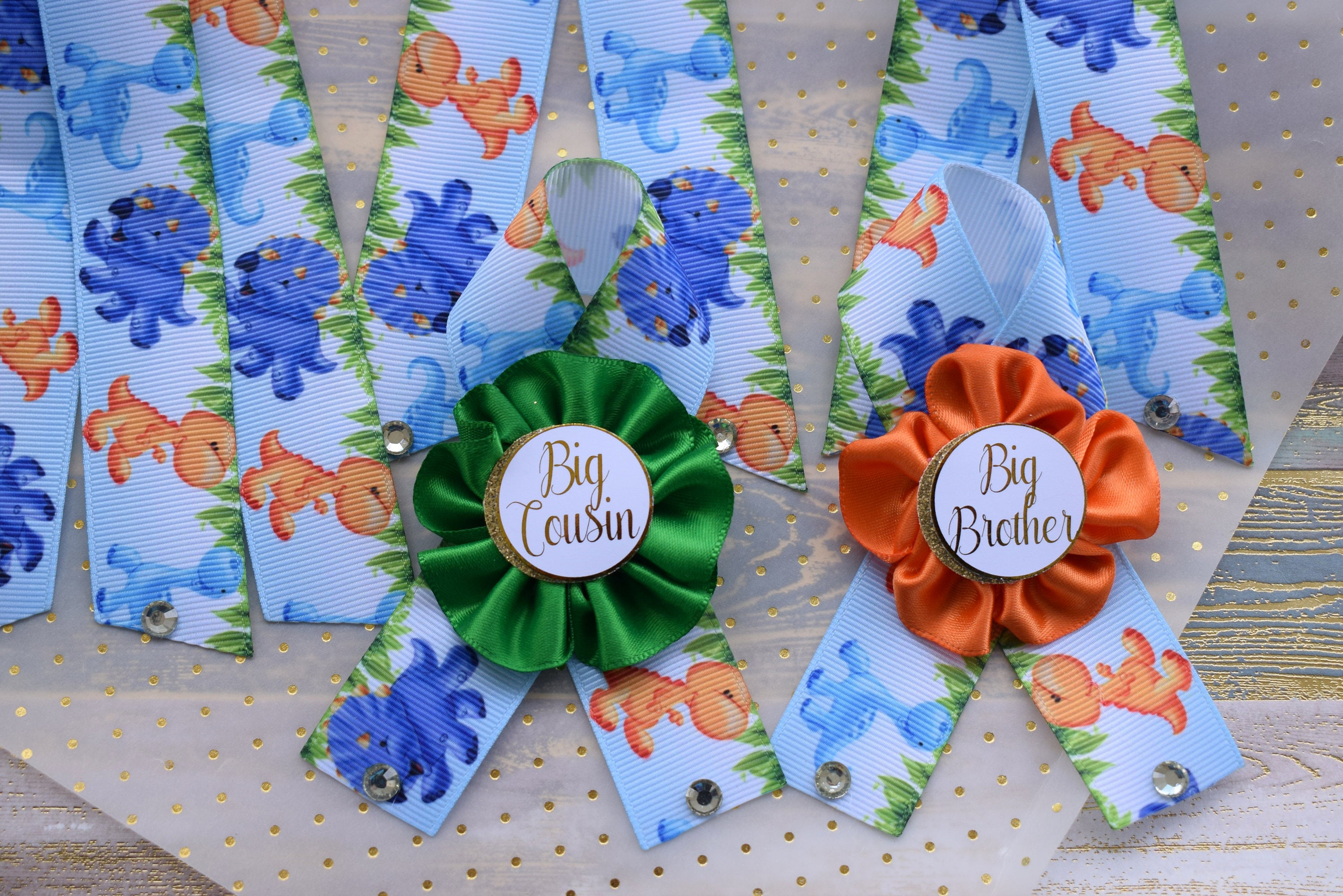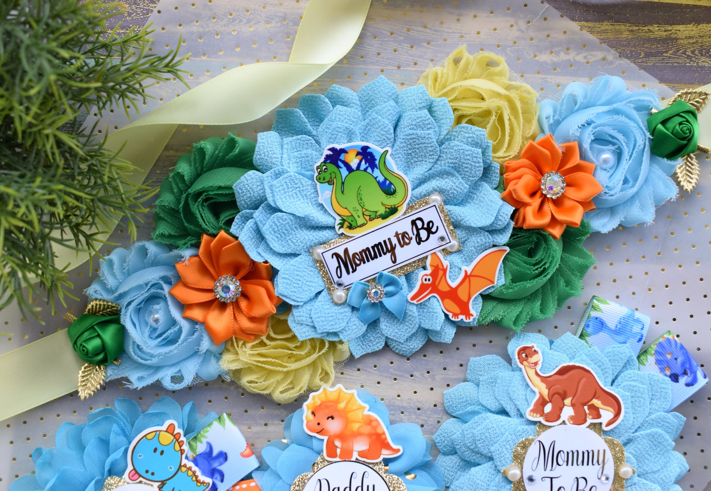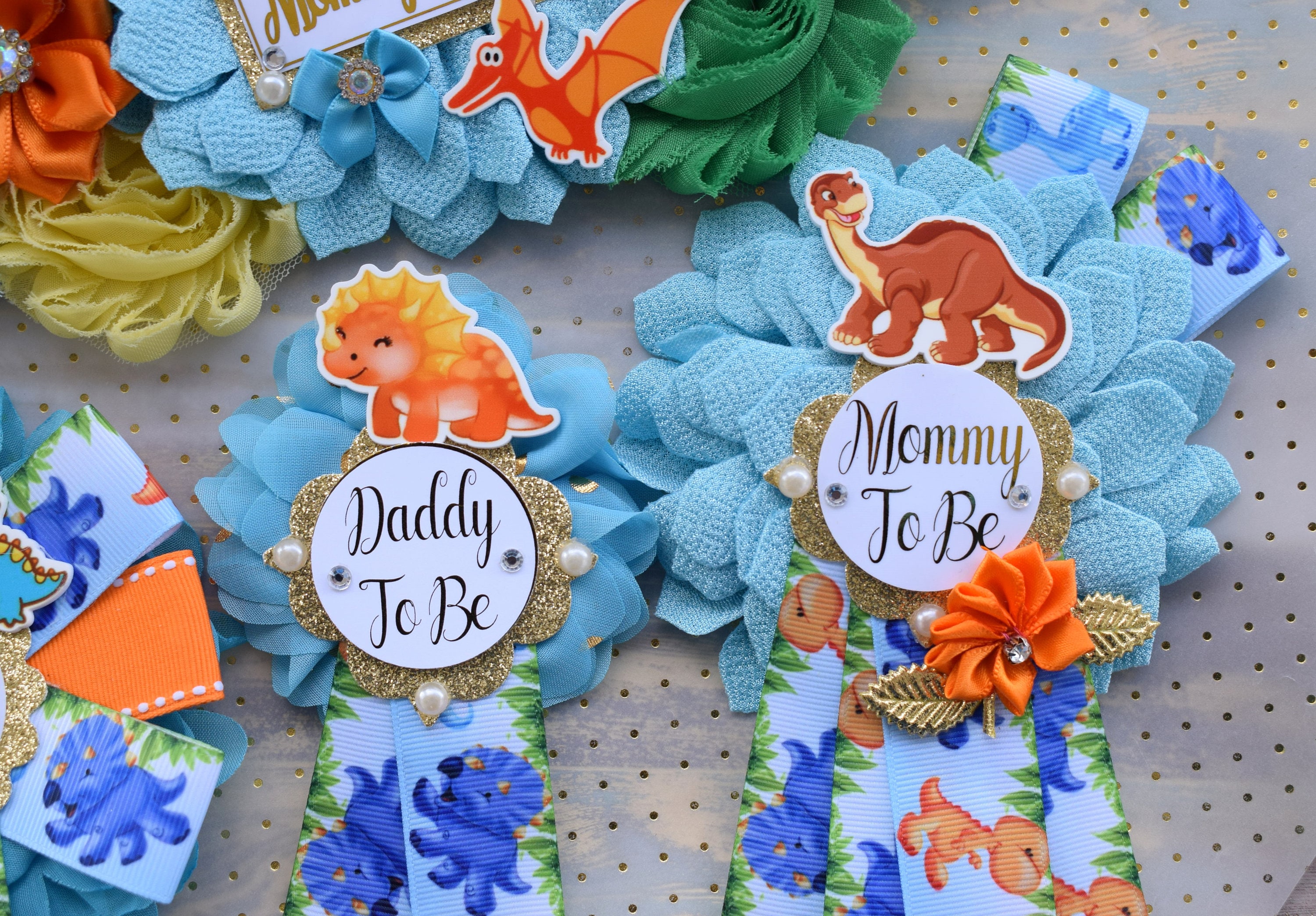 Dinosaur Baby Shower, Dinosaur Corsage Pin Set, Dinosaur Mommy to Be, Dinosaur Daddy to Be, Mamasaurus, Dinosaur Orange Green Blue, Custom