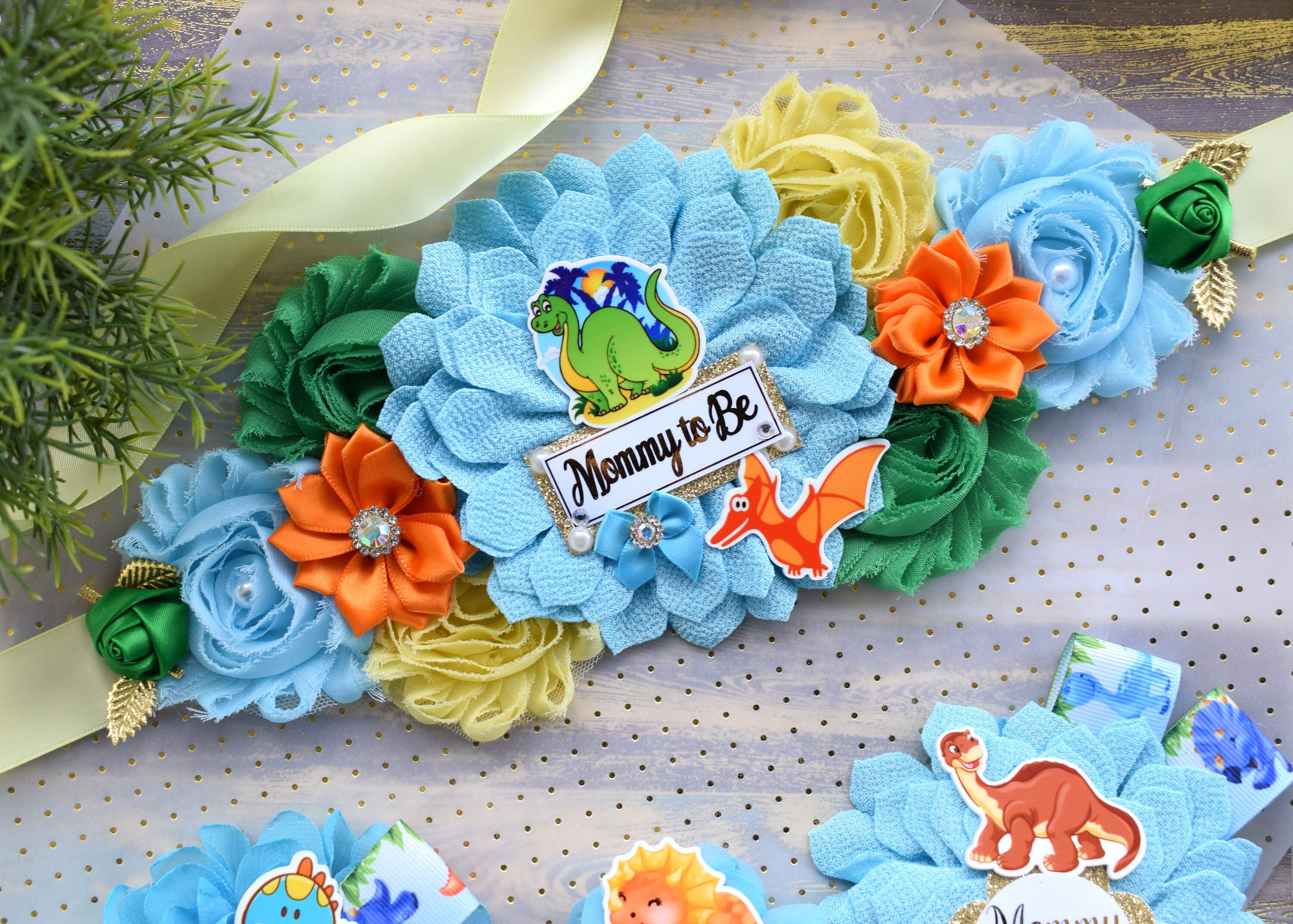 * Maternity Sash: It has nine beautiful flowers in Blue, Green, & Orange colors embellished with rhinestones and pearls. The ribbon sash is 80'' (2 meters) long.
