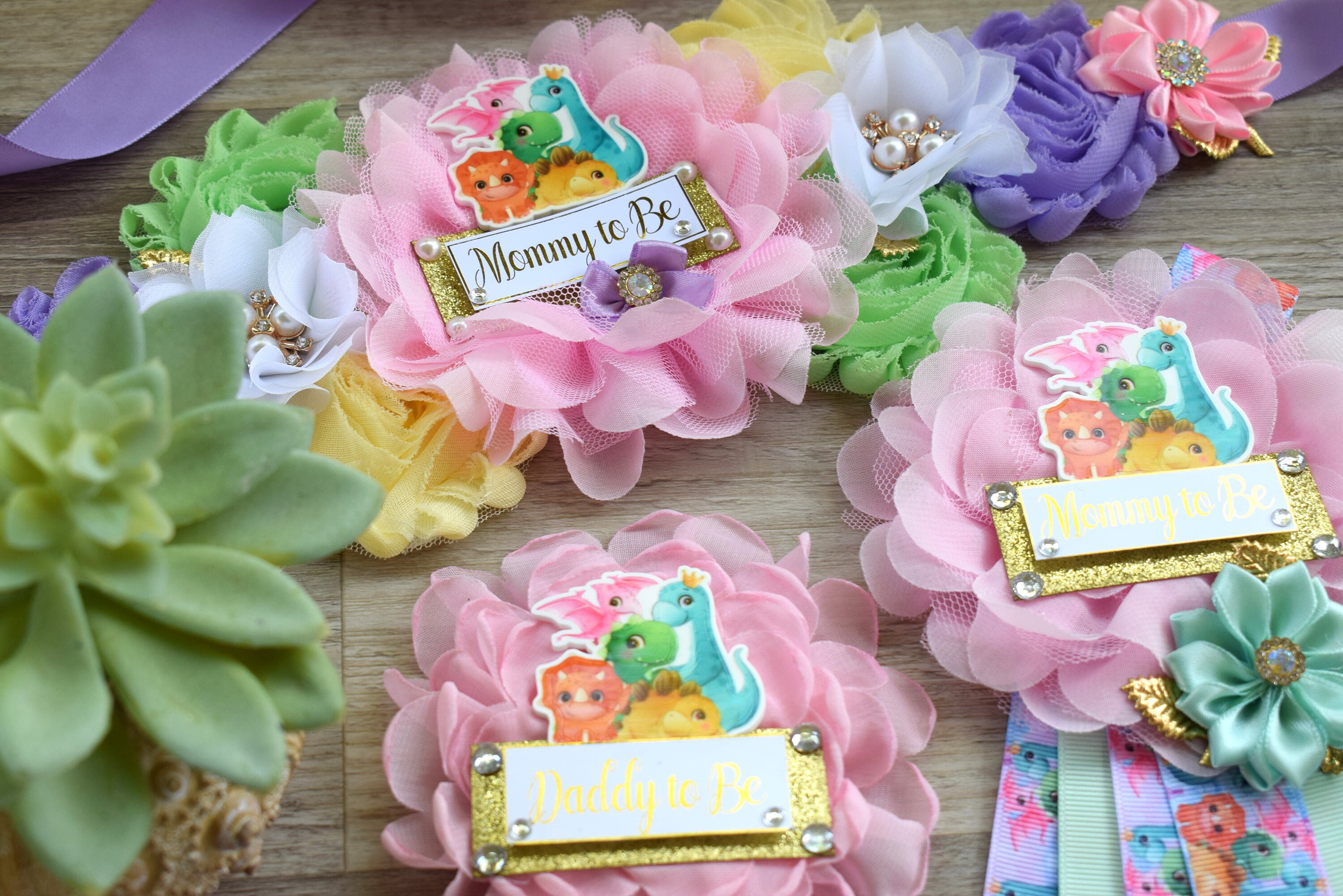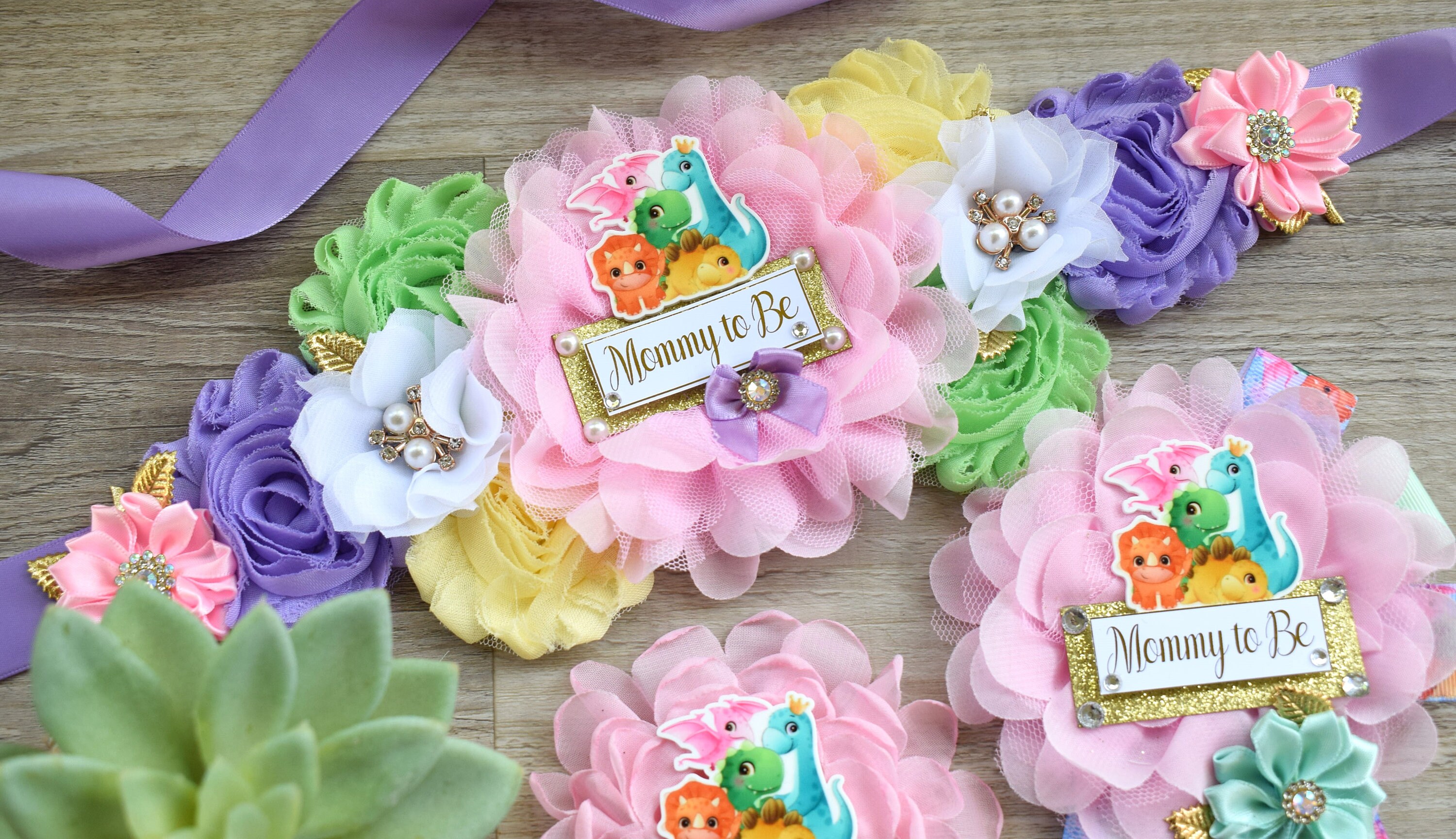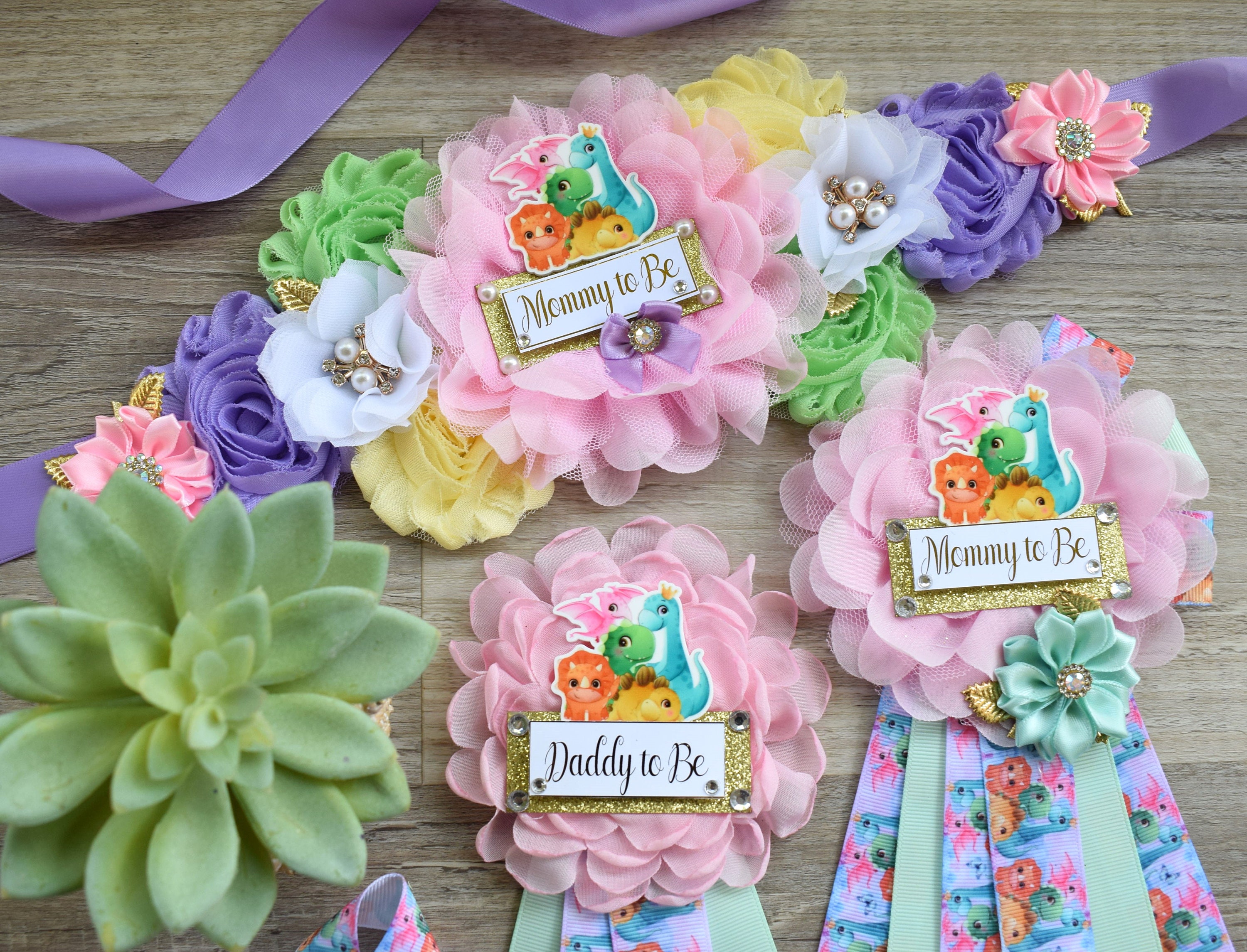 Girl Dinosaur Baby Shower, Pink Lavender Dinosaur Corsage Pin Set, Dinosaur Mommy to Be Sash, Dinosaur Mommy Daddy to Be, Dinosaur Shower