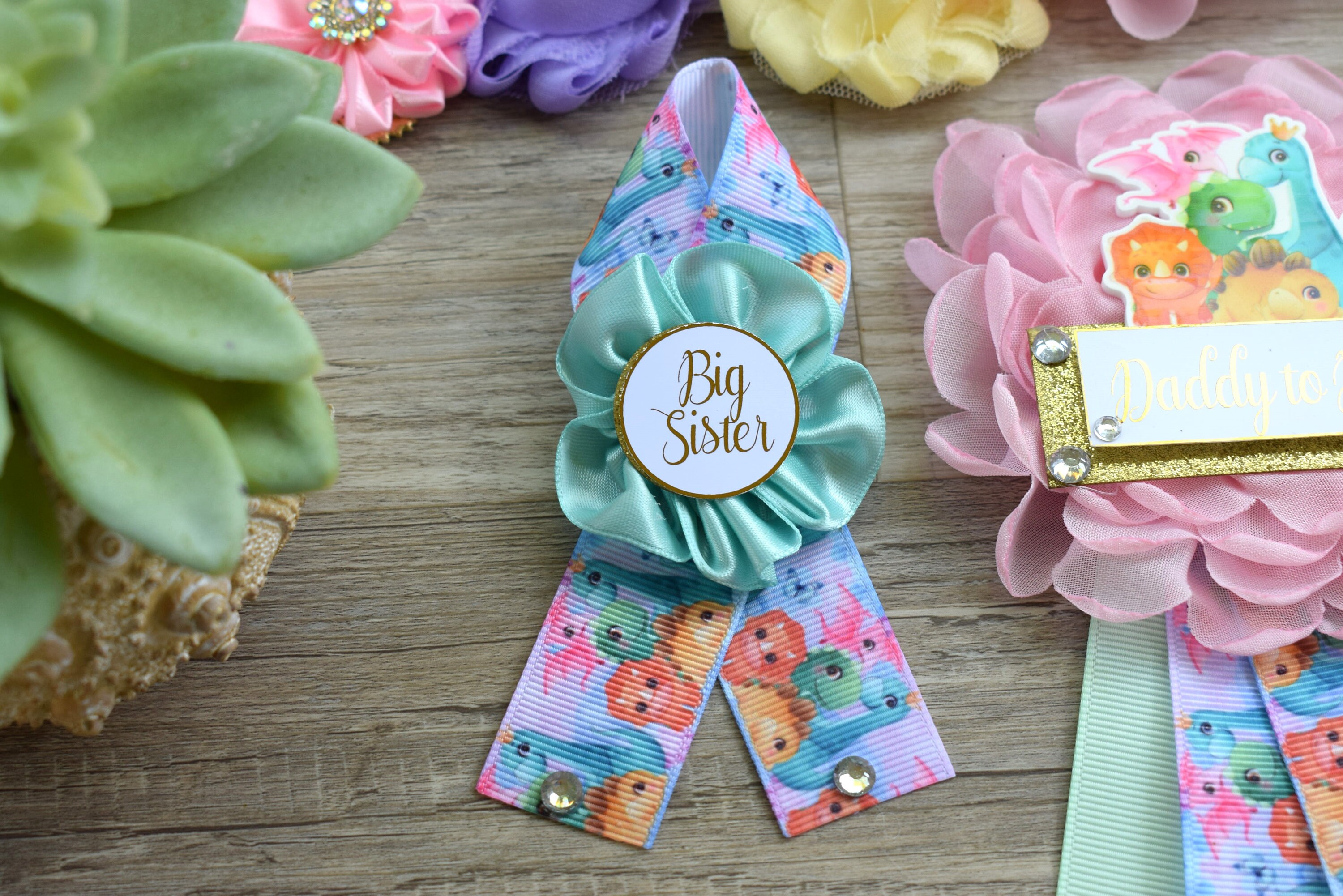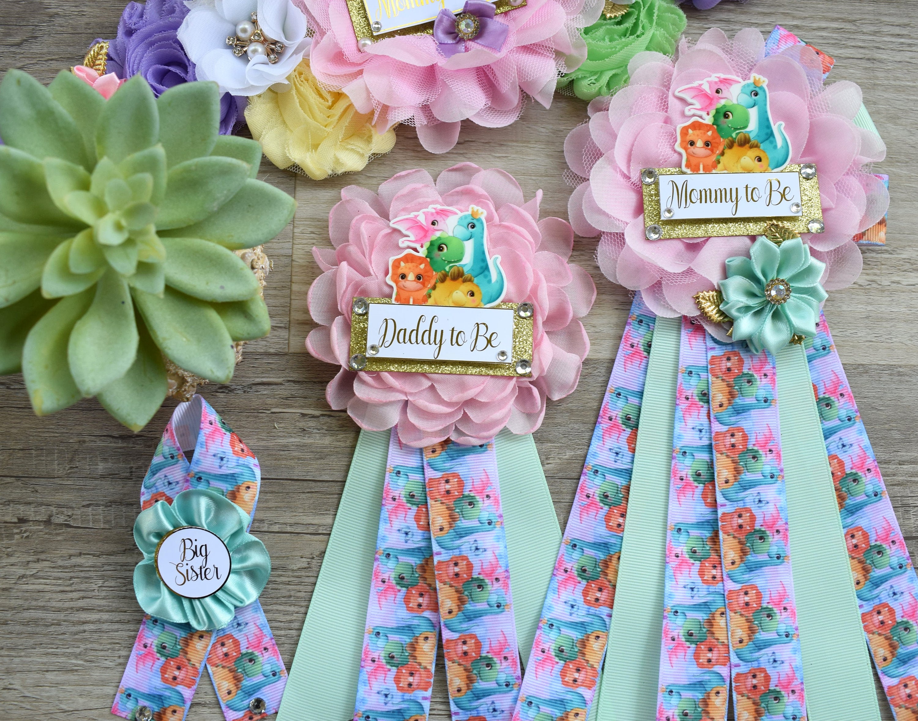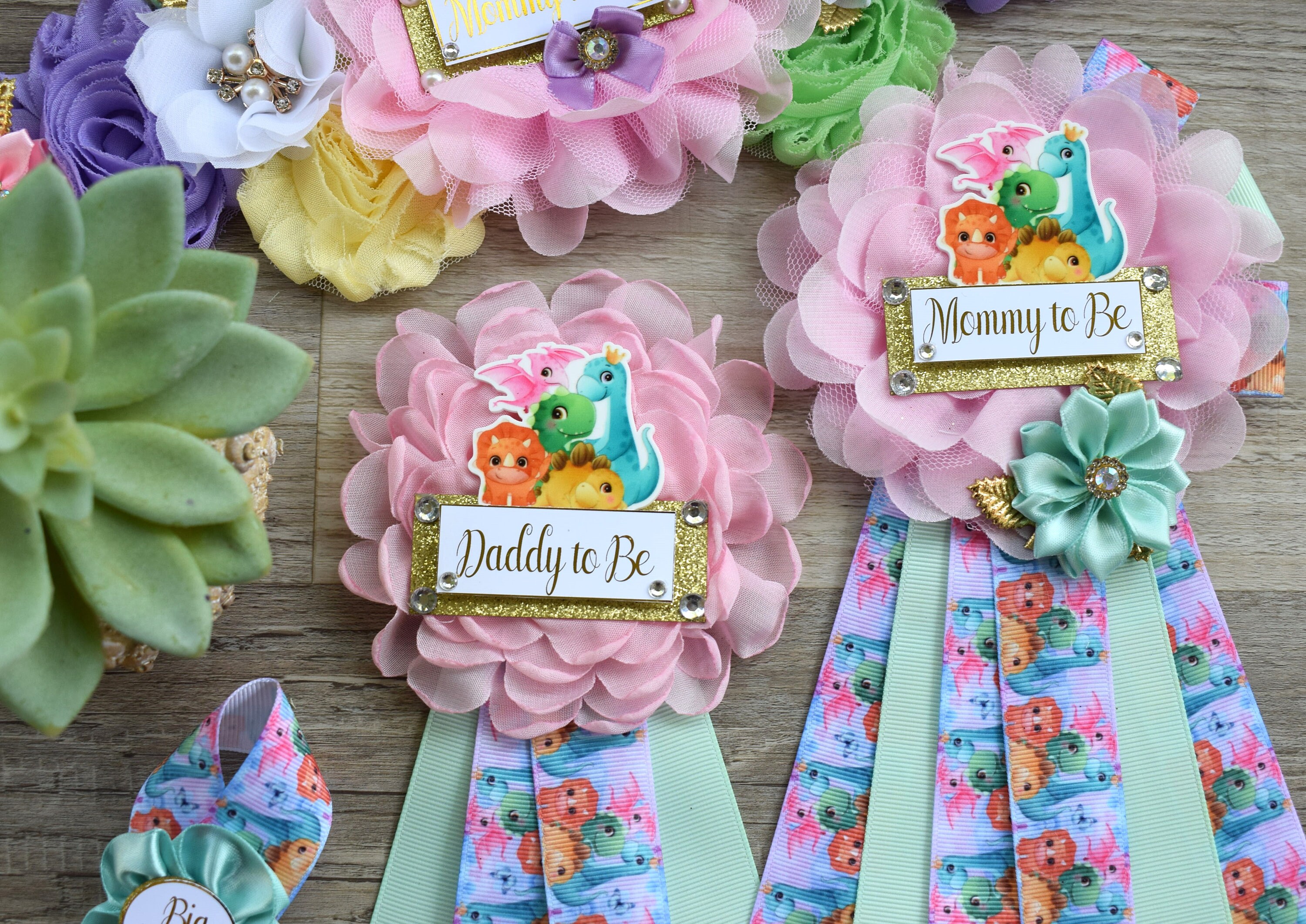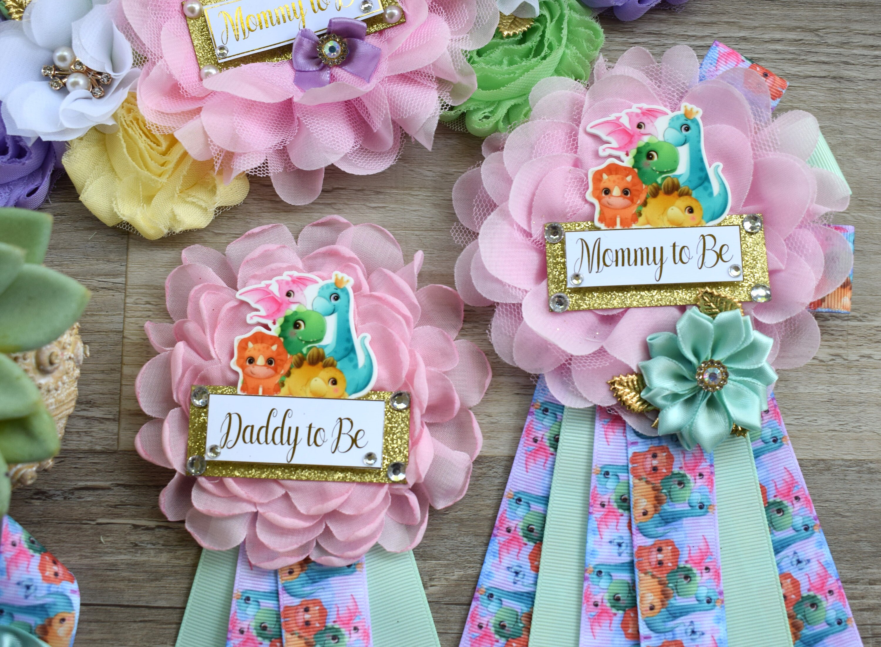 Girl Dinosaur Baby Shower, Pink Lavender Dinosaur Corsage Pin Set, Dinosaur Mommy to Be Sash, Dinosaur Mommy Daddy to Be, Dinosaur Shower